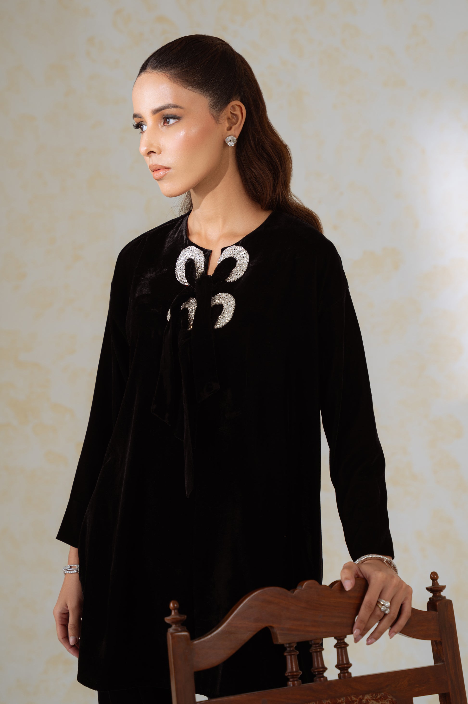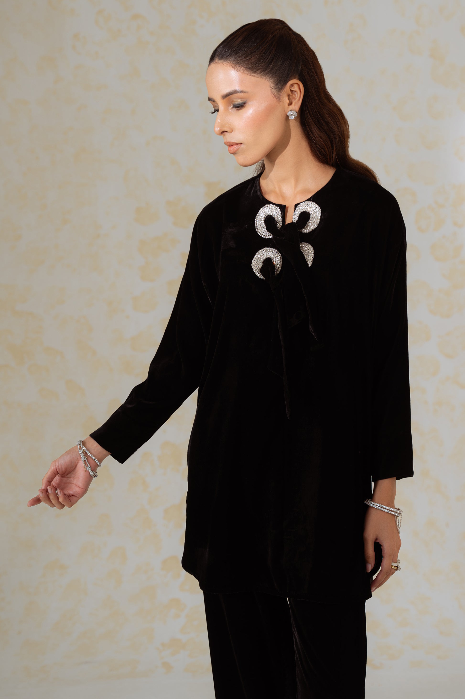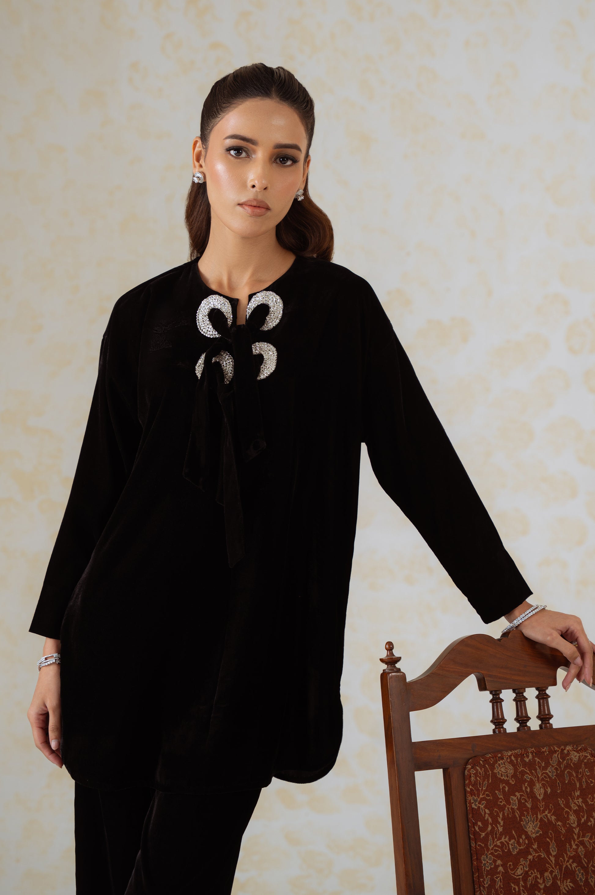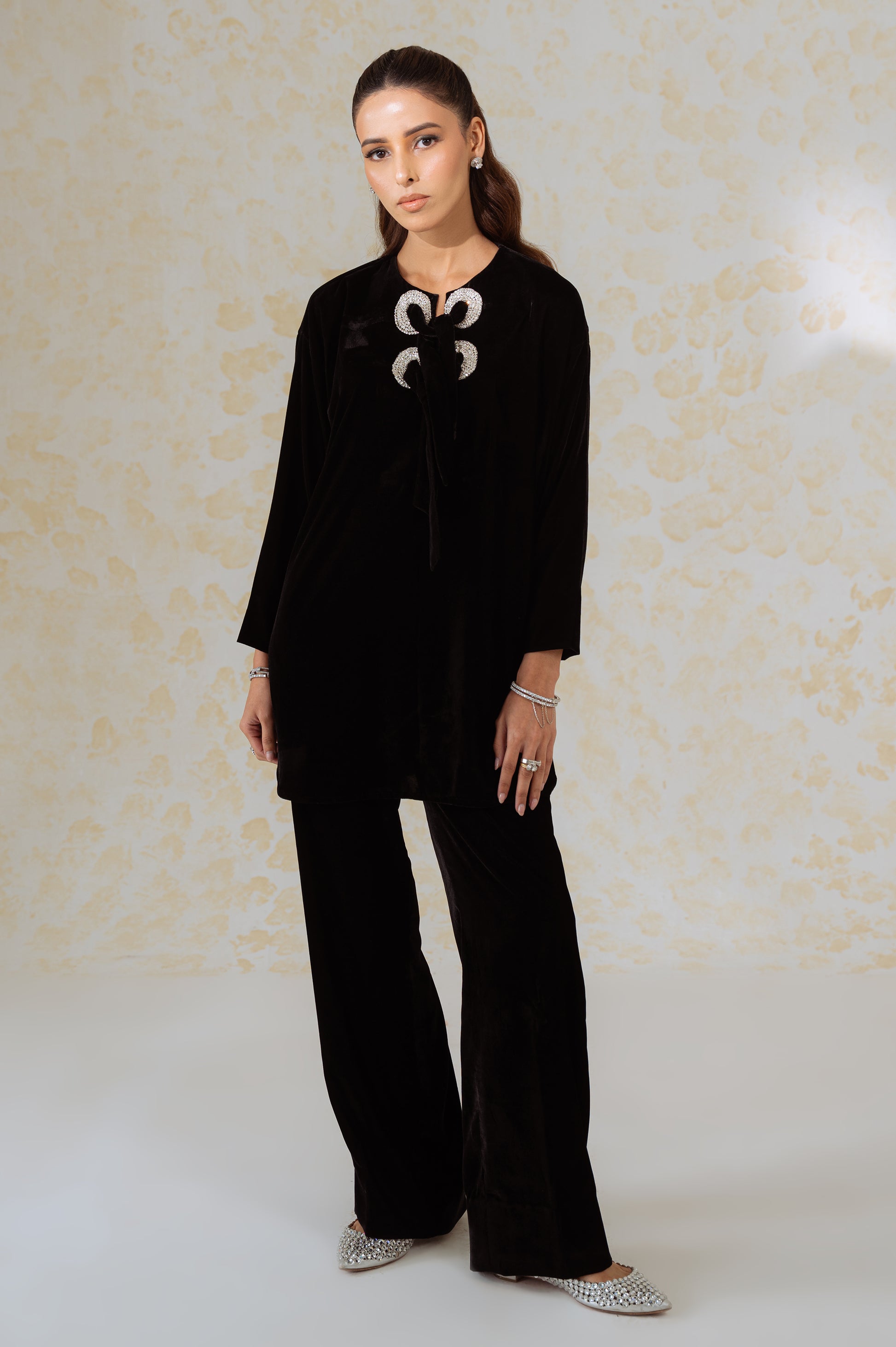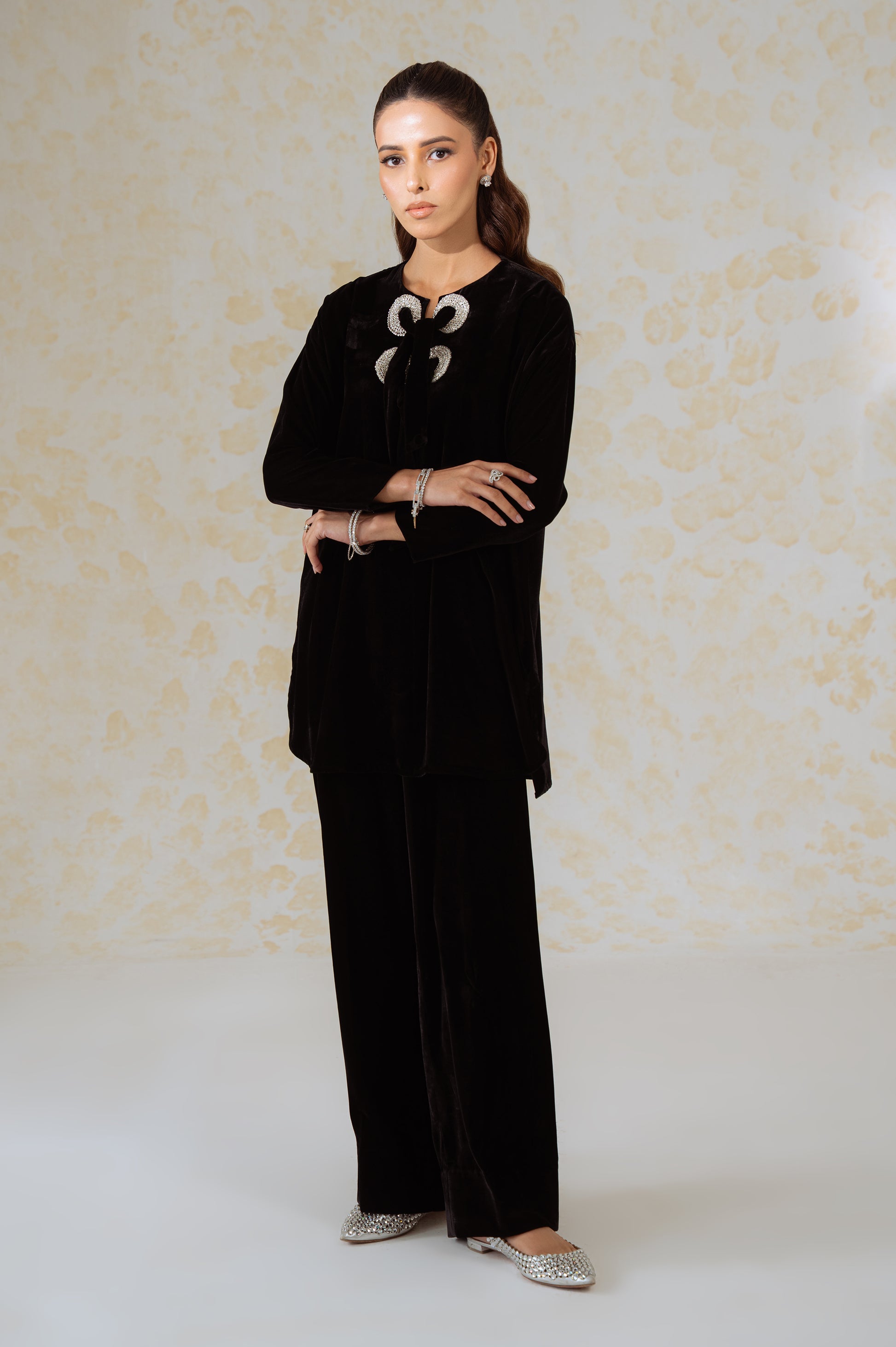 A jet-black two-piece ensemble crafted from luxe velvet, featuring a straight-cut kurta adorned with exquisite hand embroidery. The intricate design showcases refined stone work,