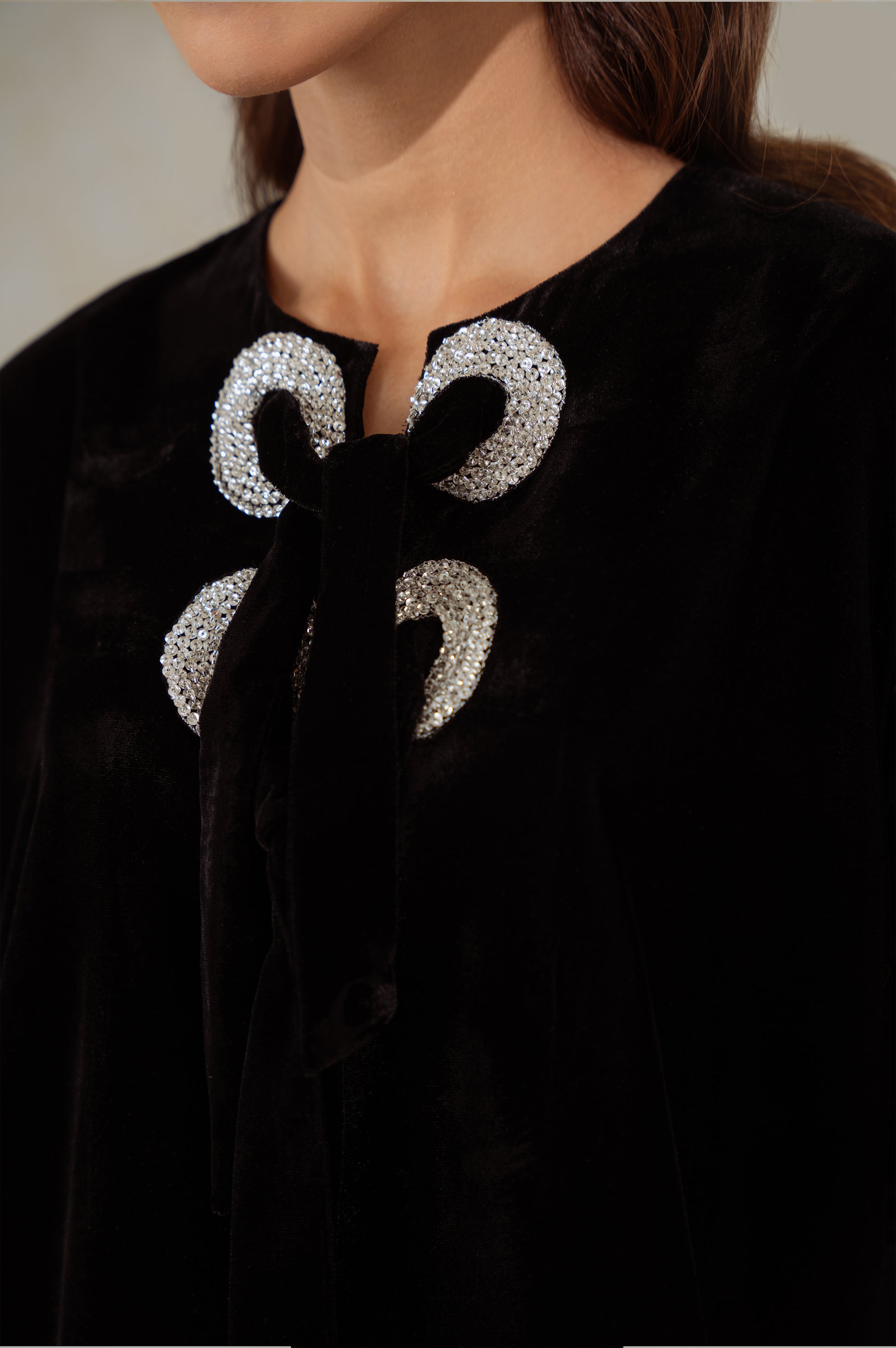 including delicate stones and kat dana detailing, that adds a subtle shimmer to the rich fabric. Paired with wide-leg velvet trousers, this ensemble exudes refined elegance and timeless sophistication, perfect for evening soirées and festive gatherings.