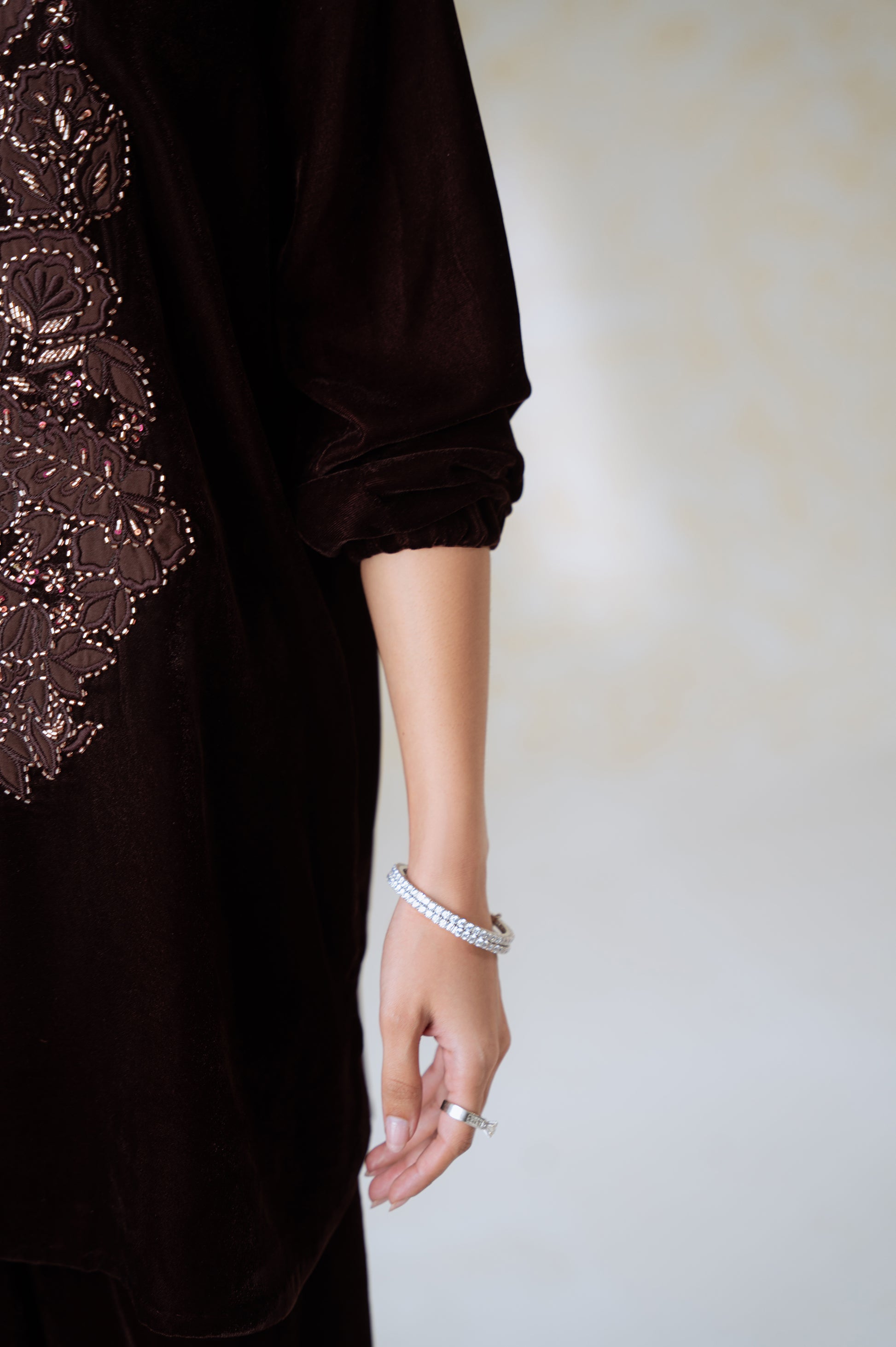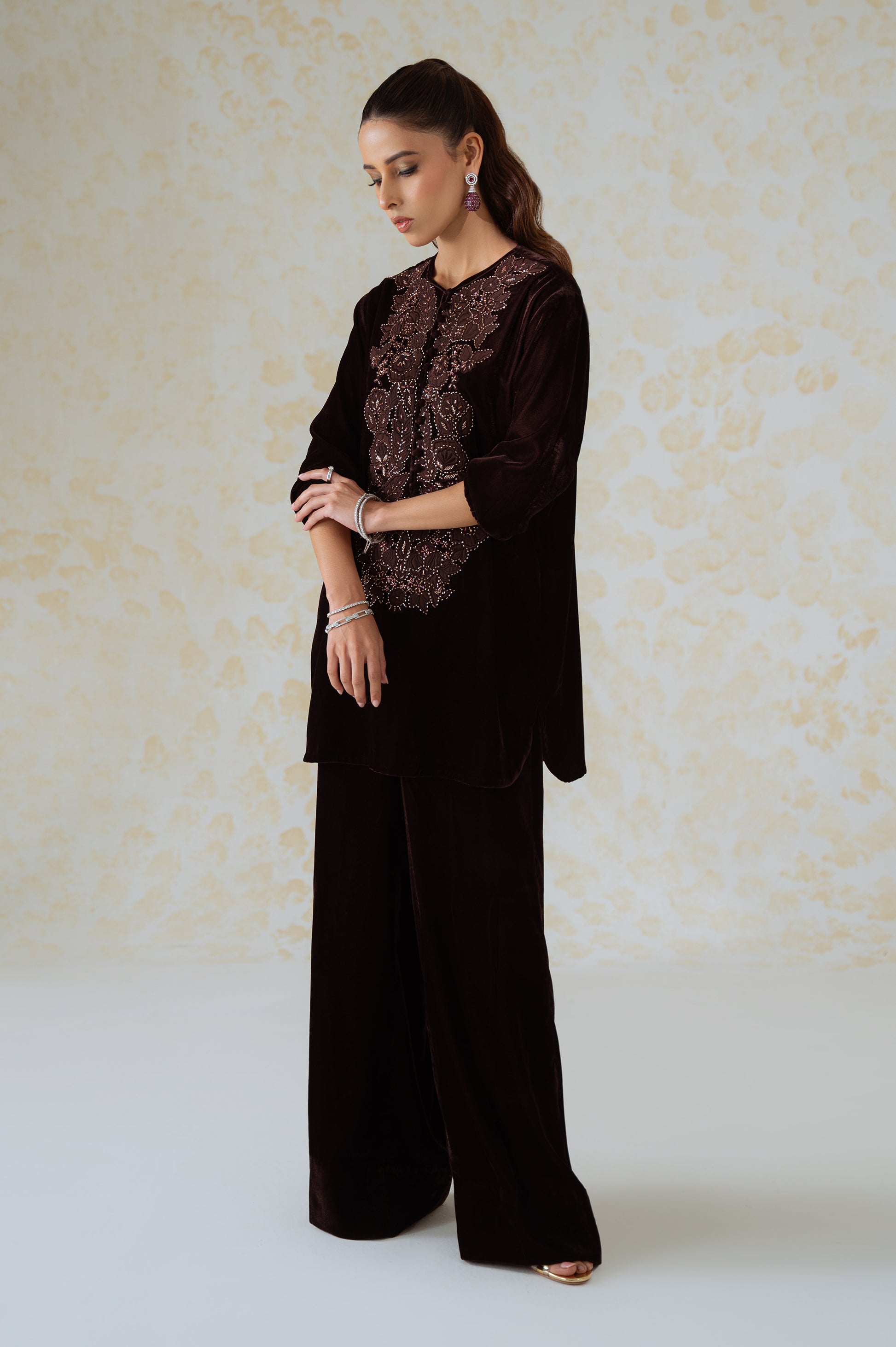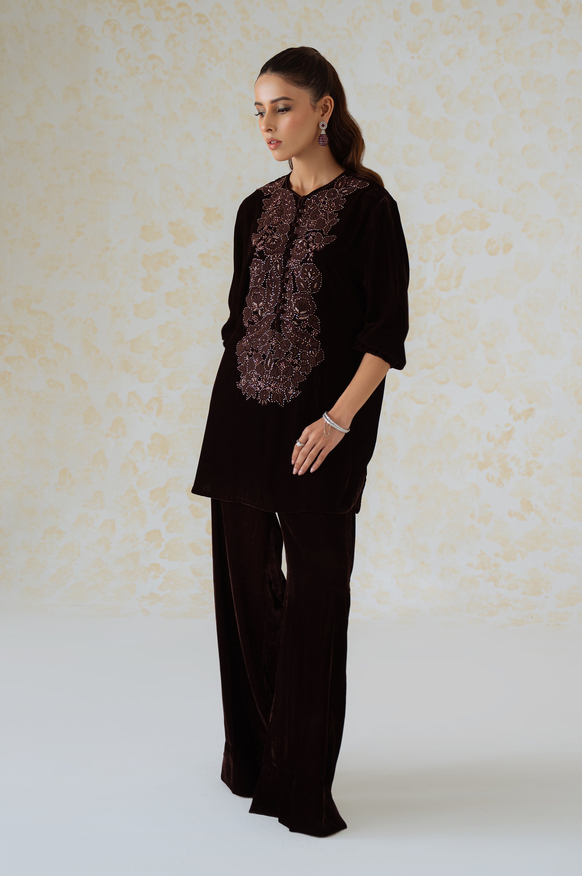 A burgundy two-piece ensemble crafted from luxe velvet, featuring a straight-cut kurta adorned with intricate applique work and zardozi hand embellishments. The neckline pattern is inspired by traditional zari embroidery designs and is accented with delicate fabric buttons along the slit. Paired with wide-leg velvet trousers, this outfit embodies understated opulence and timeless grace, perfect for festive and formal evenings.