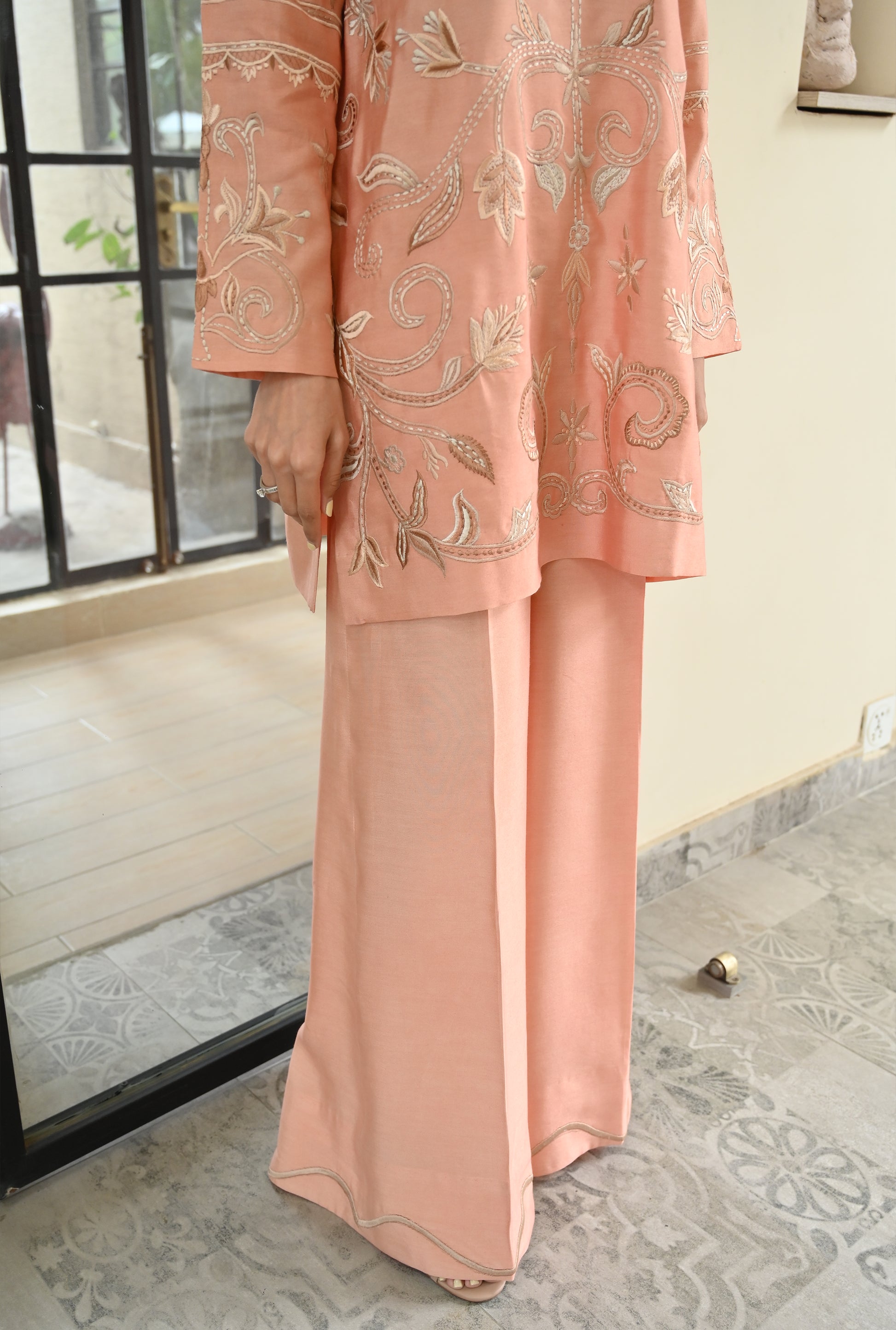 This 2-piece set comes in a soft peach hue, tailored from Pure Kora Silk. The fabric has a rich, semi-sheer texture that gives it a crisp yet elegant fall, making it perfect for formal wear. The shirt comes with a slit neckline & beautiful floral threadwork that covers the front and runs along the sleeves, giving it a high-end, artisanal feel. Paired with matching wide-leg trousers finished with a subtle scalloped embroidery, this ensemble is designed for those who appreciate fine detail and a clean, coordinated look.