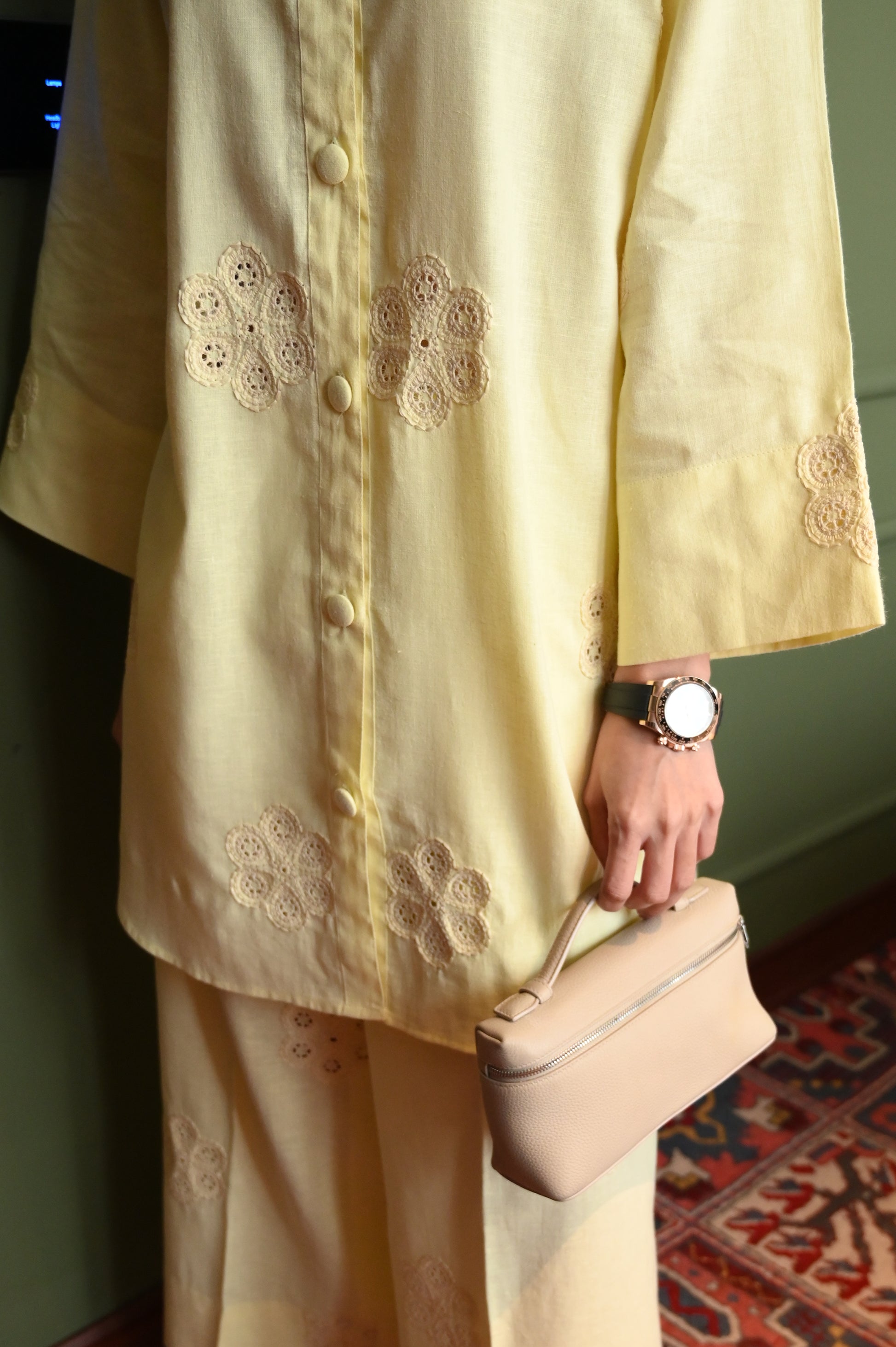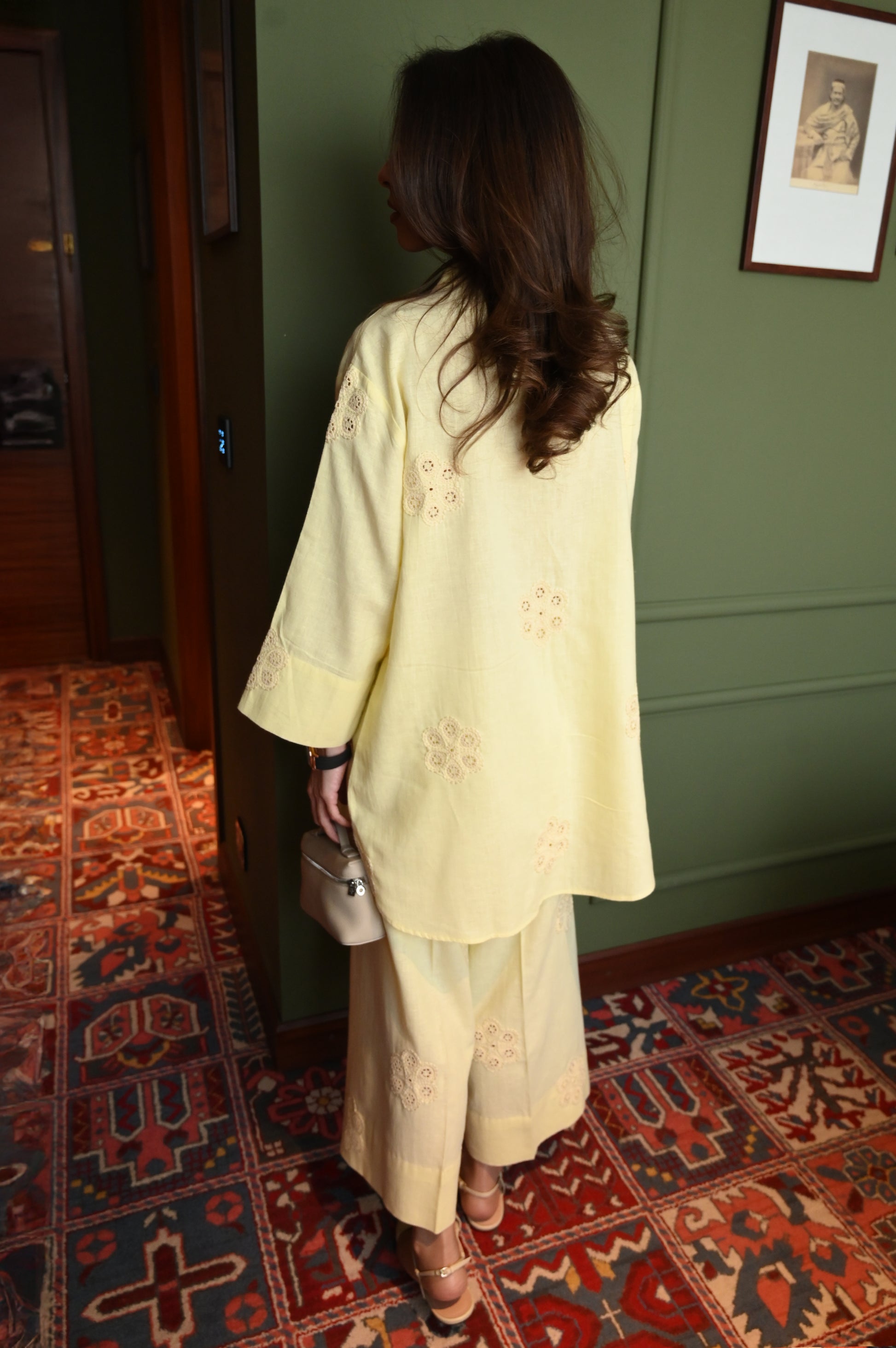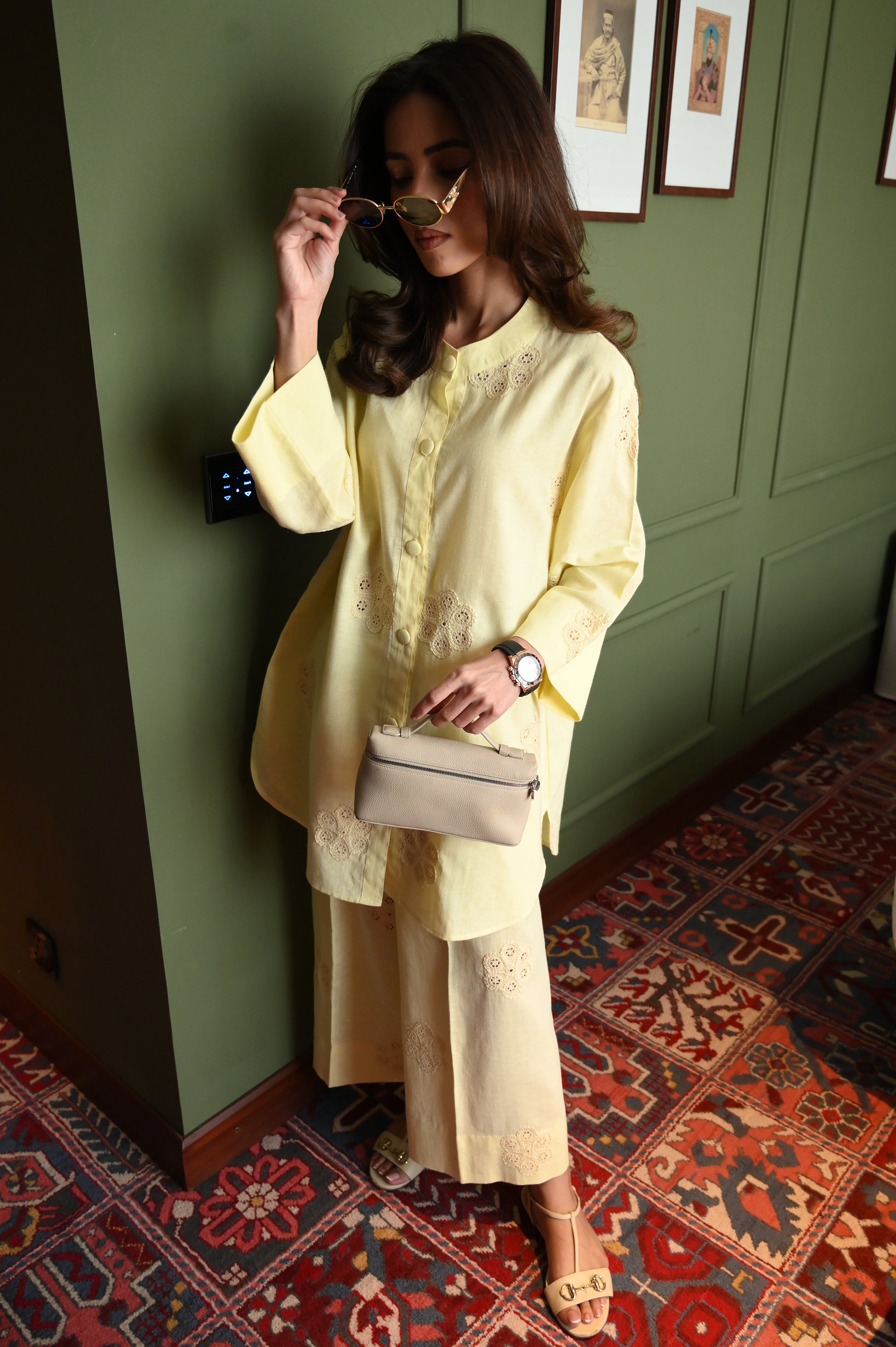 A soft butter yellow two-piece outfit featuring a straight, button-down kurta adorned with delicate cutwork embroidery on the front, sleeves, and hem. It is paired with wide-leg trousers, also detailed with matching embroidery, creating a light and elegant look perfect for daily wear.