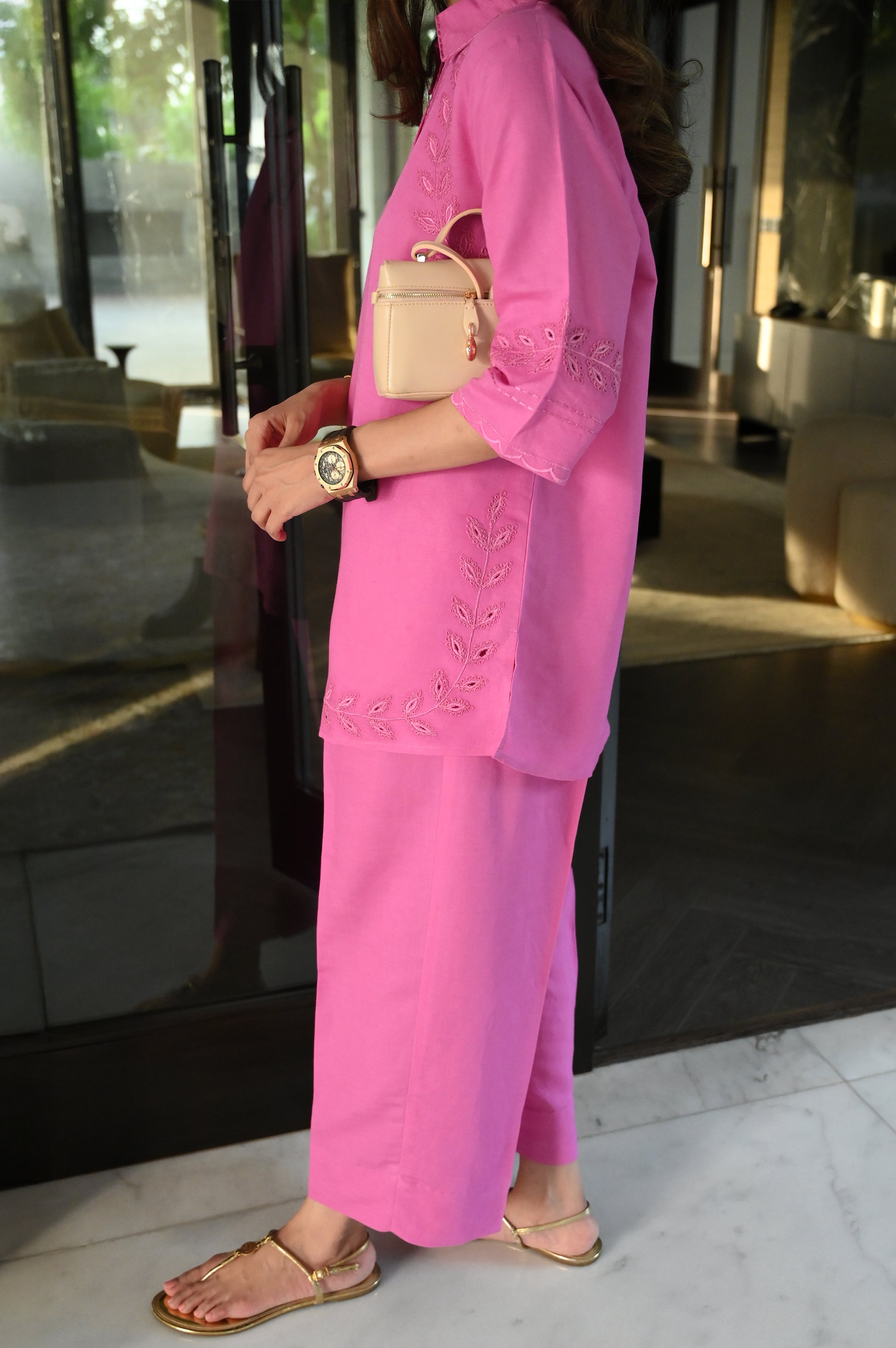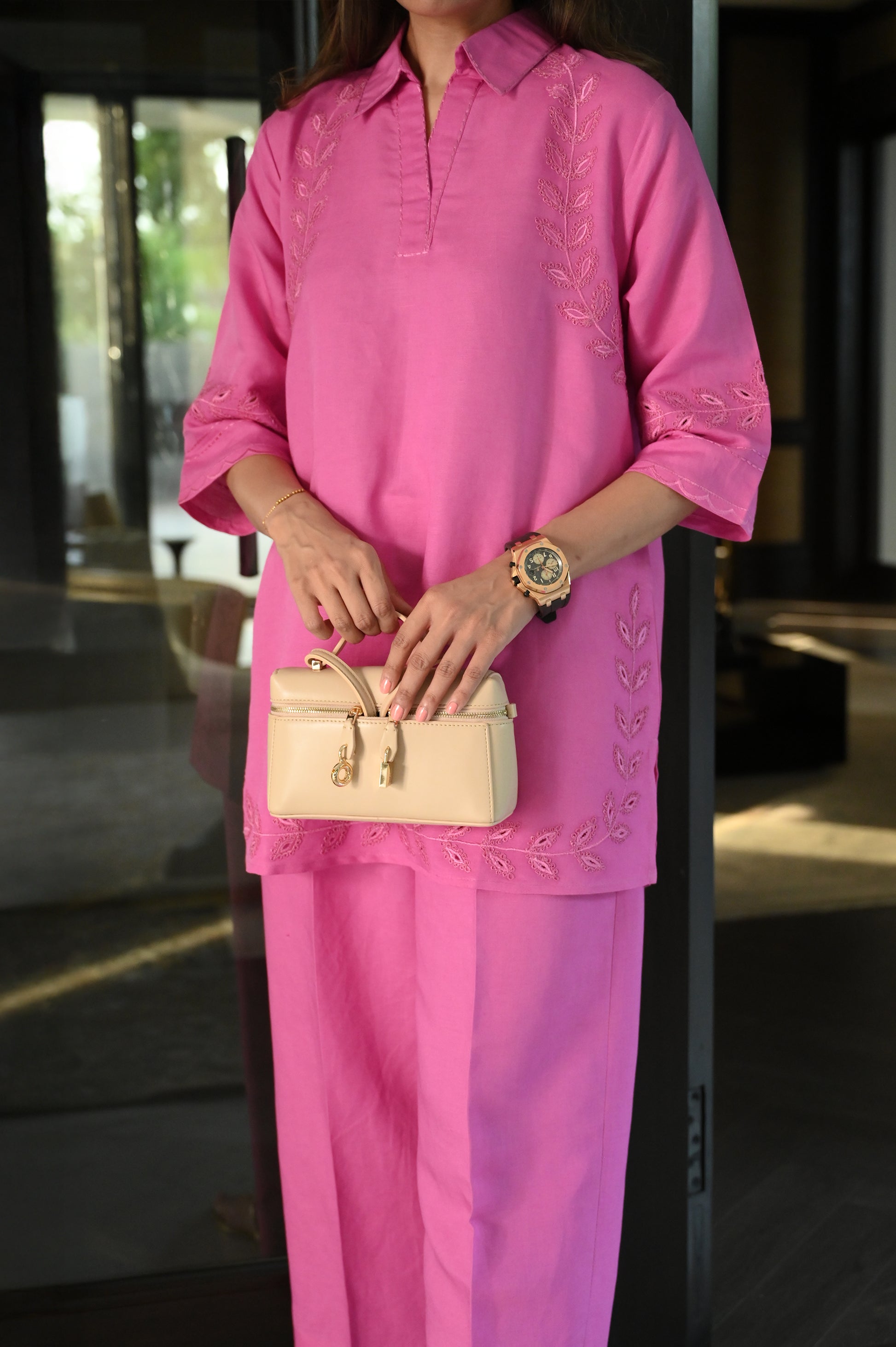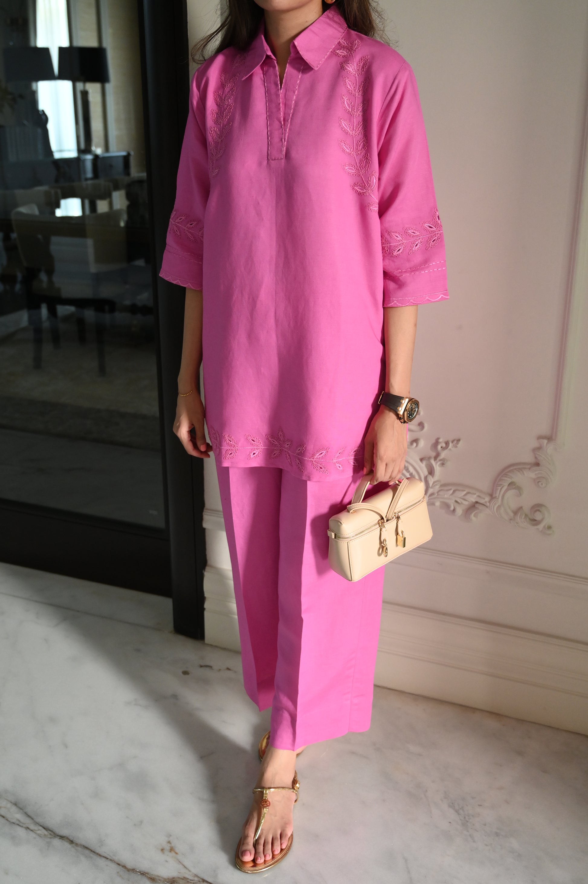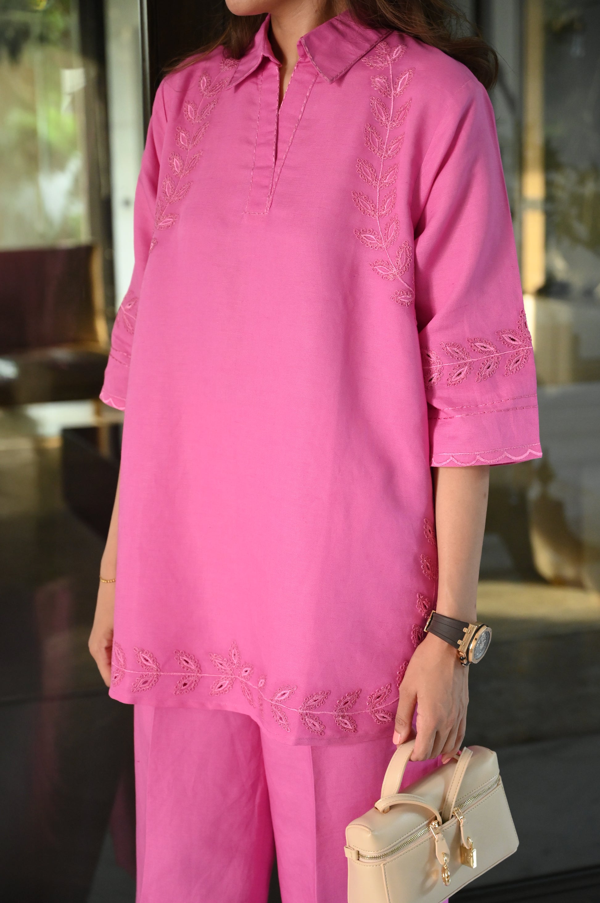 A tulip pink two-piece set featuring a straight kurta with tonal embroidery along the sleeves and hem, accentuated with delicate side motifs. The kurta is styled with a subtle V-neckline and a collared design enhanced with stitch detailing, and is paired with wide-leg trousers for a graceful finish.