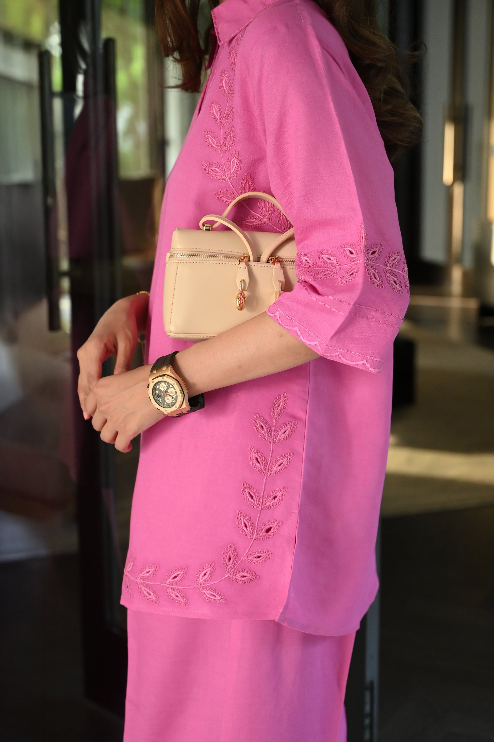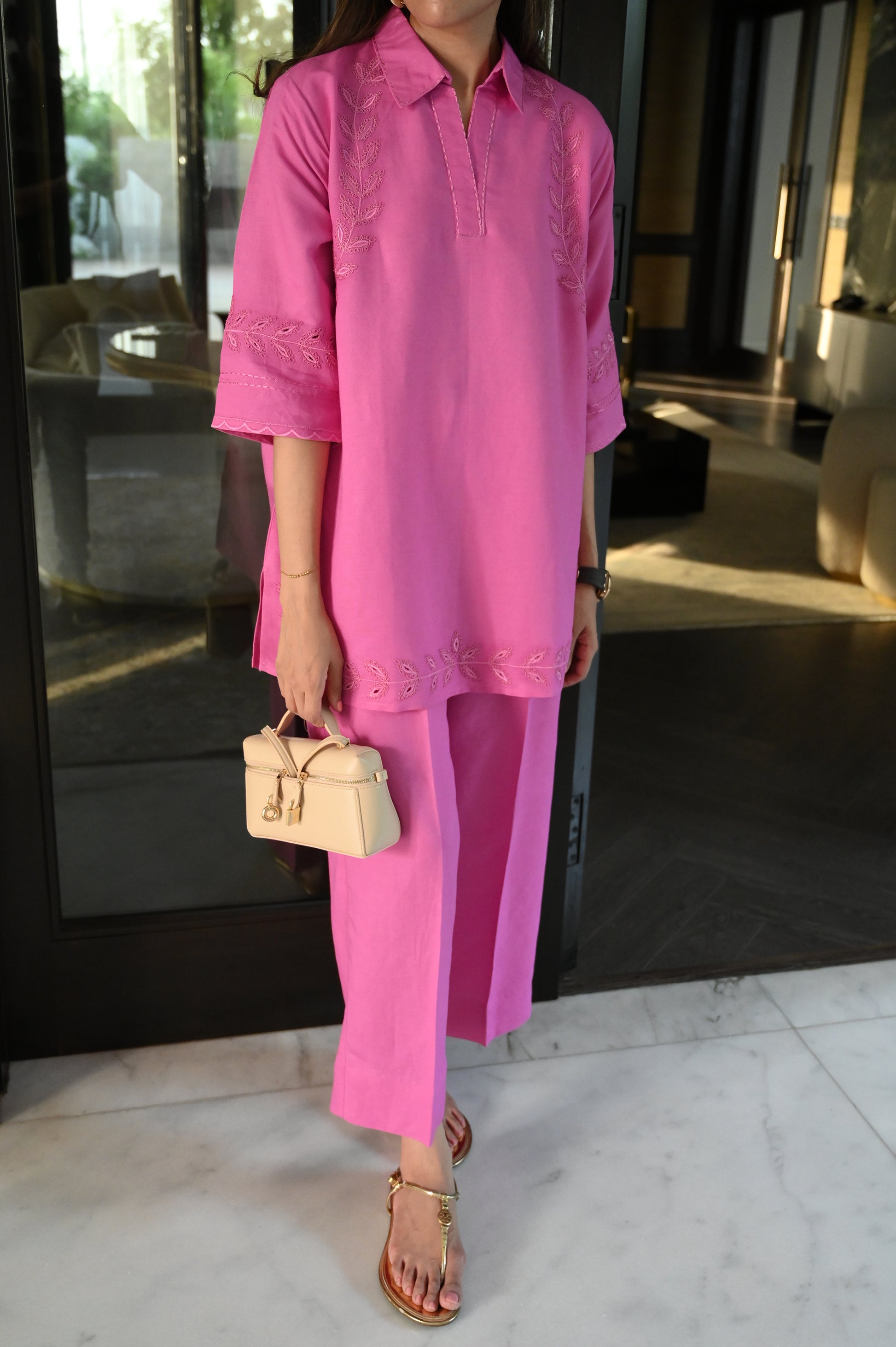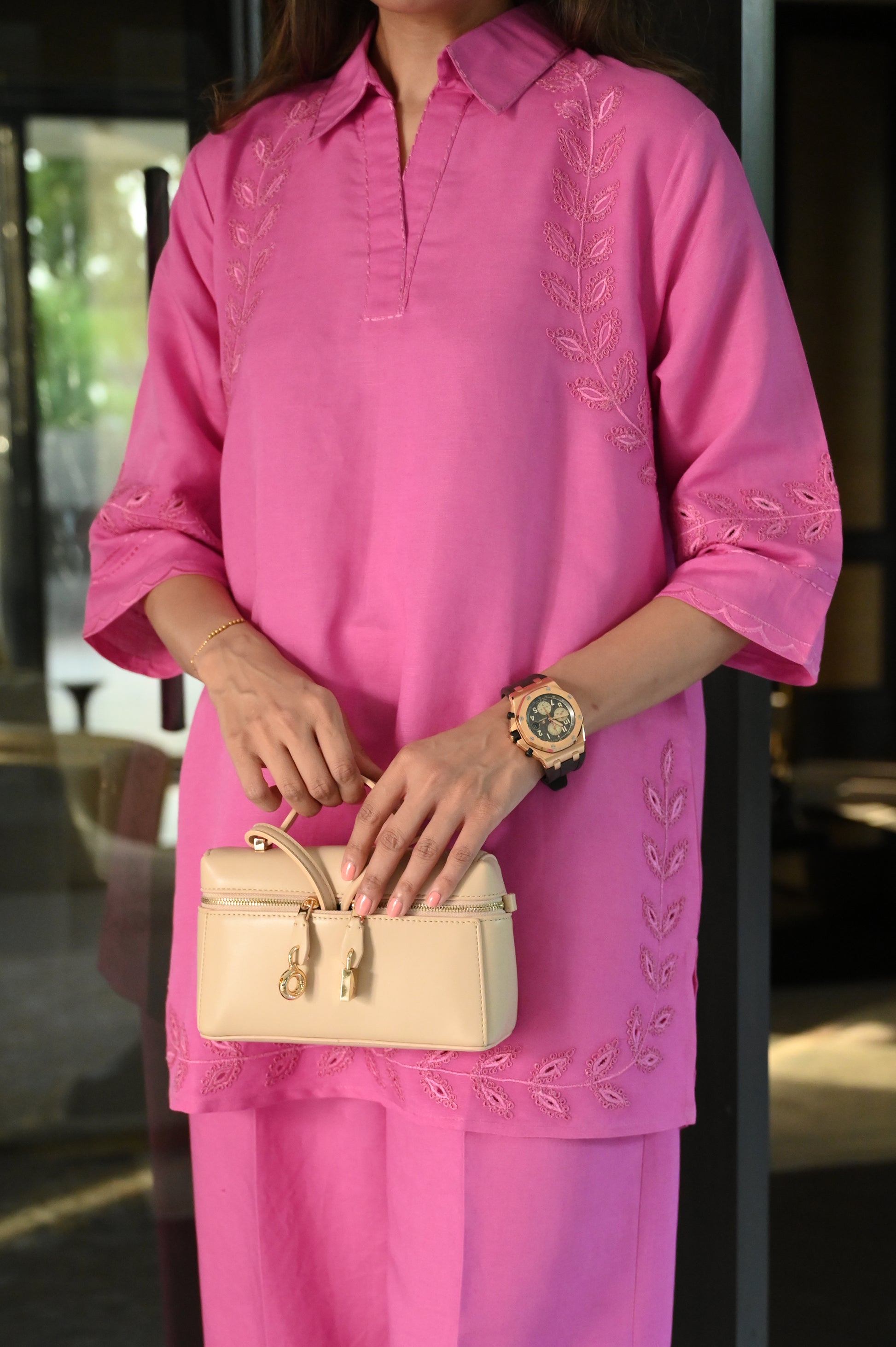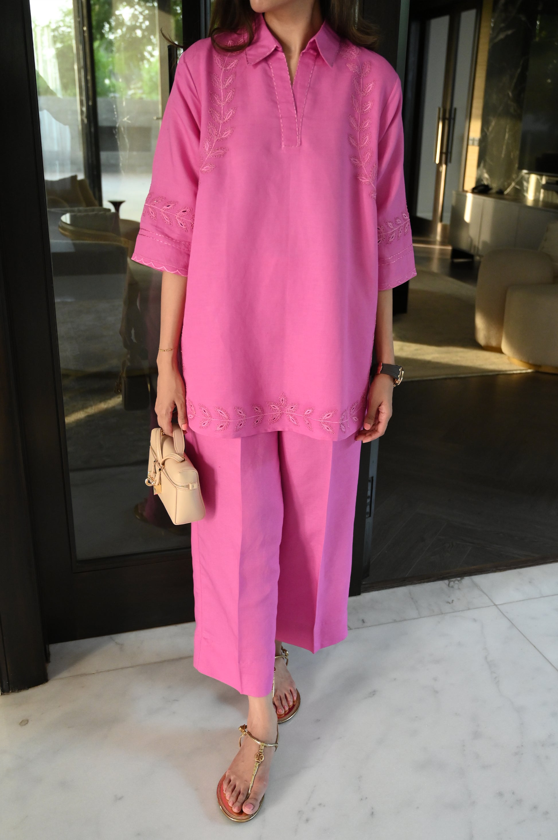 A tulip pink two-piece set featuring a straight kurta with tonal embroidery along the sleeves and hem, accentuated with delicate side motifs. The kurta is styled with a subtle V-neckline and a collared design enhanced with stitch detailing, and is paired with wide-leg trousers for a graceful finish.
