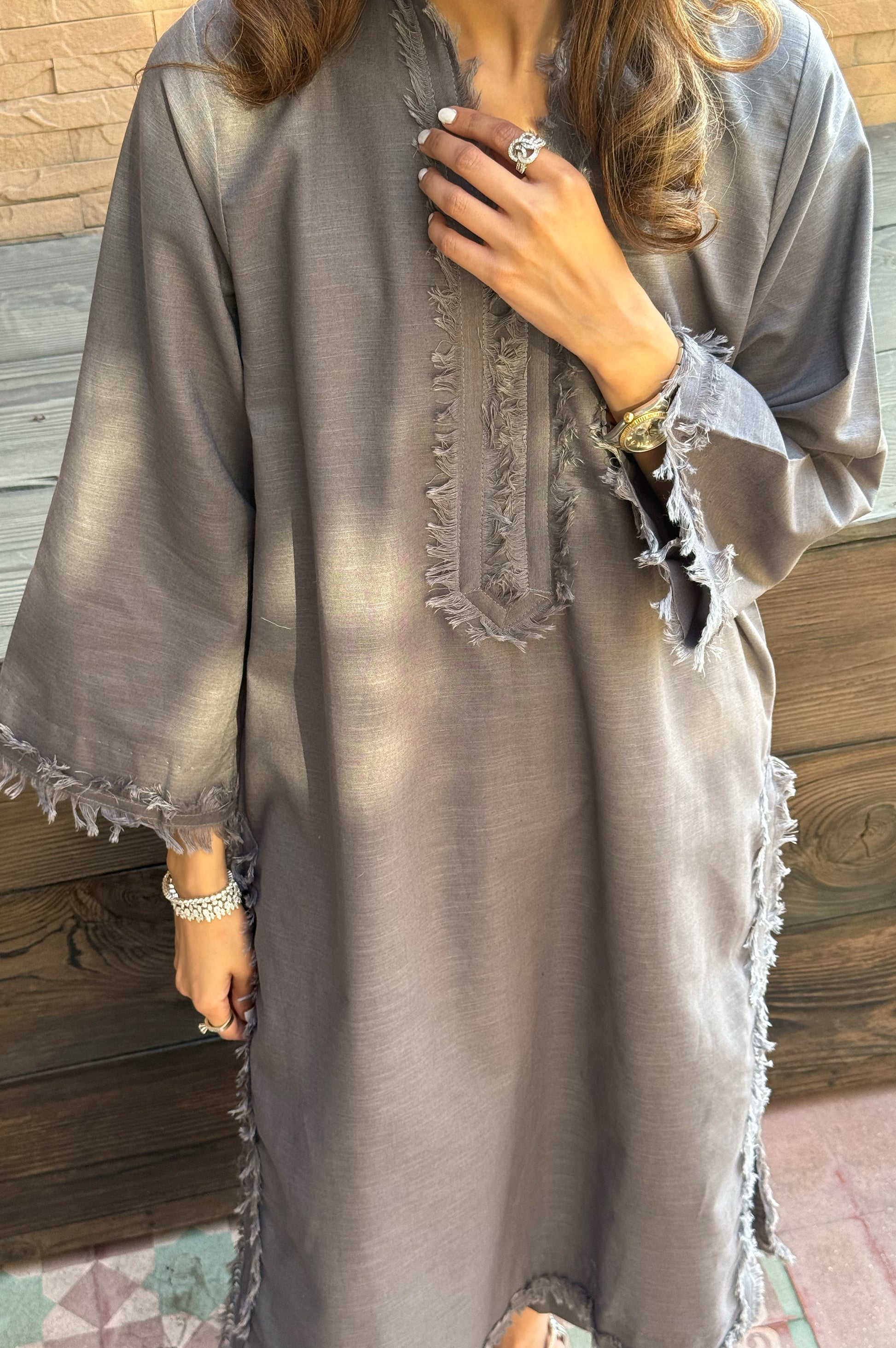 This 2-piece stitched set features a soft grey base detailed with high-quality tonal frayed edging along the V-neckline, sleeves, and side slits. It’s made from premium luxe linen, offering a breathable yet sophisticated feel, and is paired with matching trousers for a perfectly balanced look.