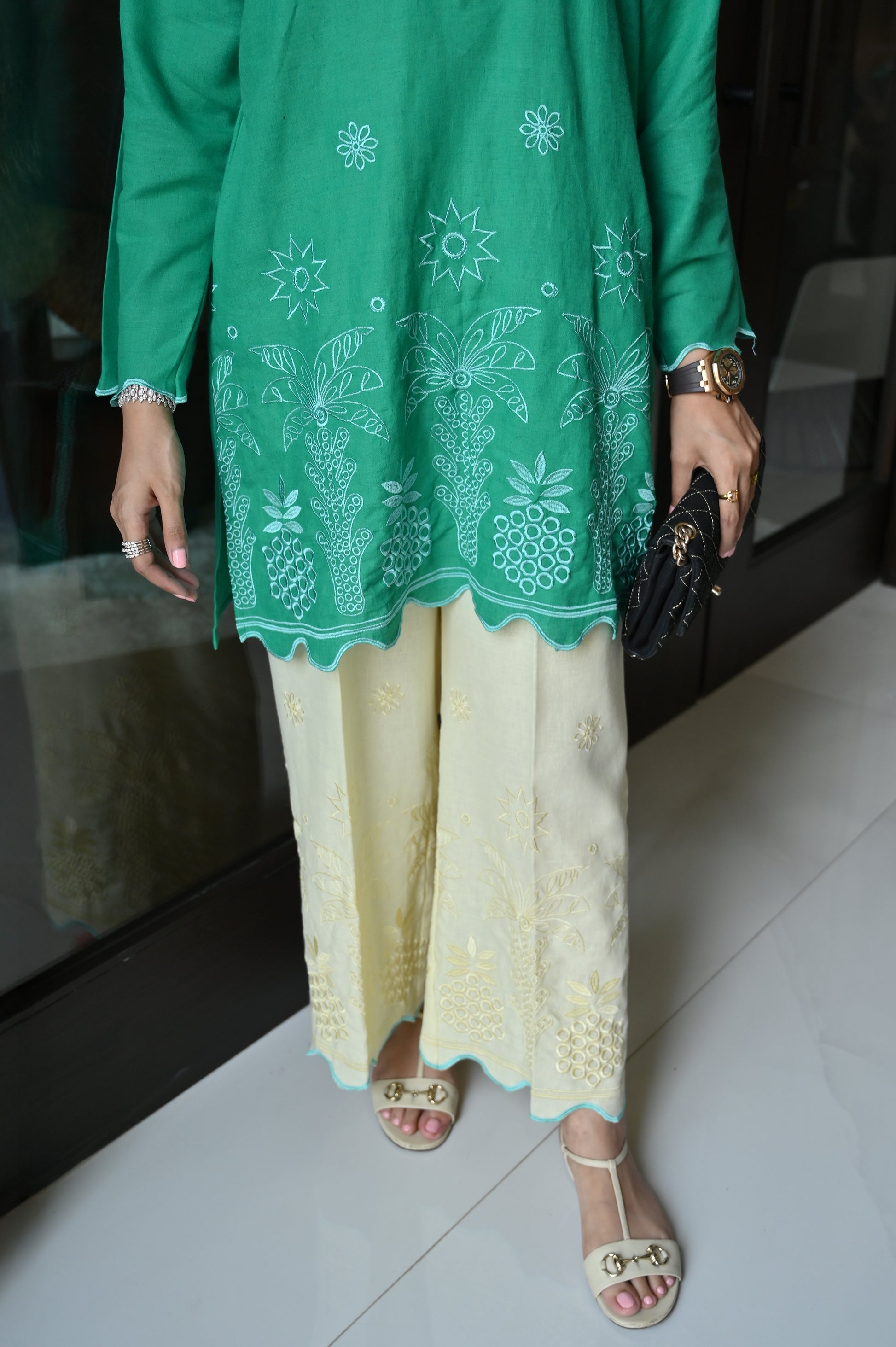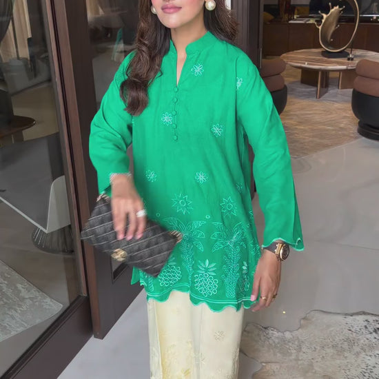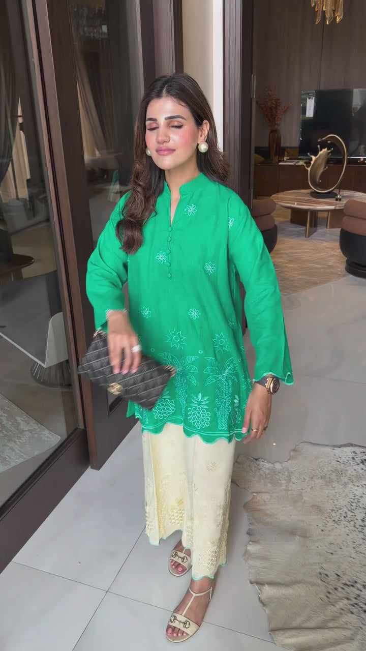 This 2-piece set comes in a vibrant green shade, designed for effortless sophistication with delicate embroidery details. The kurta features a relaxed straight cut with a modest band neckline, adorned with subtle floral motifs across the front. Intricate threadwork along the hem in a charming fruit-inspired pattern, finished with scalloped edging, adds character while keeping the overall look refined and balanced. Paired with matching cream shalwar, detailed with coordinated embroidered borders, this set offers a graceful and comfortable silhouette.