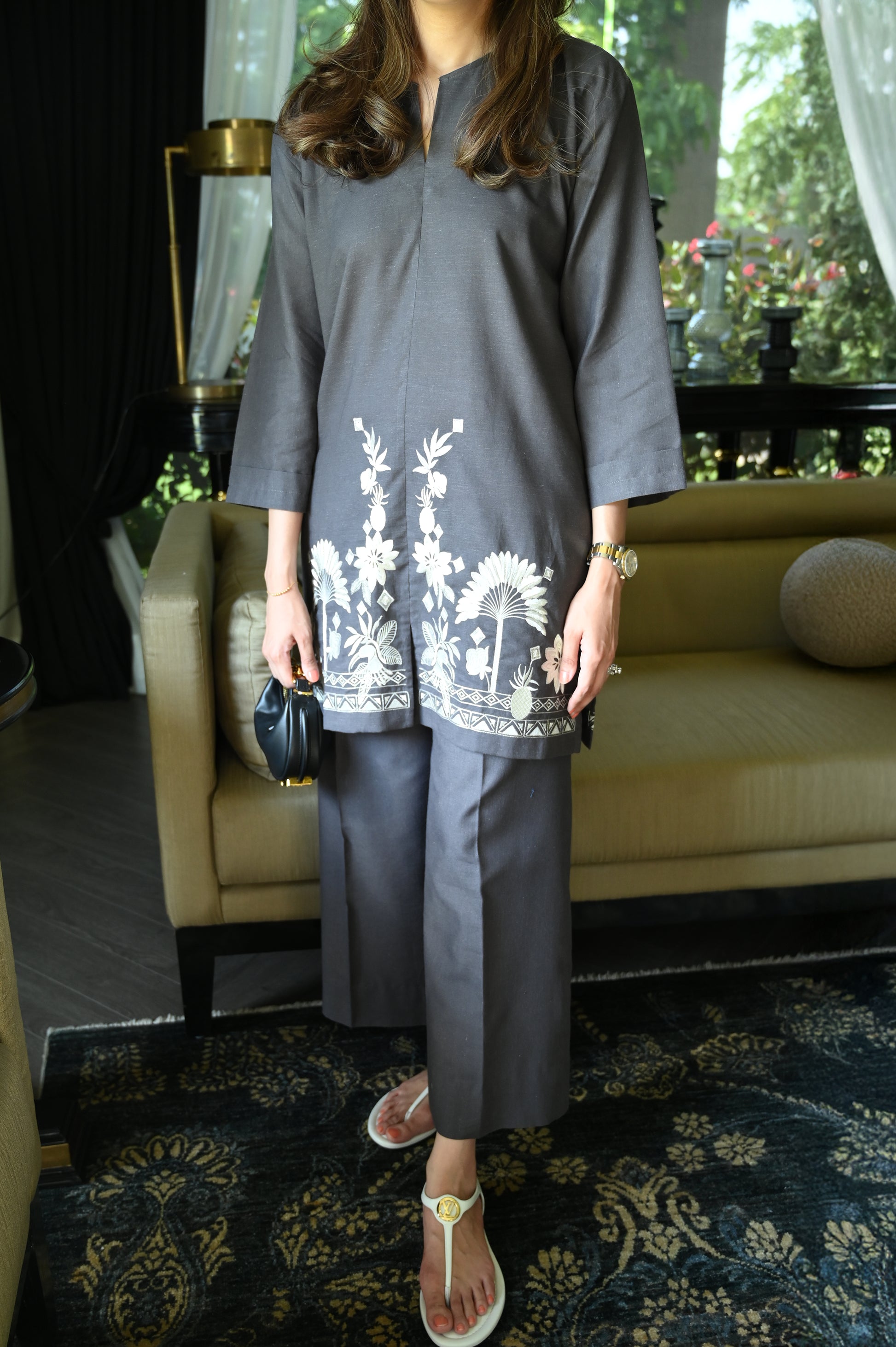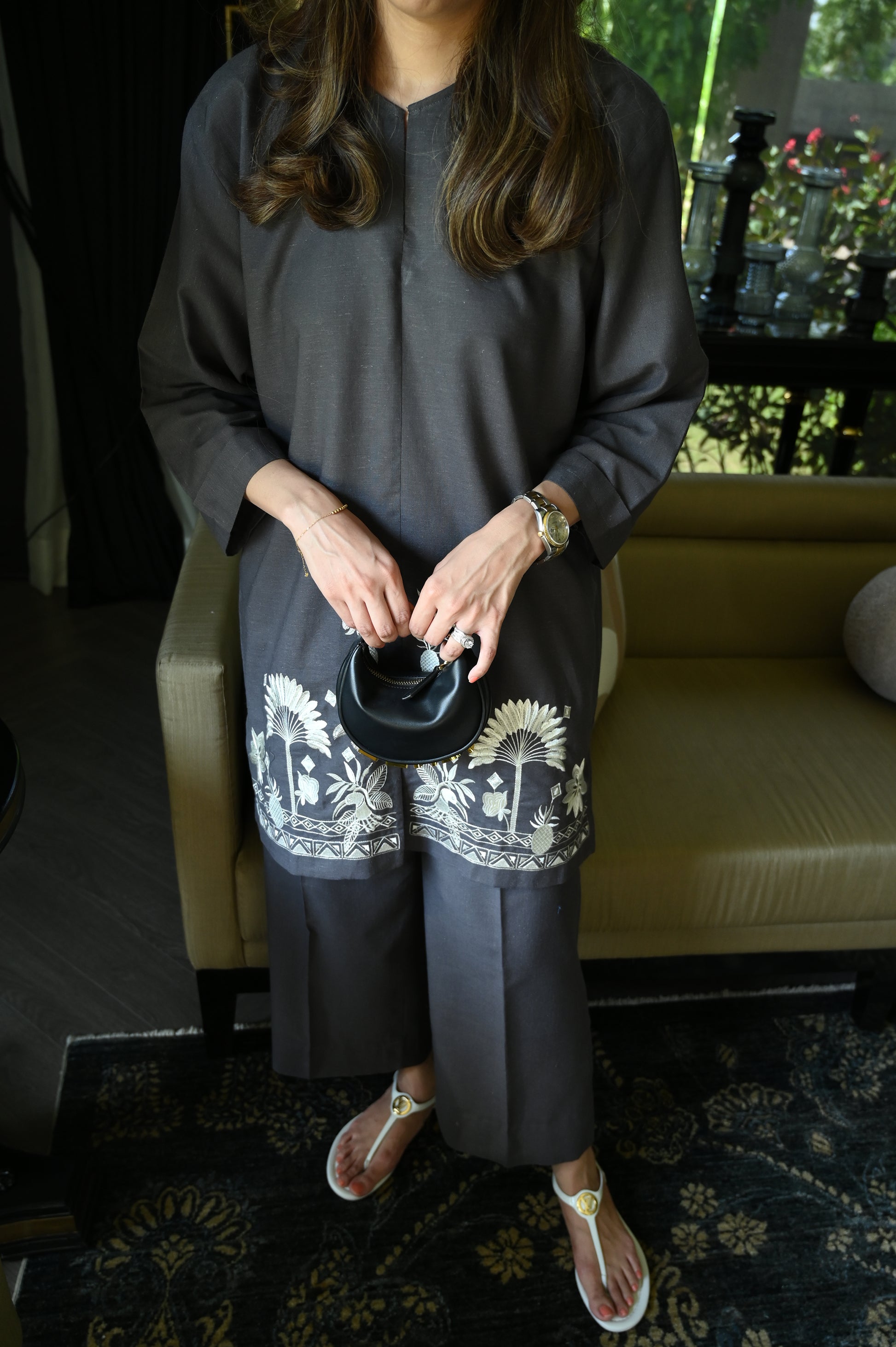 A minimalist yet striking outfit where a garden of contemporary white floral and botanical embroidery blooms from the hem, giving it a fresh and sophisticated look. The kurta is adorned with a sleek V-slit neckline and is paired with matching trousers for a cohesive and polished ensemble.