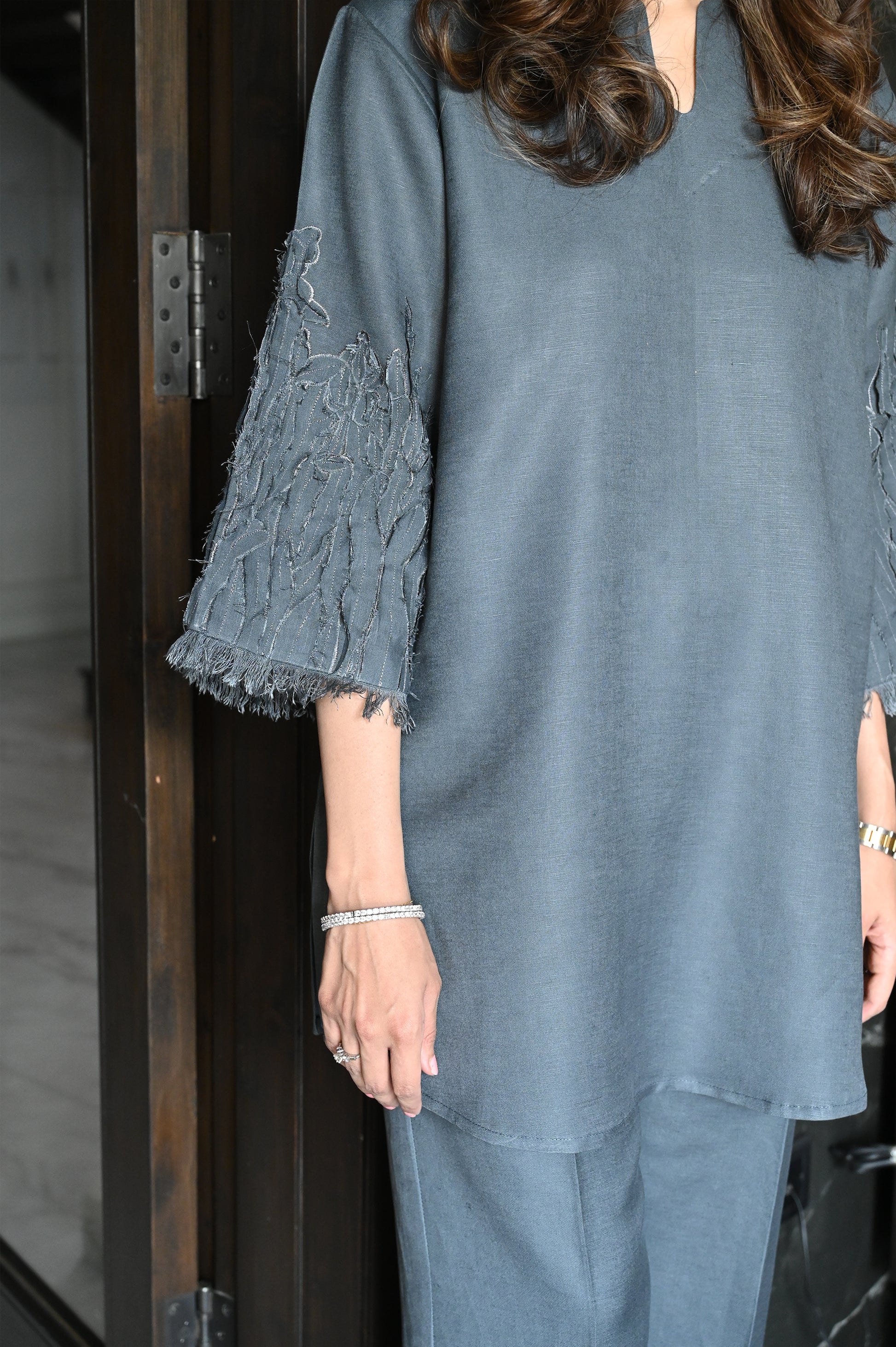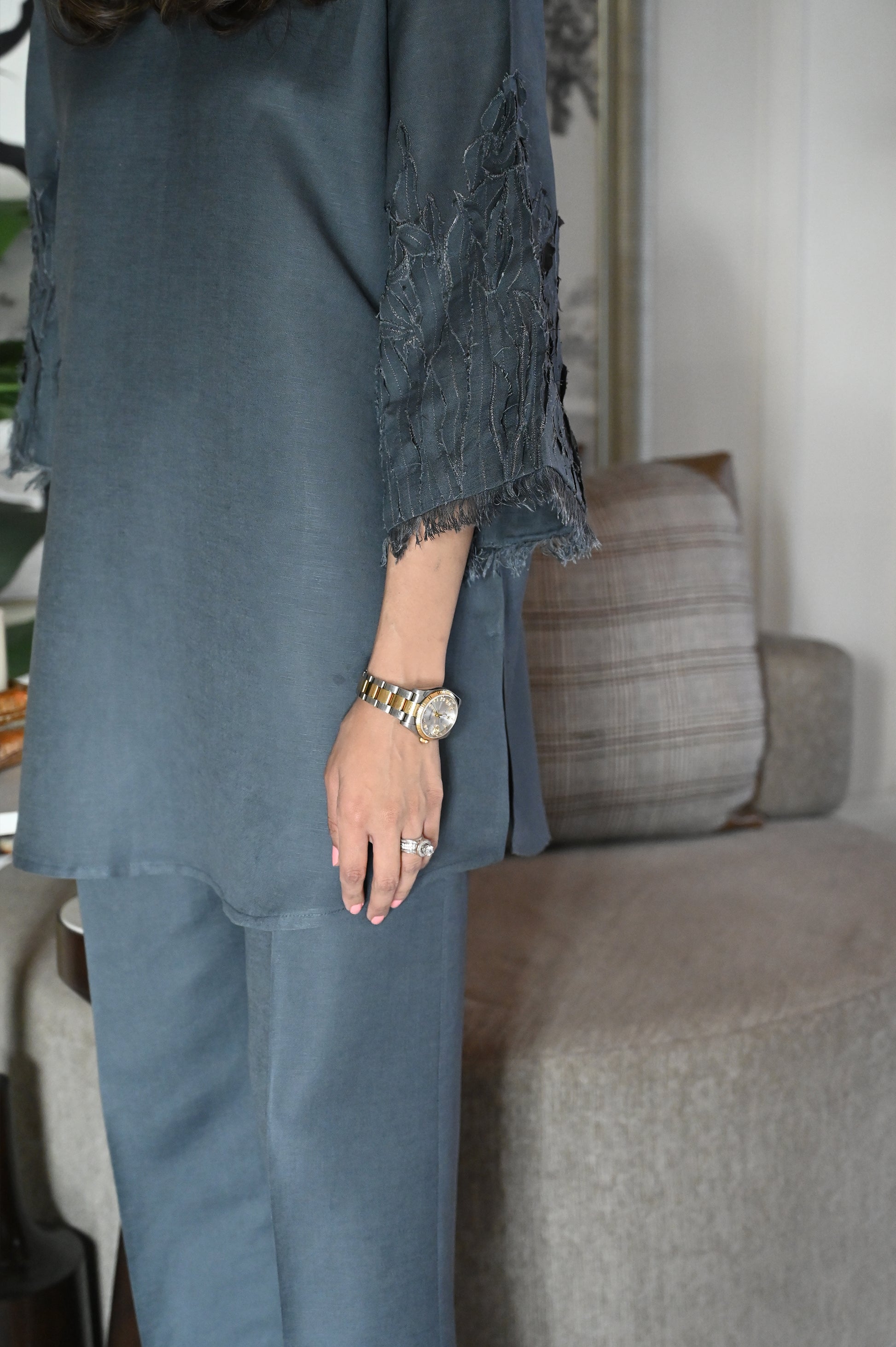 A grey two-piece set featuring a straight-cut kurta with textured appliqué detailing on the sleeves, paired with wide-leg trousers.