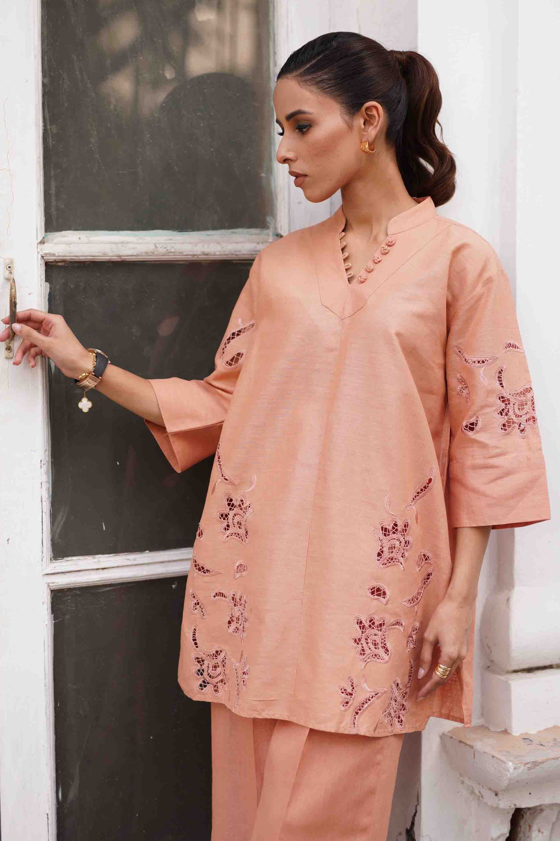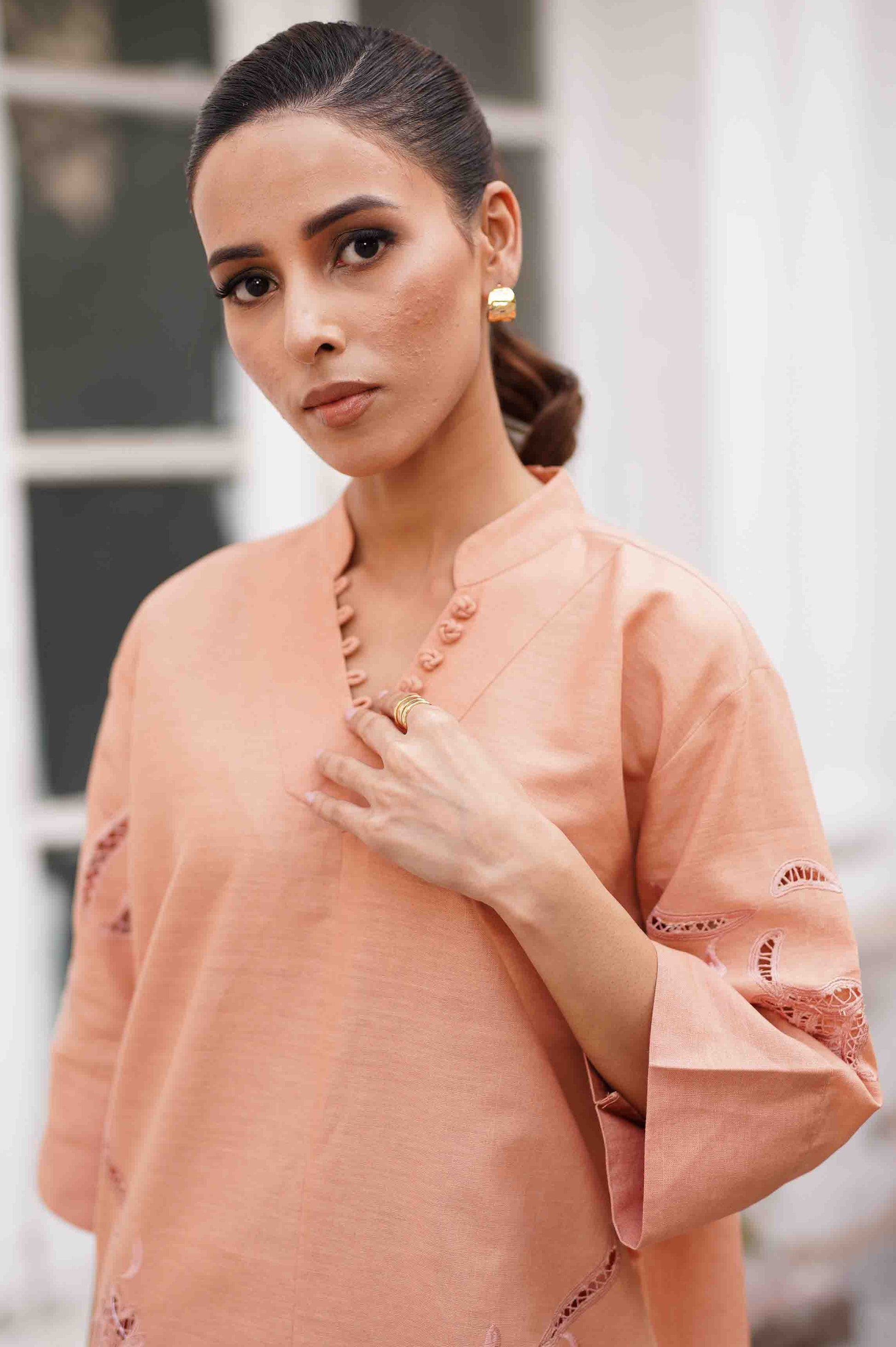 A breezy two-piece set in peach, featuring a straight-cut kurta with delicate thread and cutwork embroidery along the sleeves and front. The kurta is styled with a subtle V neckline adorned with fabric buttons, paired with matching wide-leg trousers for an effortlessly chic and comfortable look.
