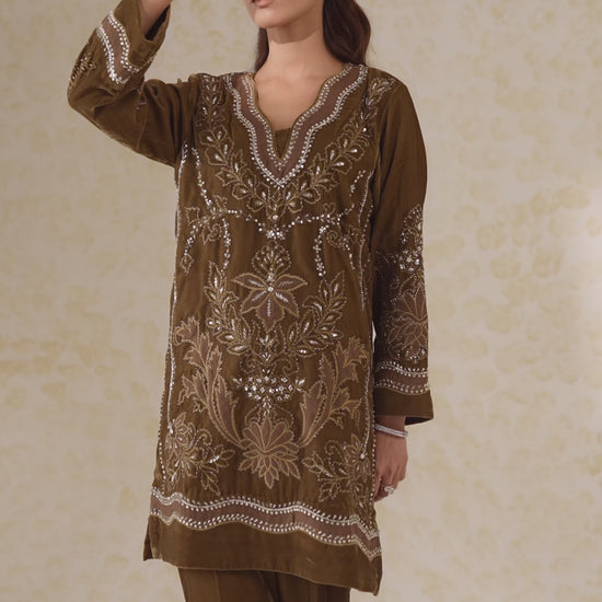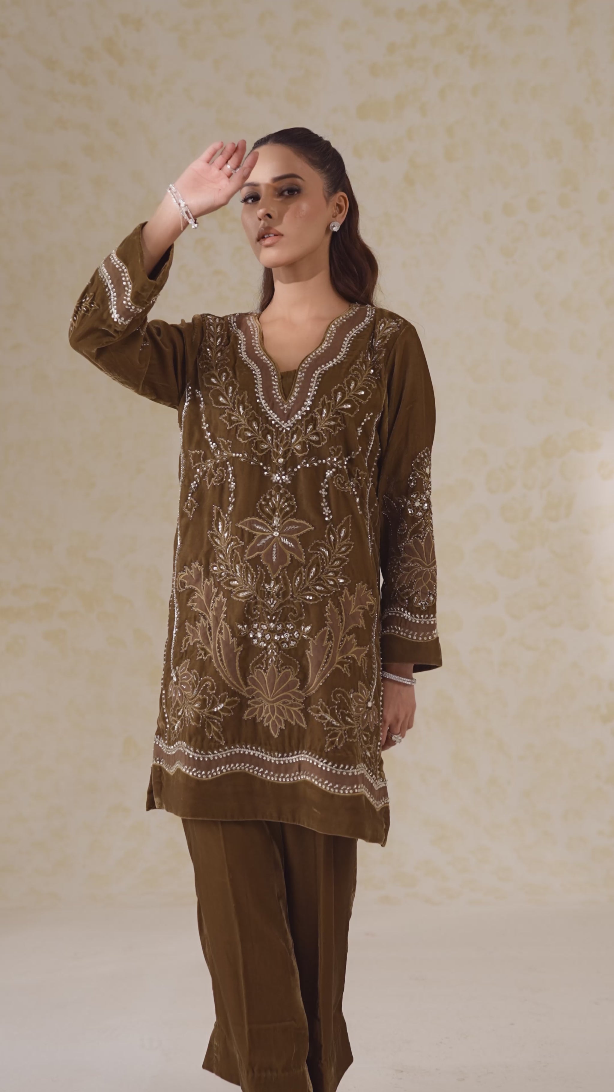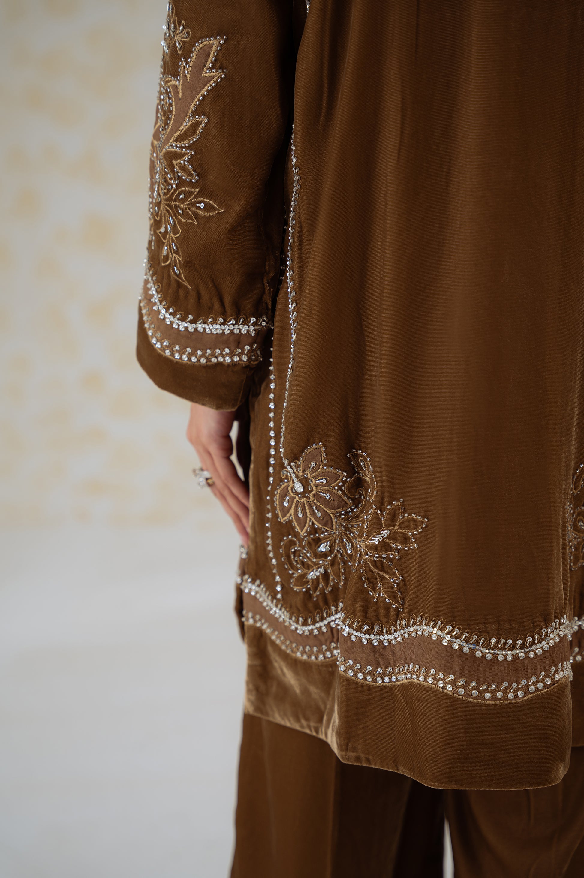 A coffee brown two-piece co-ord featuring a straight kurta crafted from luxe velvet, adorned with intricate applique patterns and embellished with delicate zardozi handwork. The kurta showcases a gracefully curved V-neckline and ornate detailing along the front and sleeves. Paired with matching wide-leg velvet trousers, this look blends timeless elegance with a touch of festive sophistication.