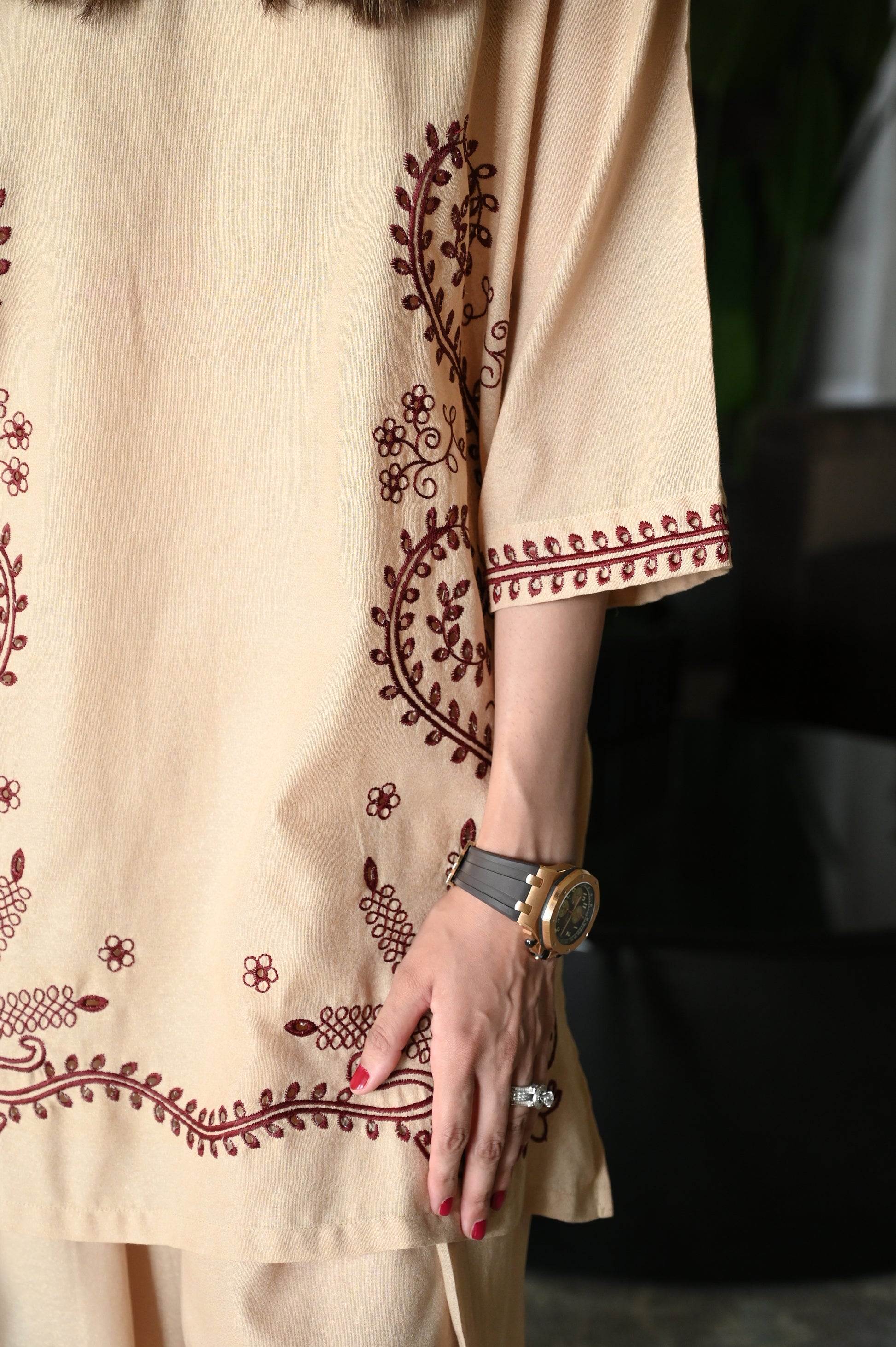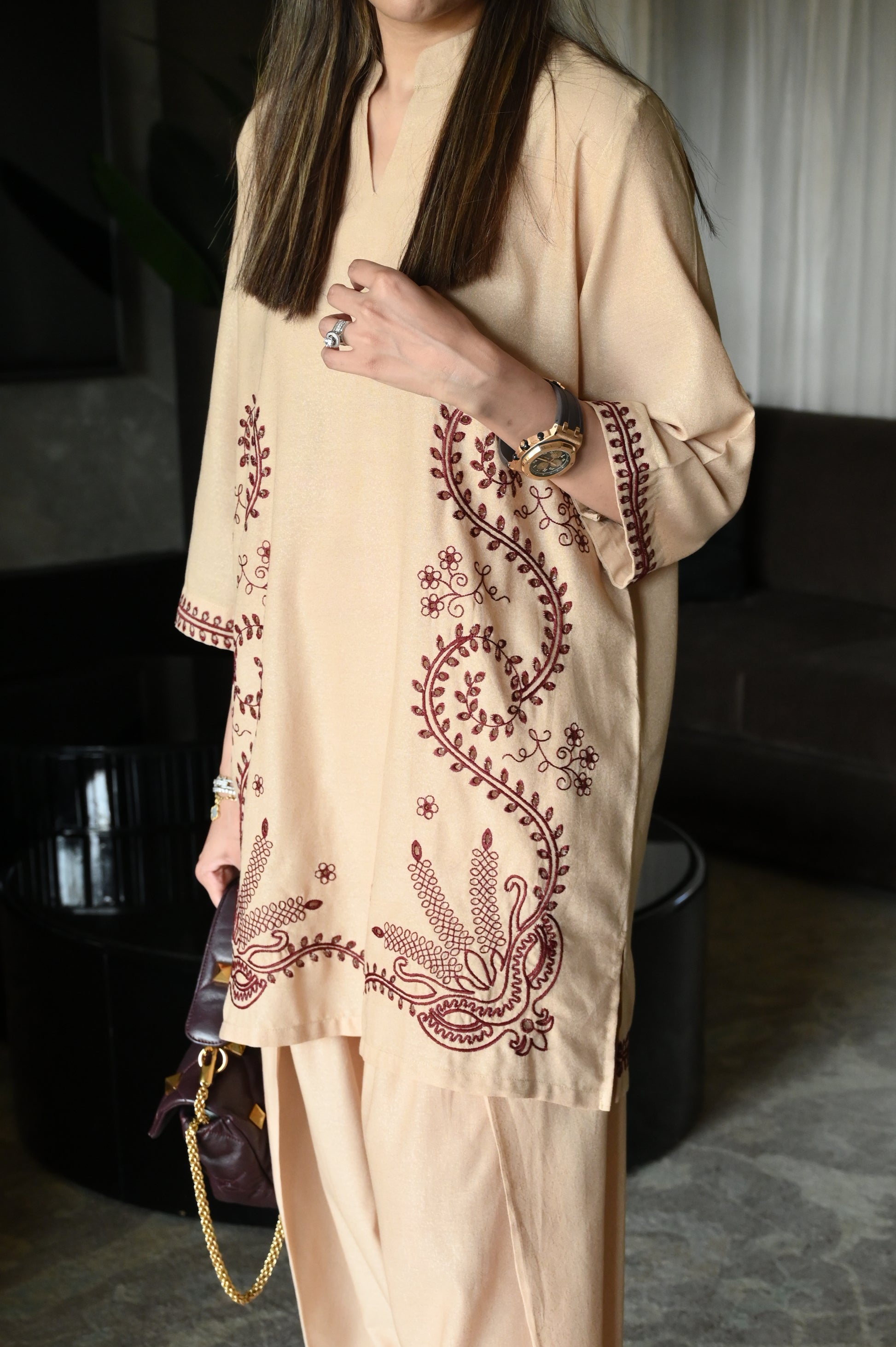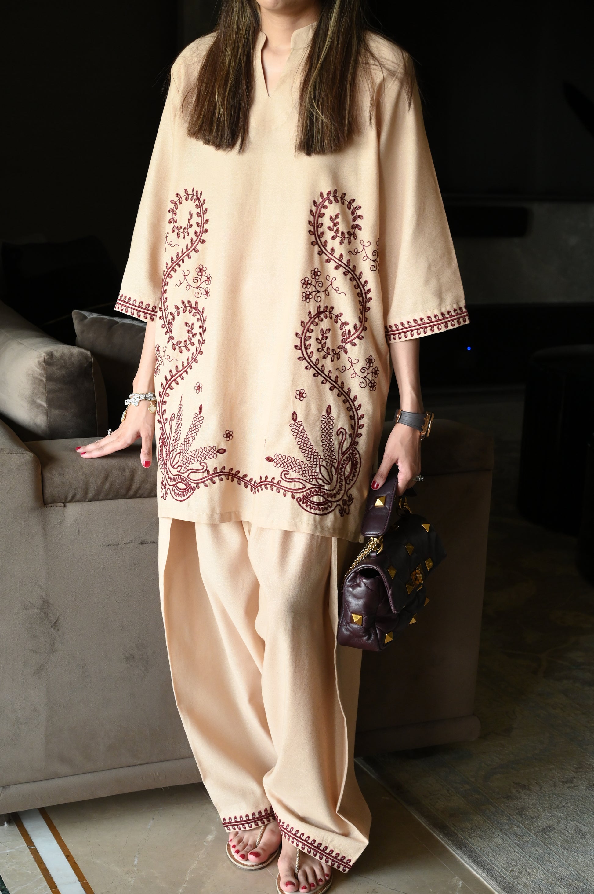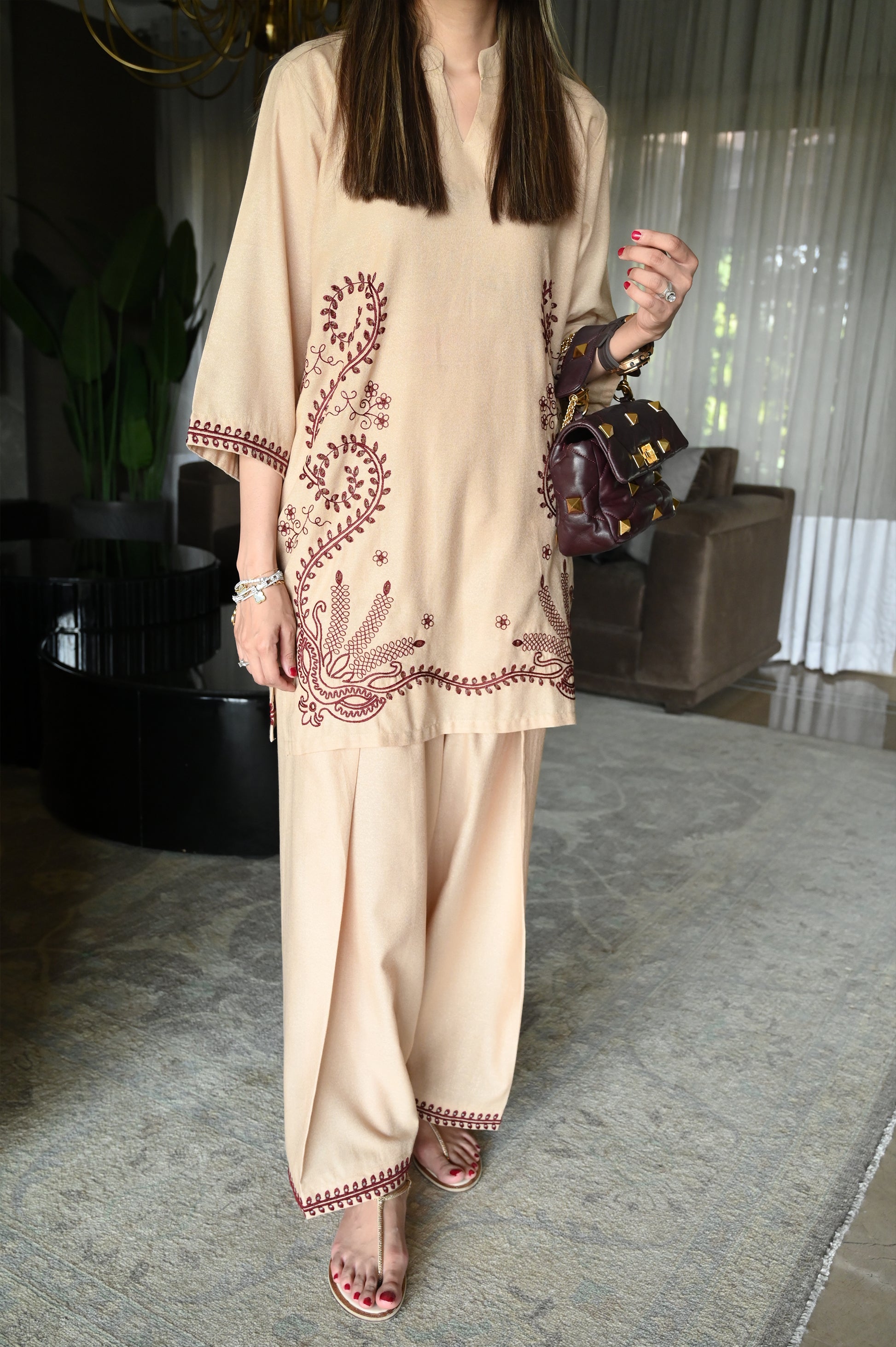 A camel-toned loose-fit kurta featuring delicate maroon thread embroidery on the front and hems, paired with coordinated farshi shalwar for an elegant, timeless look.