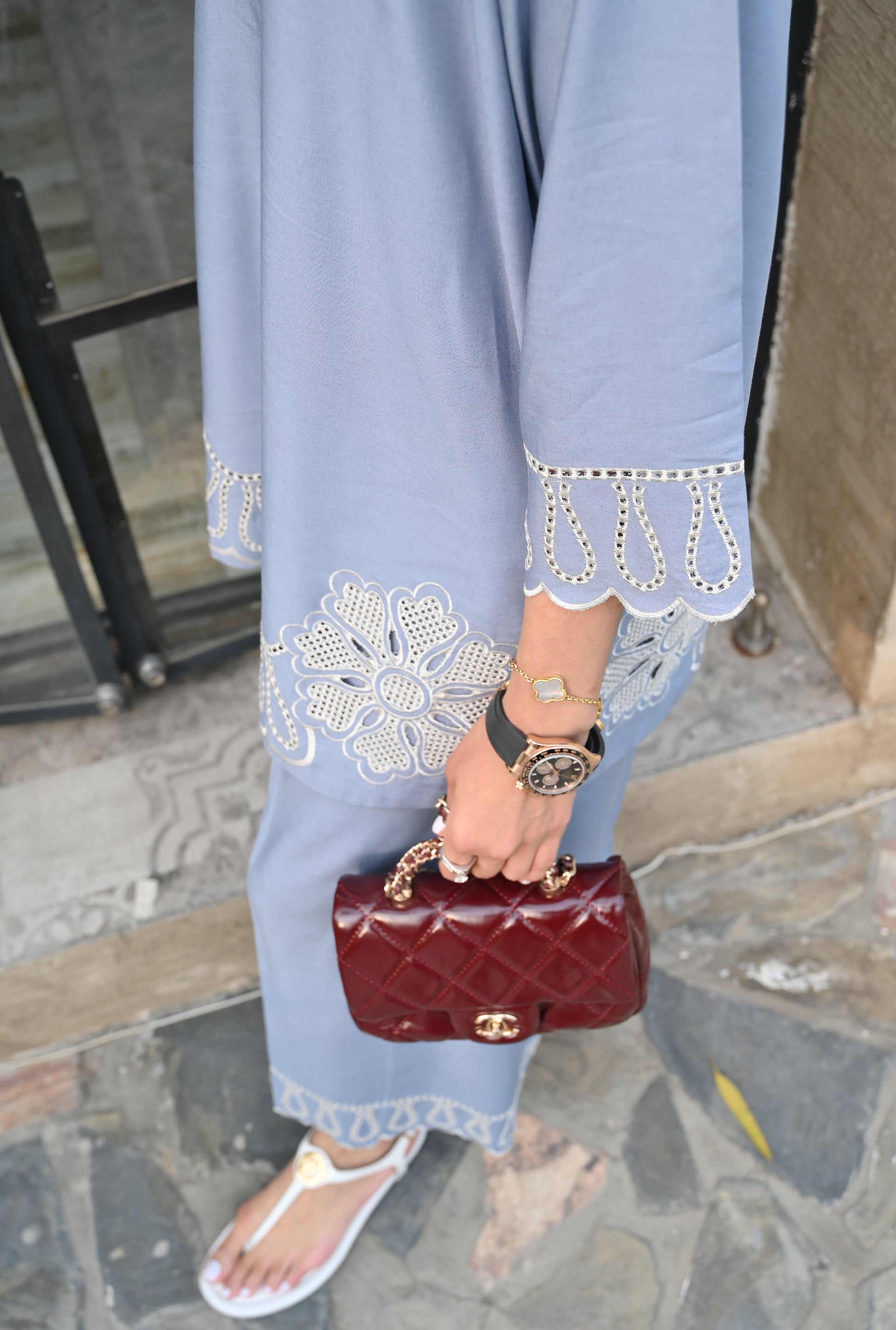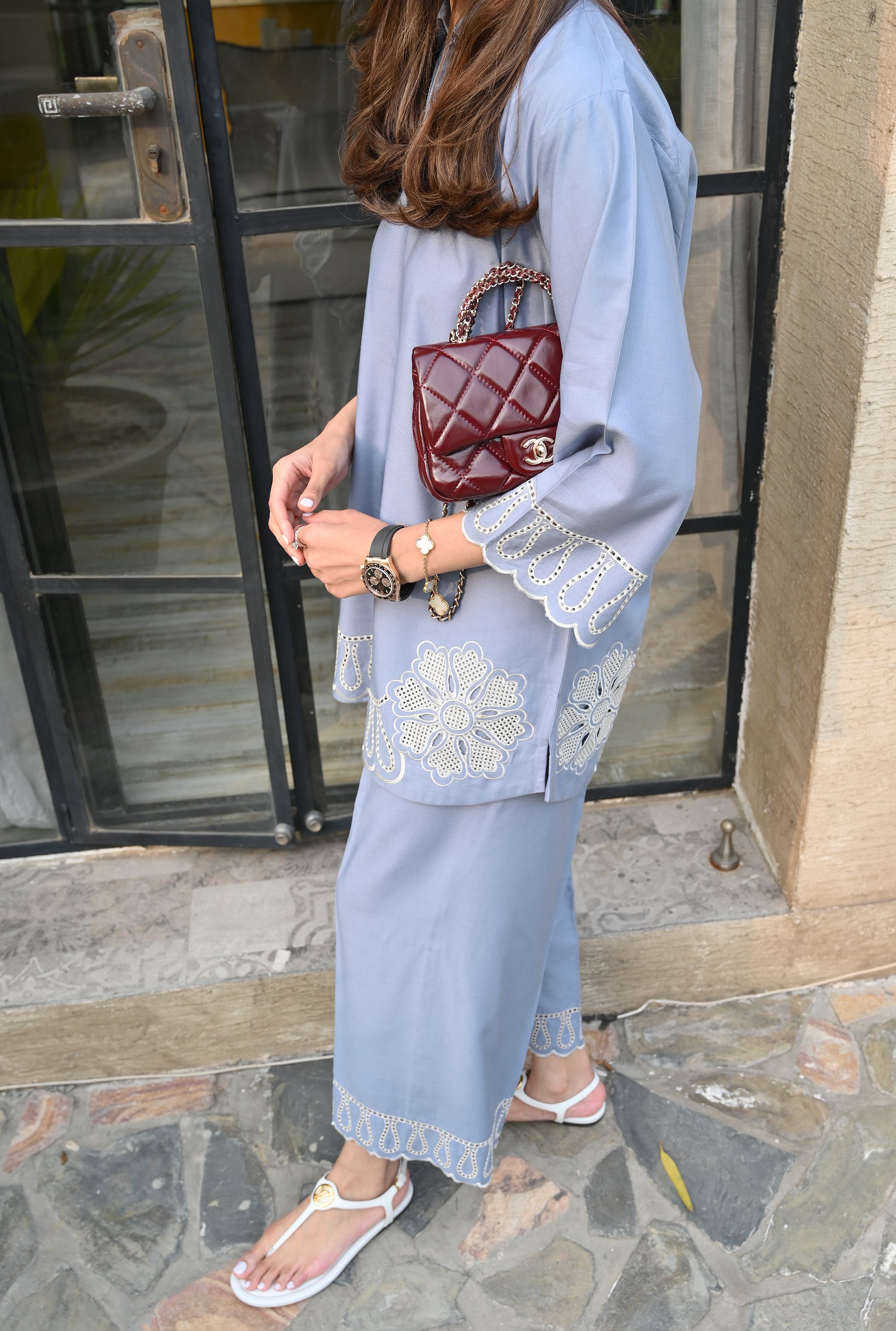 This 2-piece stitched set in a soft dusty blue is made from premium luxe linen, offering a breathable yet sophisticated feel. The shirt features a modern V-cut neckline and is elevated by intricate white cutwork embroidery and floral threadwork. It's paired with matching wide-leg trousers that mirror the exquisite cutwork design at the cuffs for a cohesive, high-end look.