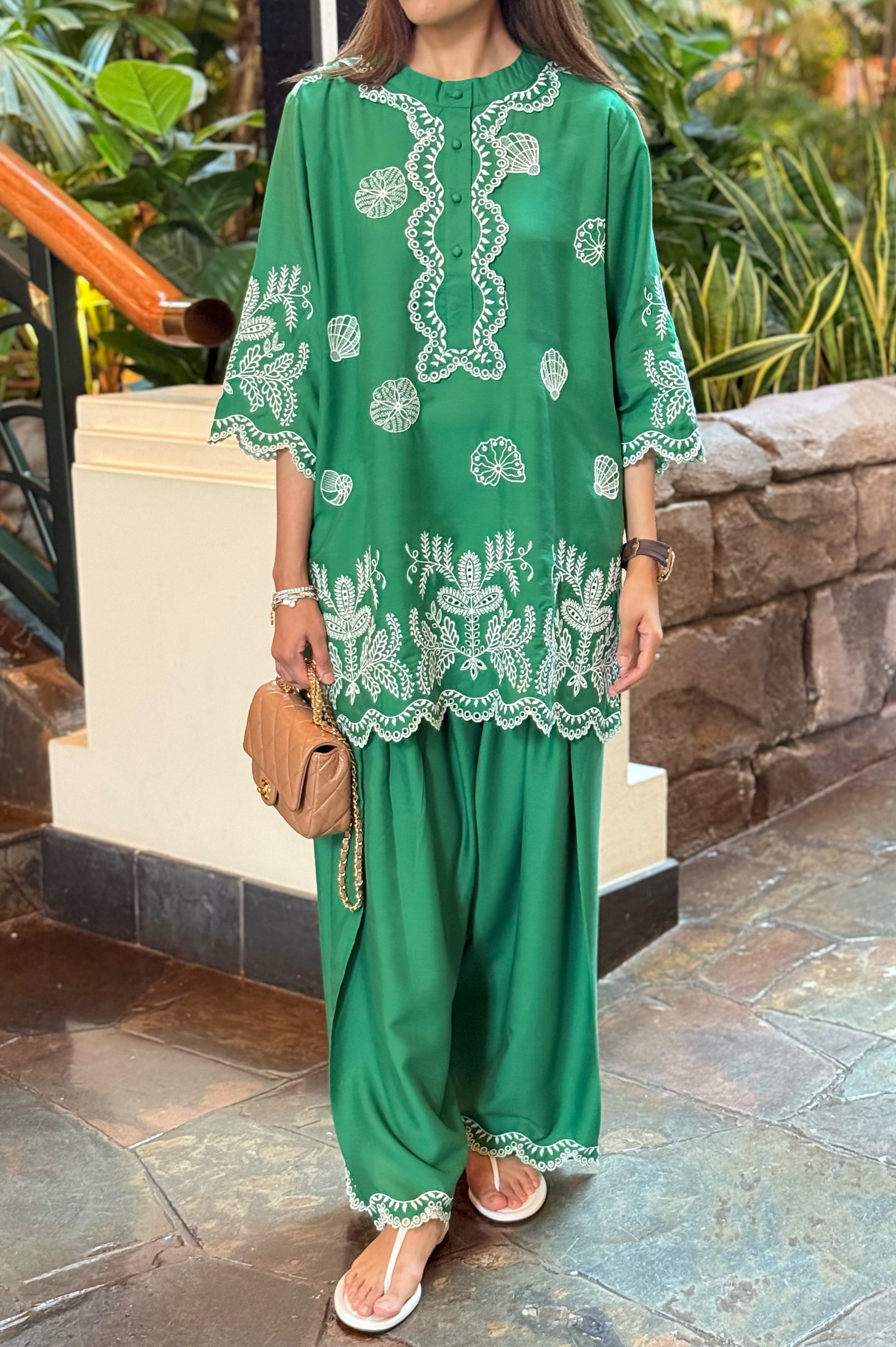 Features a fully embroidered in-house shirt, beautifully paired with an embroidered farshi shalwar.