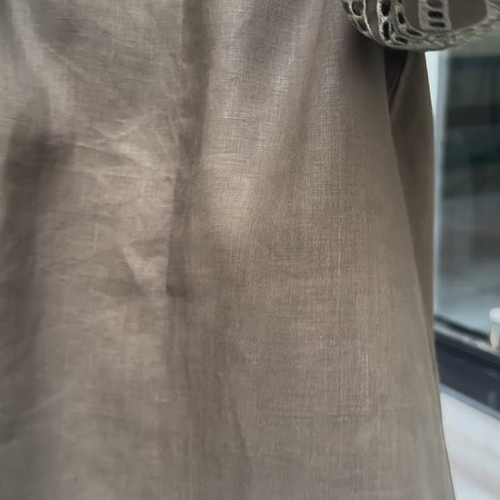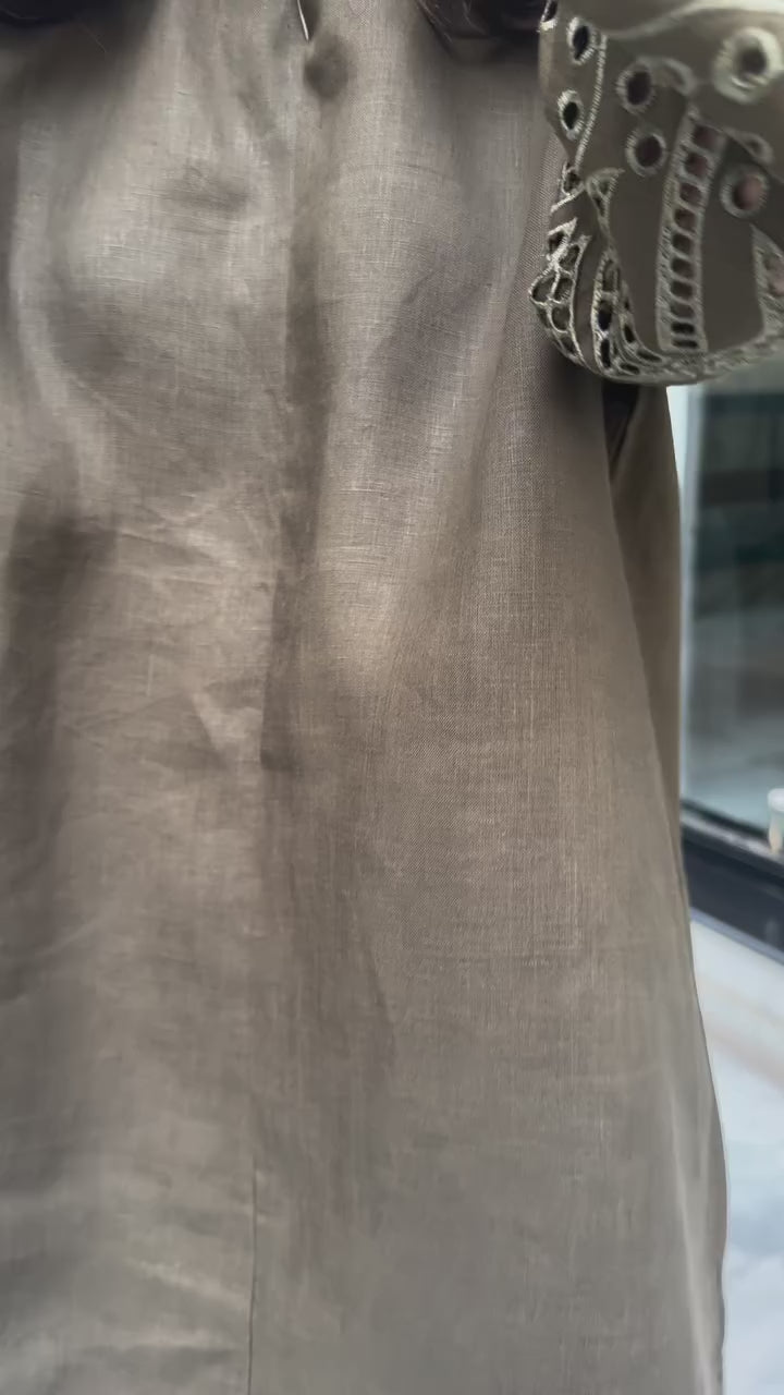 An olive green co-ord set, featuring a straight kurta with a collared neckline and a subtle V-slit, elevated with intricately embroidered cutwork sleeves. The kurta pairs with wide-leg trousers, creating a look that blends elegance with refined detailing.
