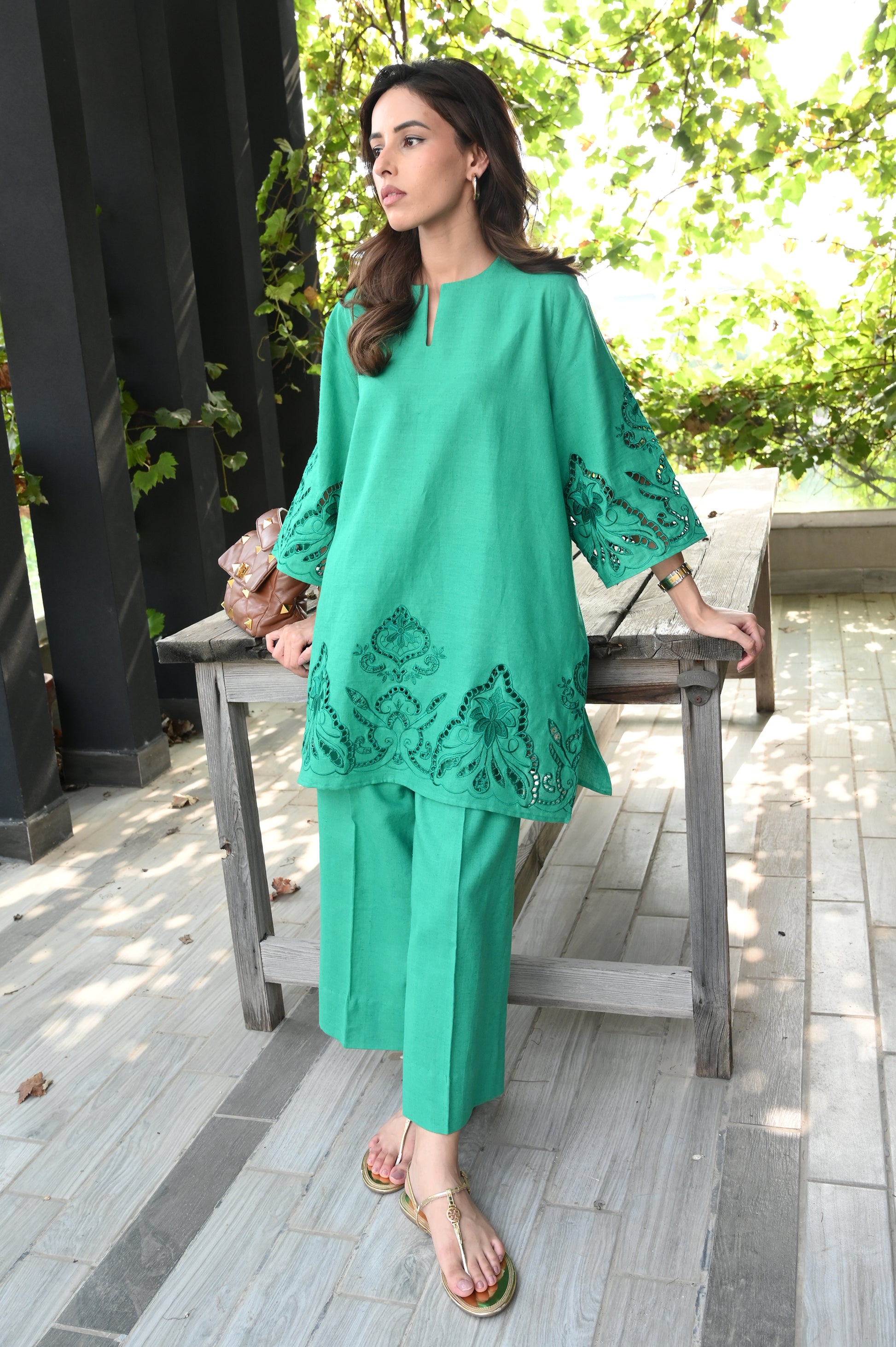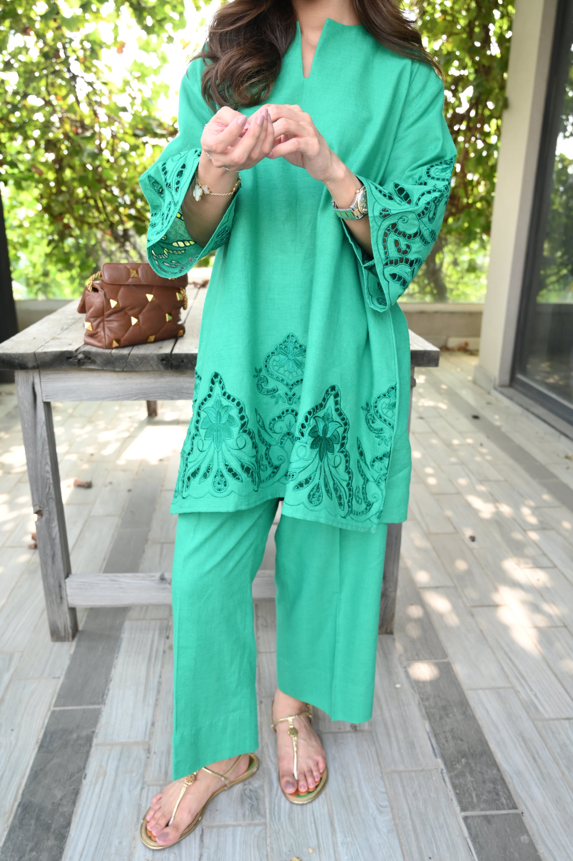 A fresh emerald green co-ord set, adorned with intricate floral ornamental cutwork embroidery along the hemline and sleeves. The kurta is styled with a straight silhouette and a subtle slit neckline, paired with wide-leg trousers for an effortlessly chic look.