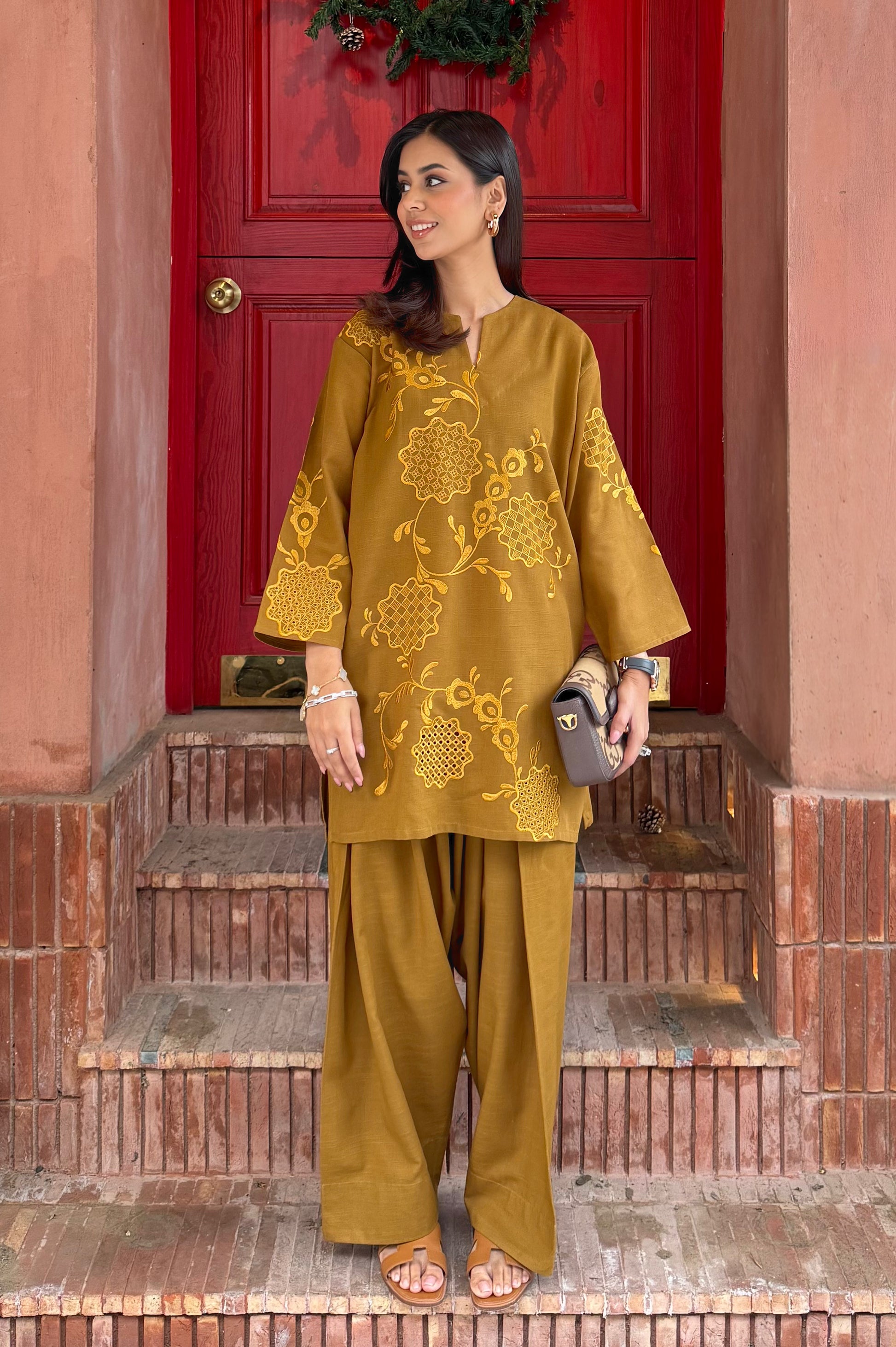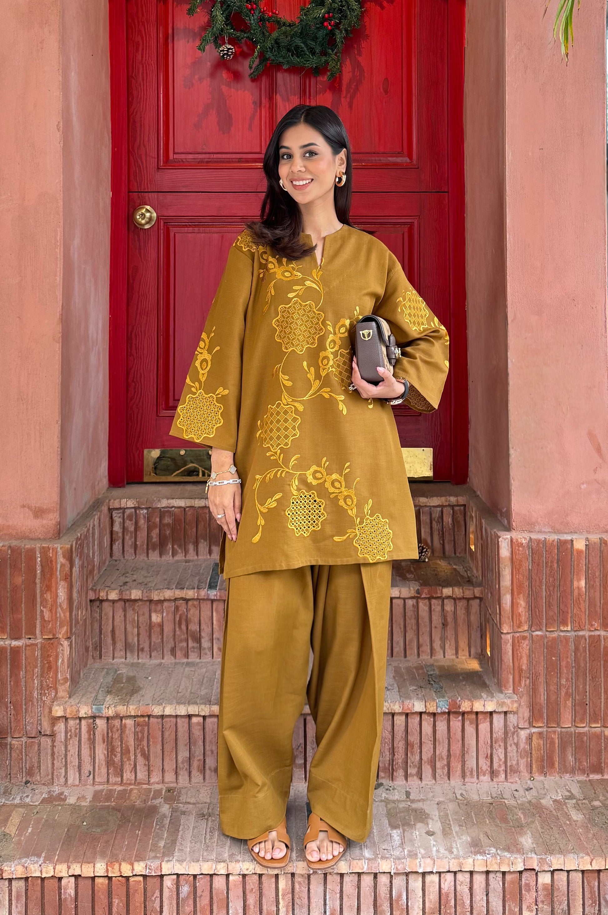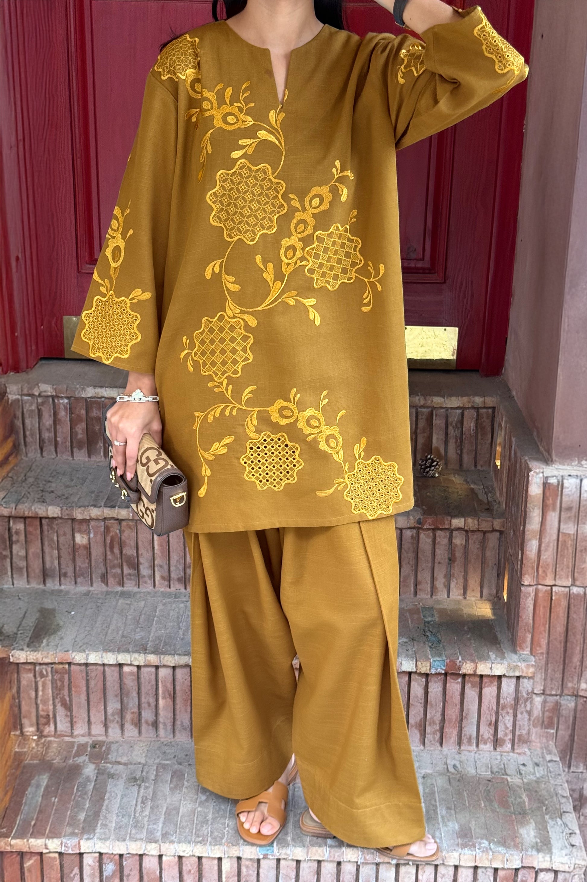 A mustard ochre co-ord set, featuring a straight kurta with relaxed sleeves, adorned with tonal floral embroidery cascading gracefully across the front. The kurta is designed with a clean round neckline finished with a subtle V-slit. Paired with a farshi shalwar, this ensemble blends comfort with elegance.