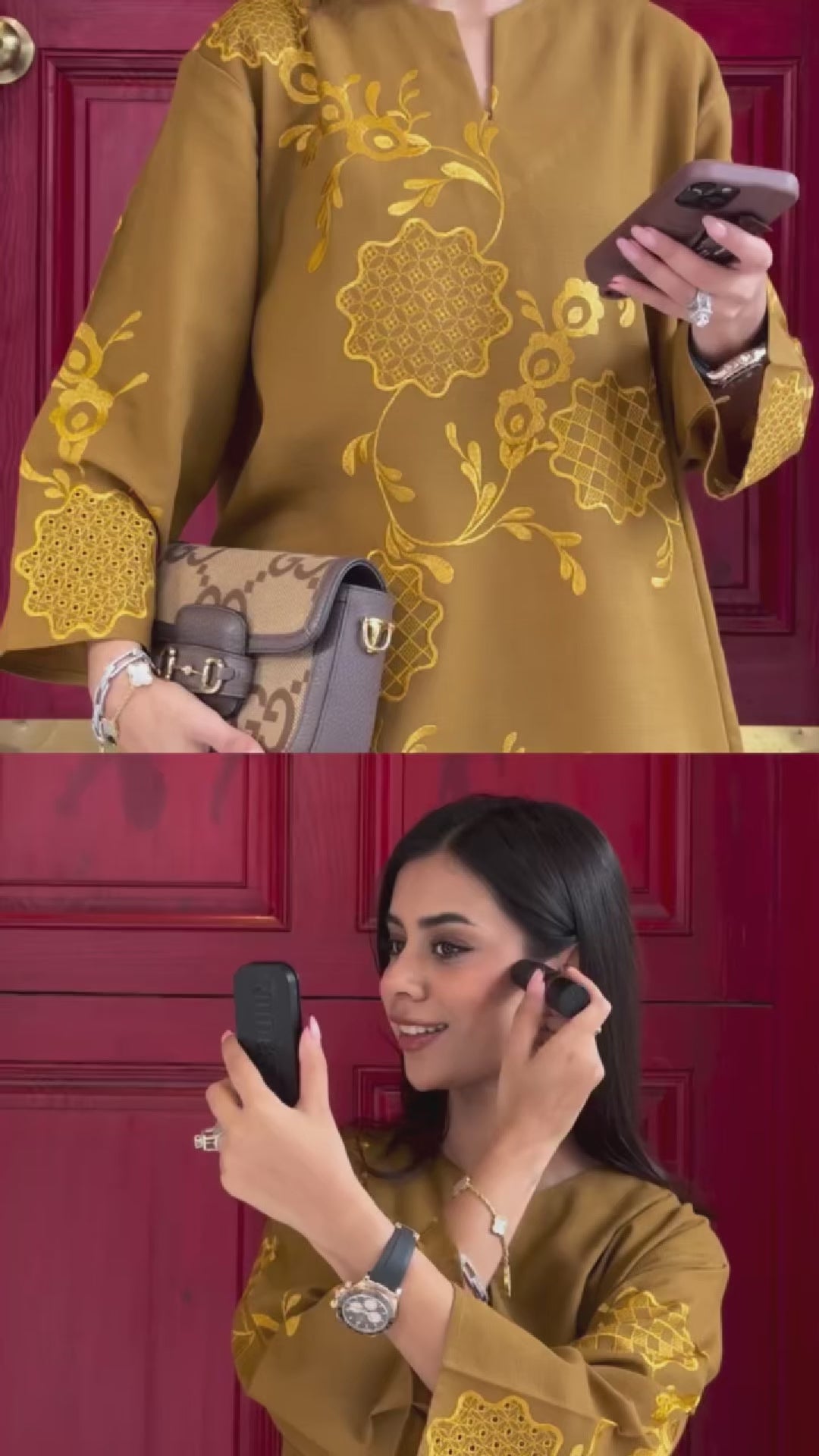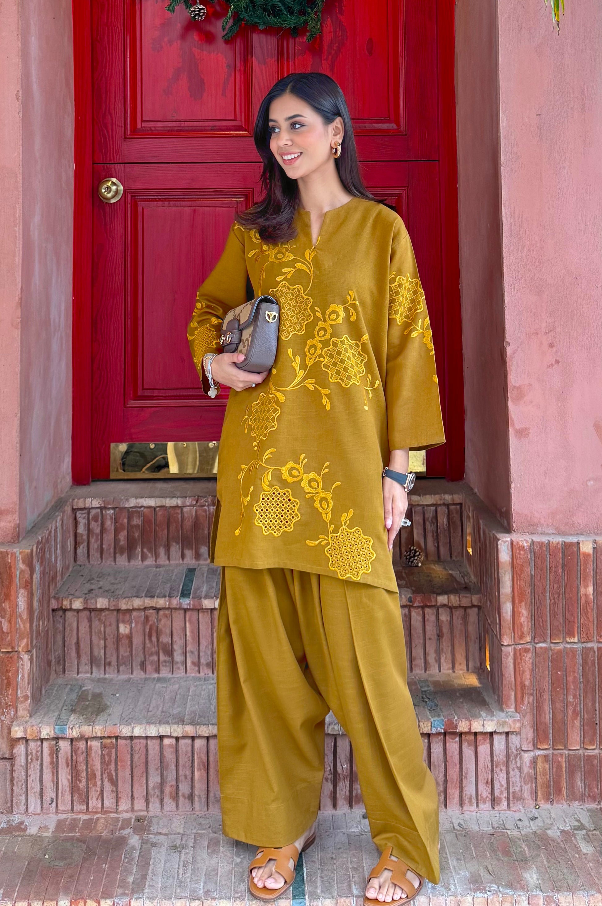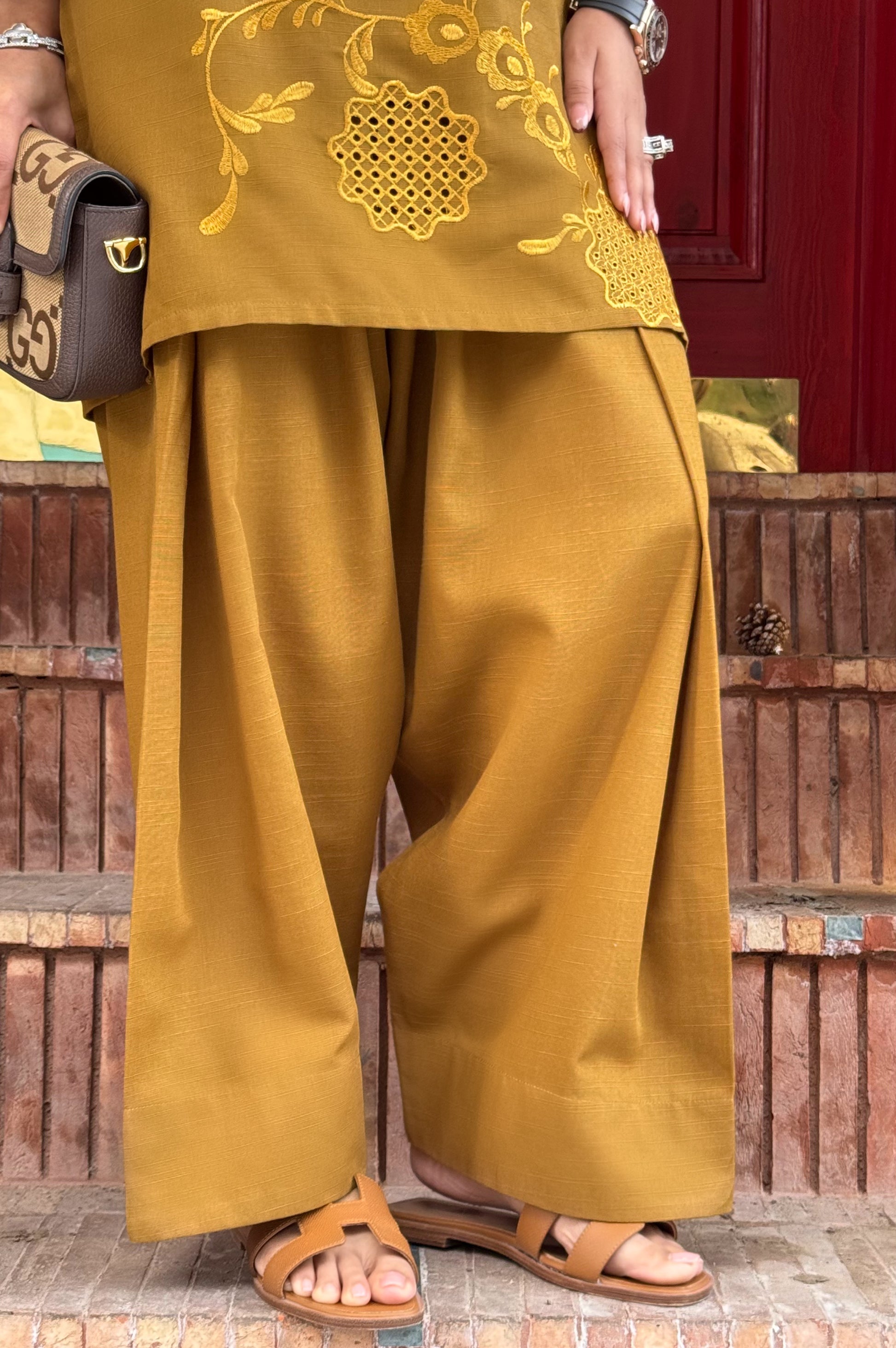 A mustard ochre co-ord set, featuring a straight kurta with relaxed sleeves, adorned with tonal floral embroidery cascading gracefully across the front. The kurta is designed with a clean round neckline finished with a subtle V-slit. Paired with a farshi shalwar, this ensemble blends comfort with elegance.
