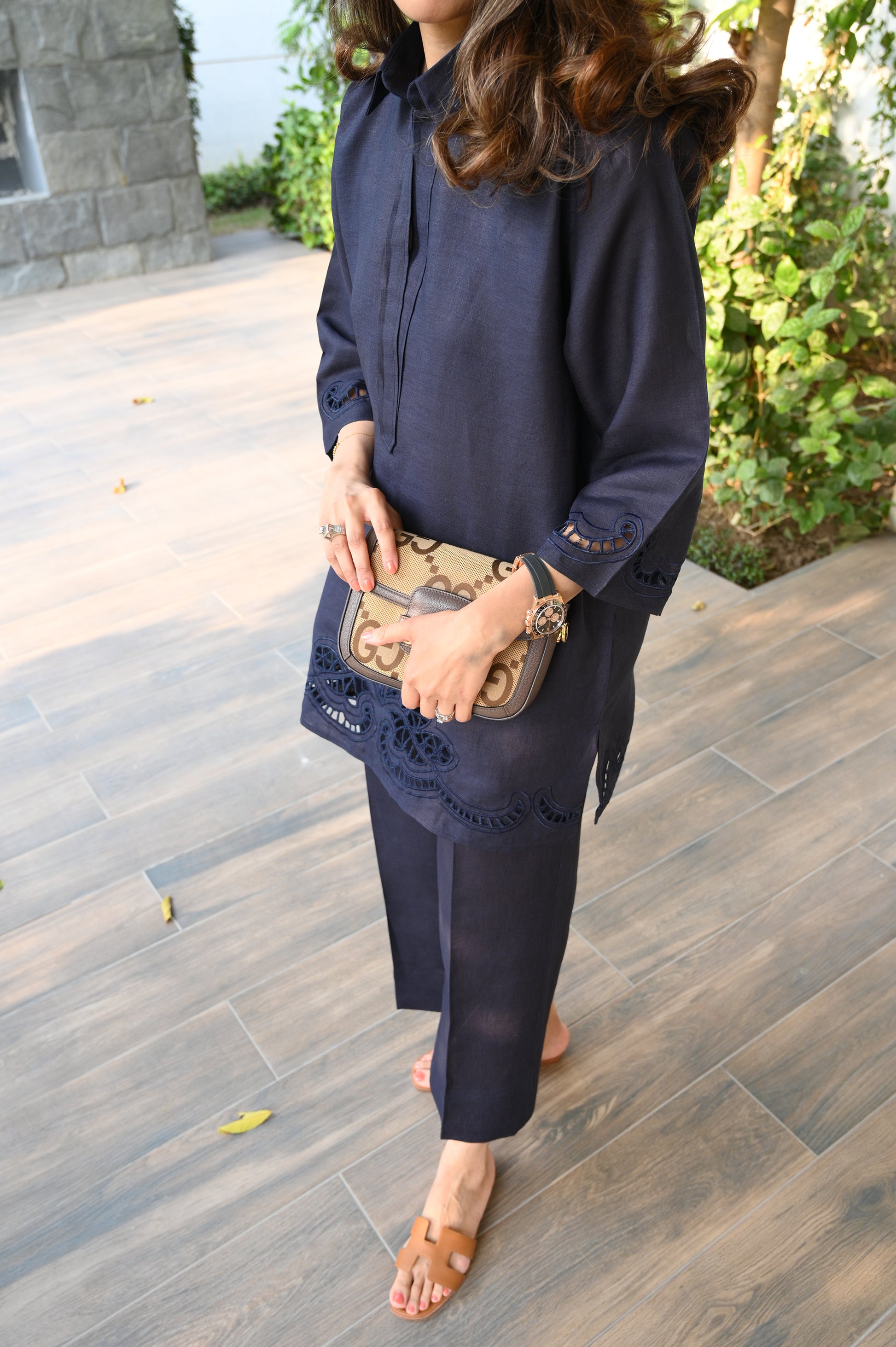 A Navy co-ord set, featuring a straight kurta with delicately detailed cutwork embroidery along the hem and sleeves. The design highlights an intricate pattern that adds depth and artistry to the rich tone. Finished with a classic slit neckline and paired with matching straight trousers, this ensemble embodies timeless sophistication with a modern, refined edge.
