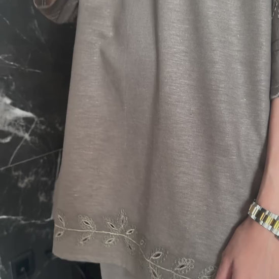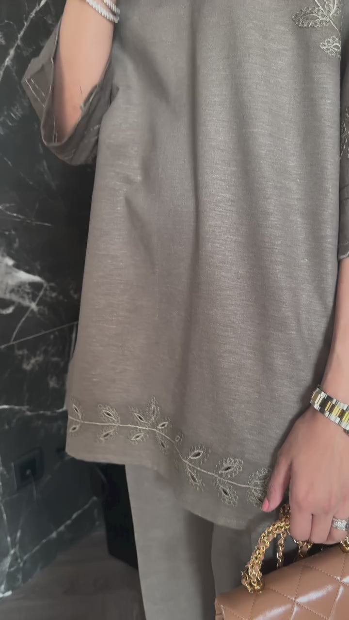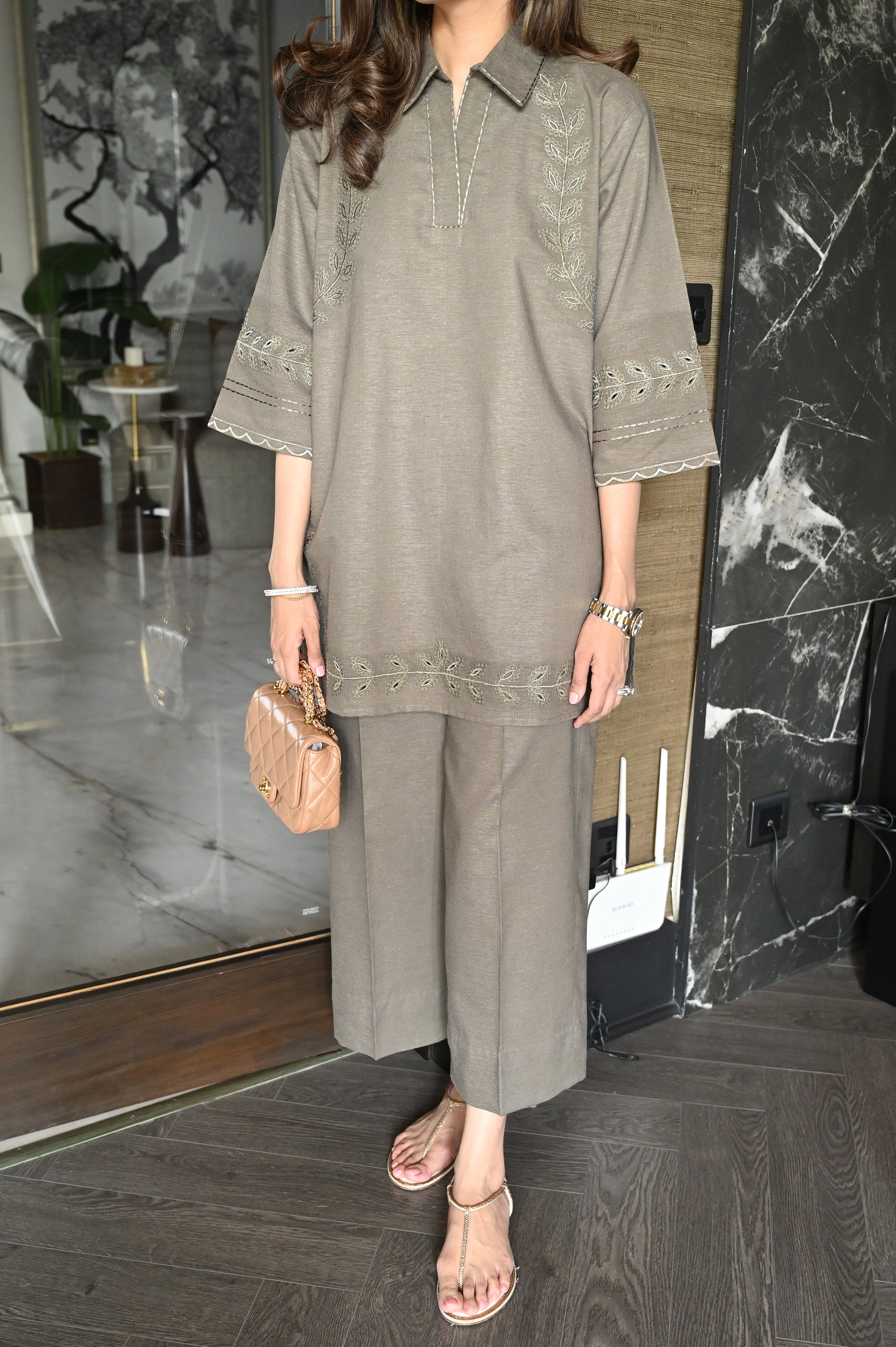 An olive two-piece set featuring a straight kurta with tonal embroidery along the sleeves and hem, accentuated with delicate side motifs. The kurta is styled with a subtle V-neckline and a collared design enhanced with stitch detailing, and is paired with wide-leg trousers for a graceful finish.