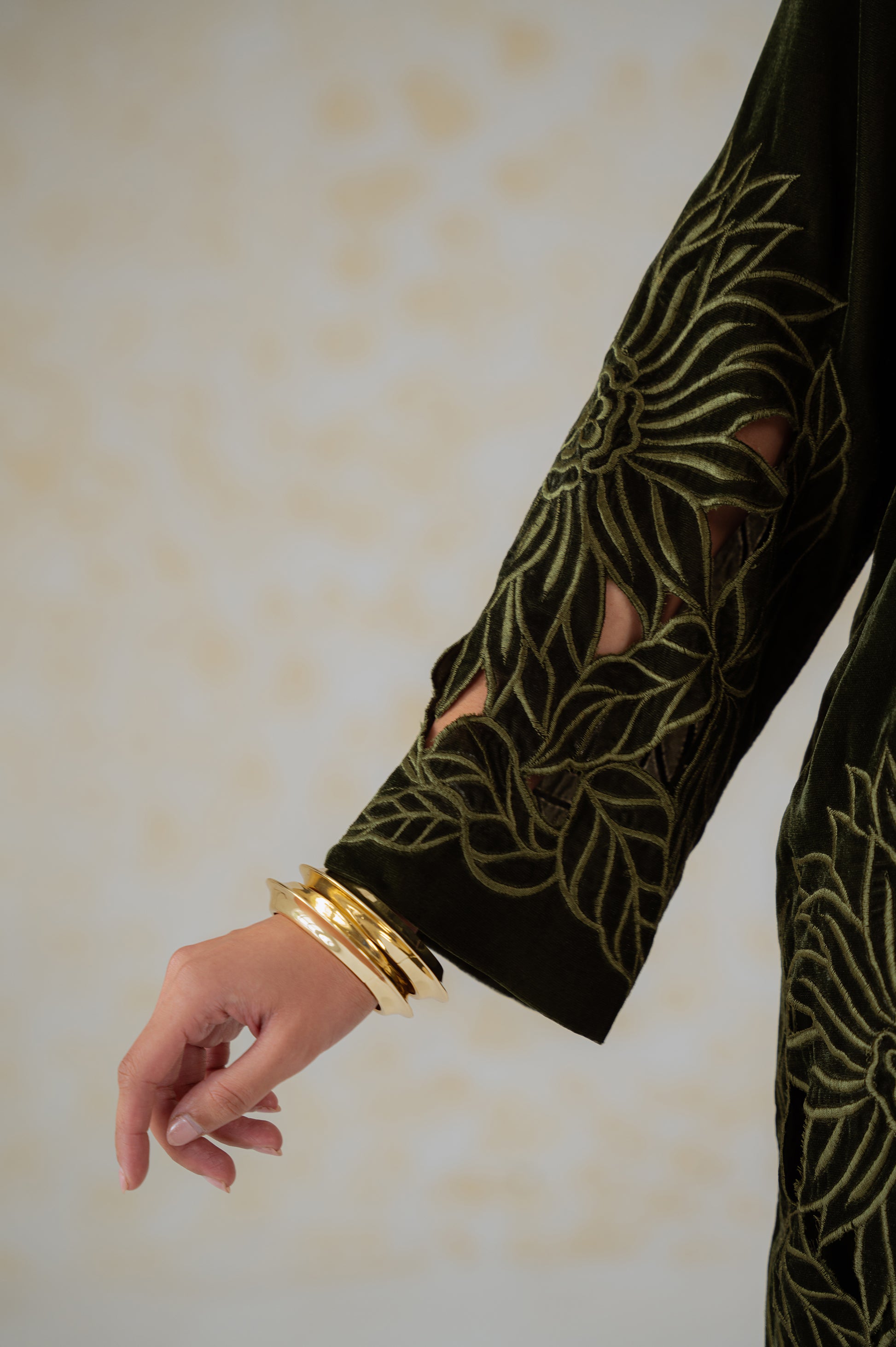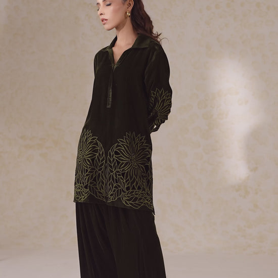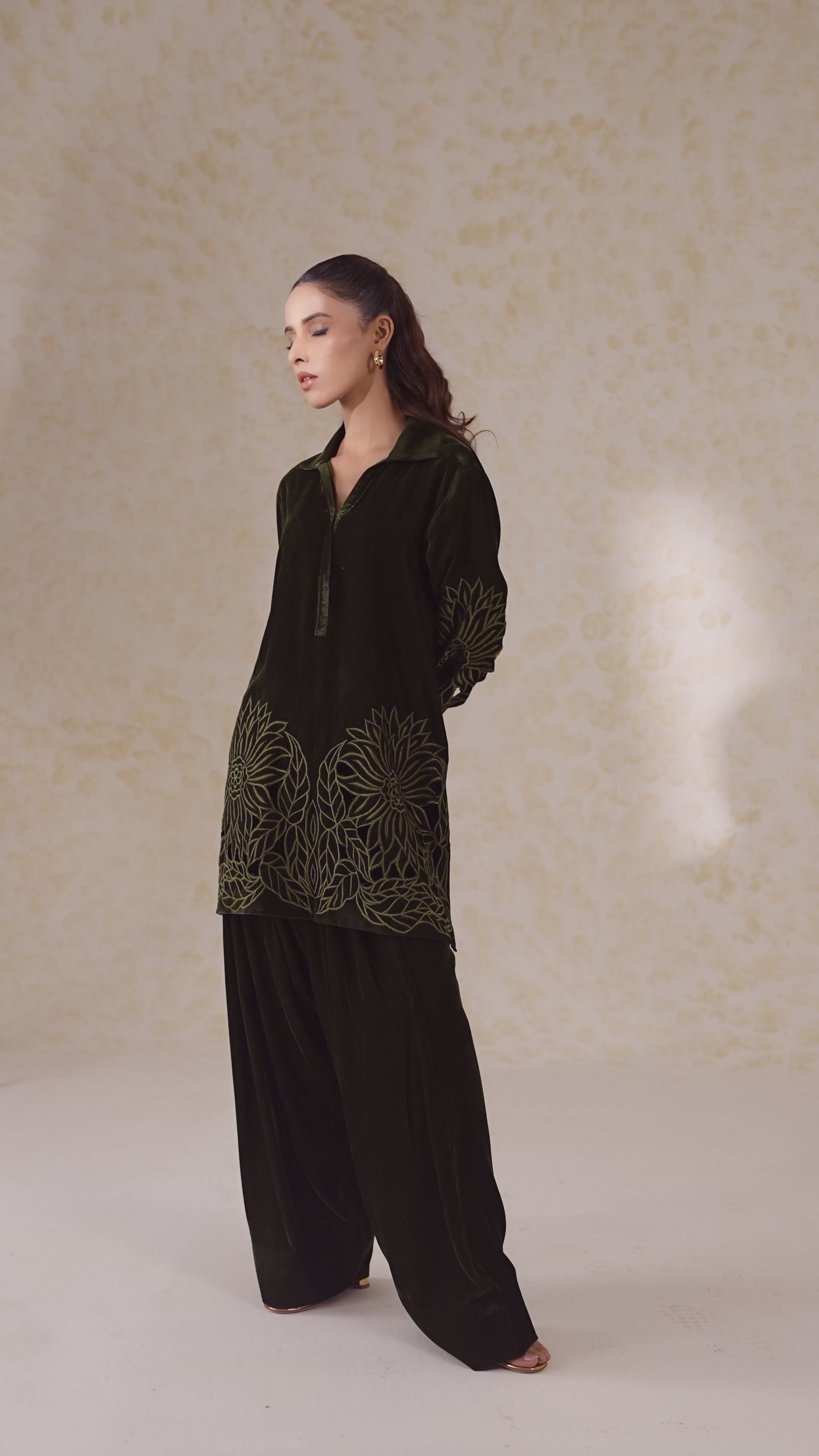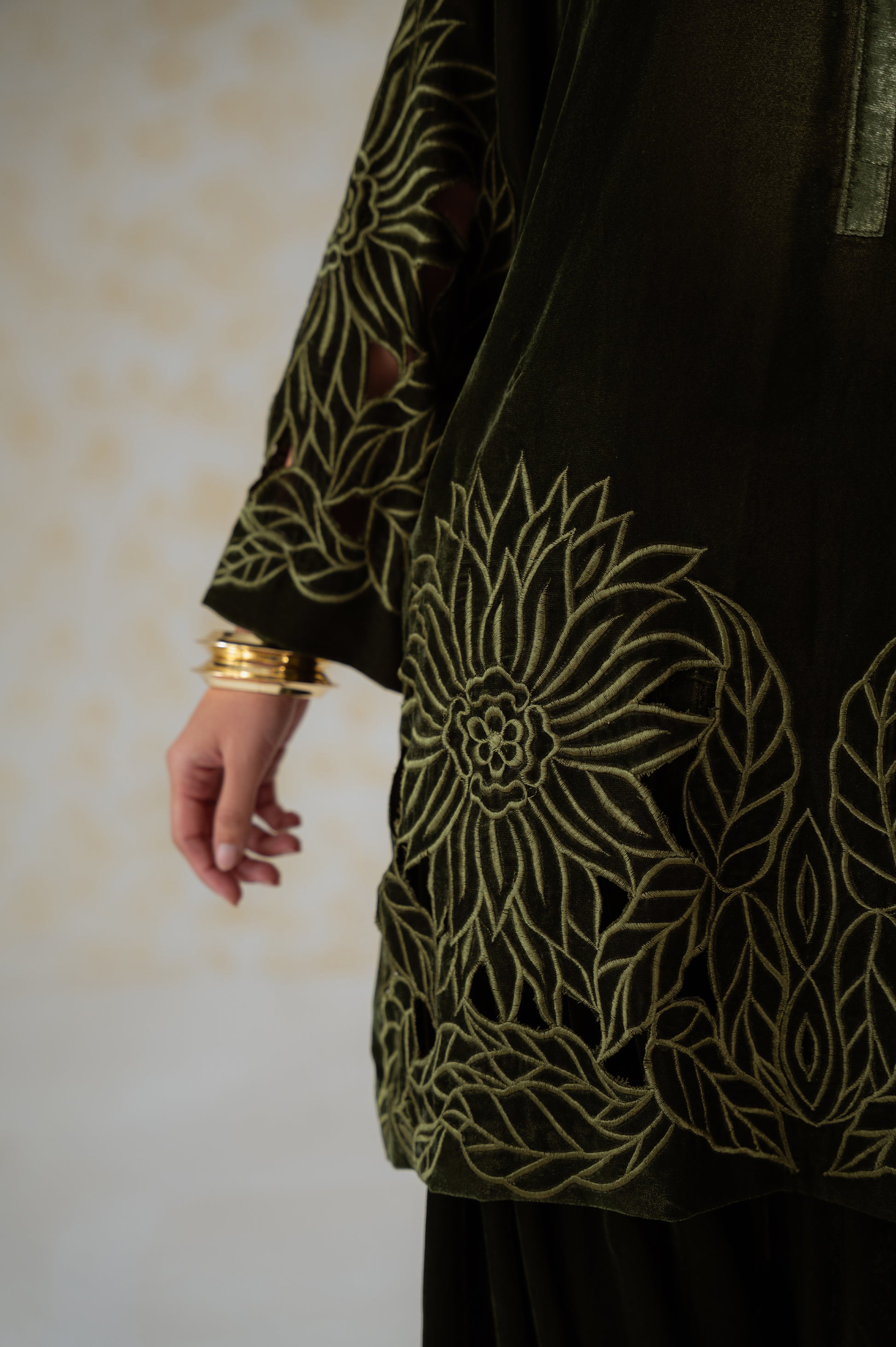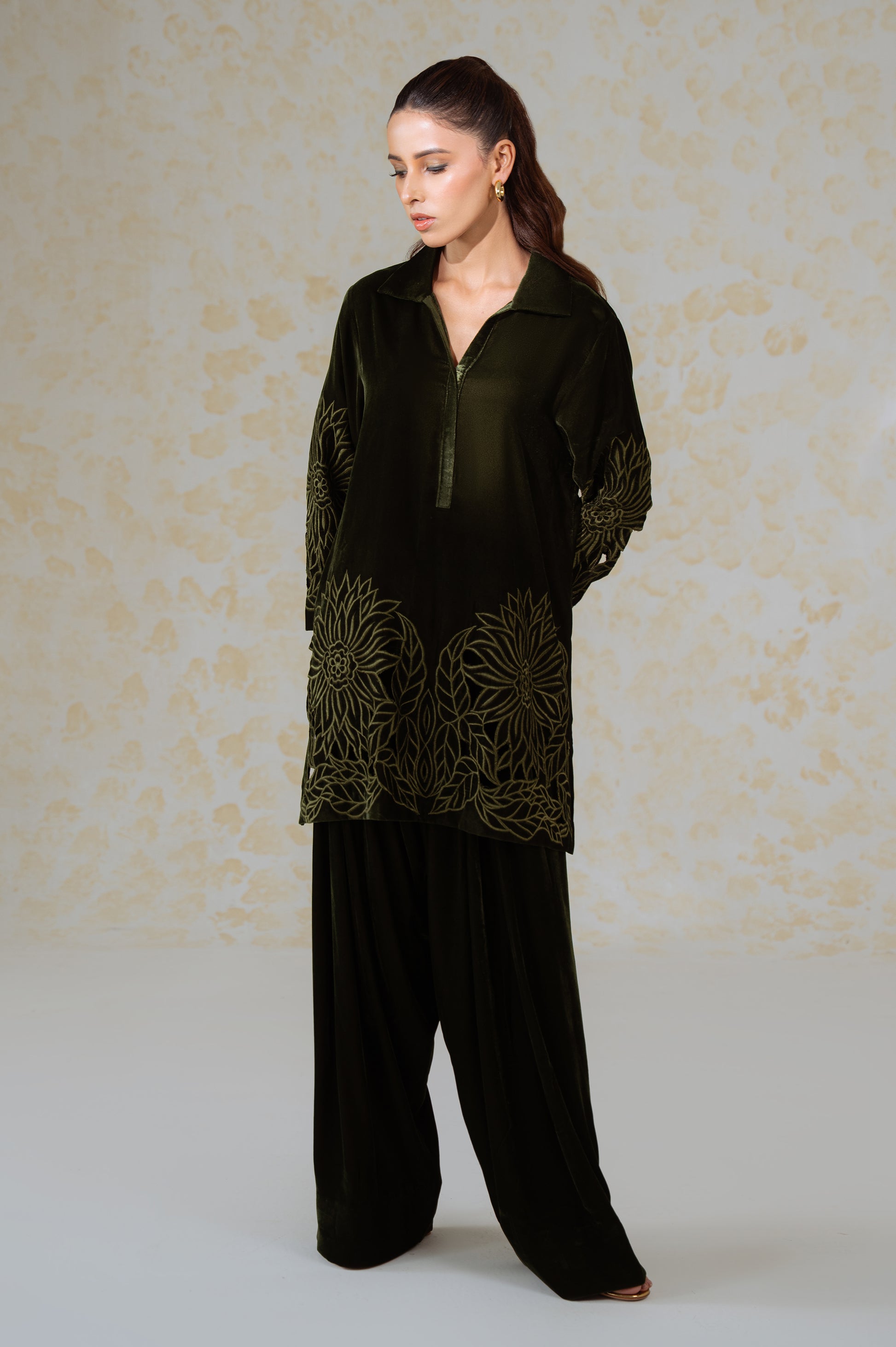 An olive green two-piece co-ord crafted from luxe velvet, featuring a straight kurta adorned with intricate machine embroidery and delicate cutwork detailing along the hem and sleeves. The kurta showcases a collared V-neckline and is paired with matching draped velvet shalwar, making it an elegant choice for evening soirées or festive gatherings.