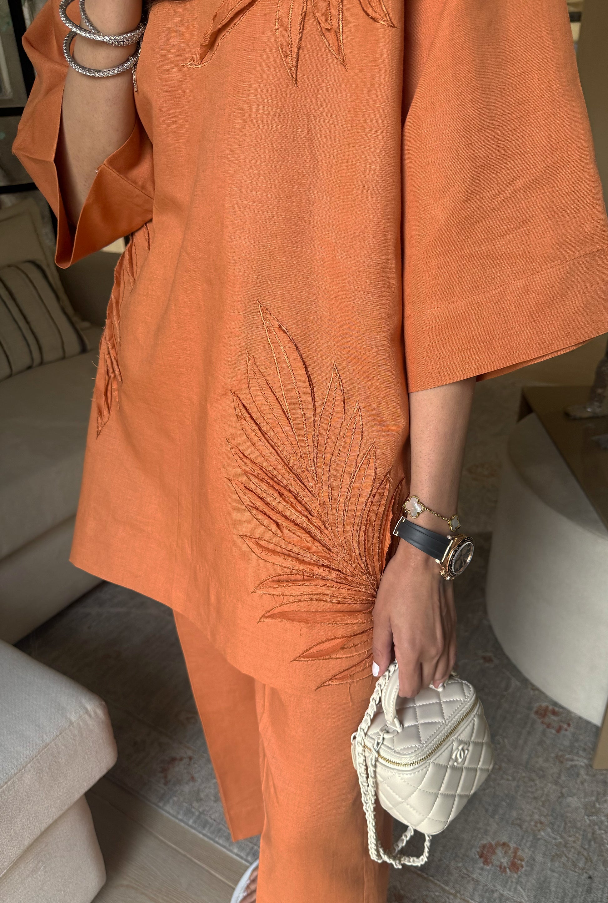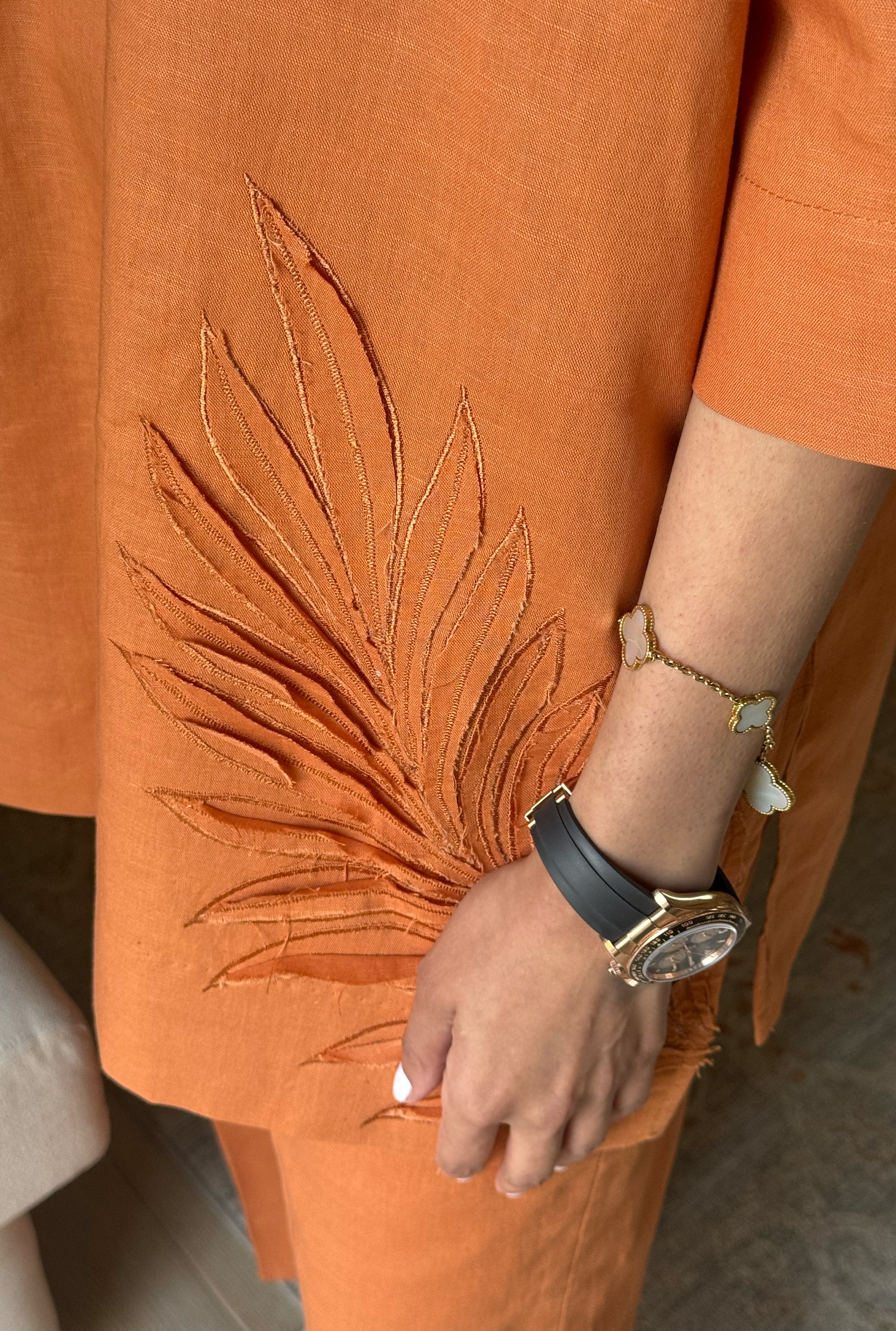 This 2-piece set in Peach Tan is made from Luxe Linen that feels incredibly soft & breathable. The shirt is designed with a relaxed, boxy fit and features raw-edged leaf appliqué work scattered across the front, adding a unique 3D texture to the minimalist base. Its wide, mid-length sleeves and simple V-neckline keep the look laid-back and modern. Paired with matching trousers, this set is all about balancing comfort with a distinct, artisanal touch.