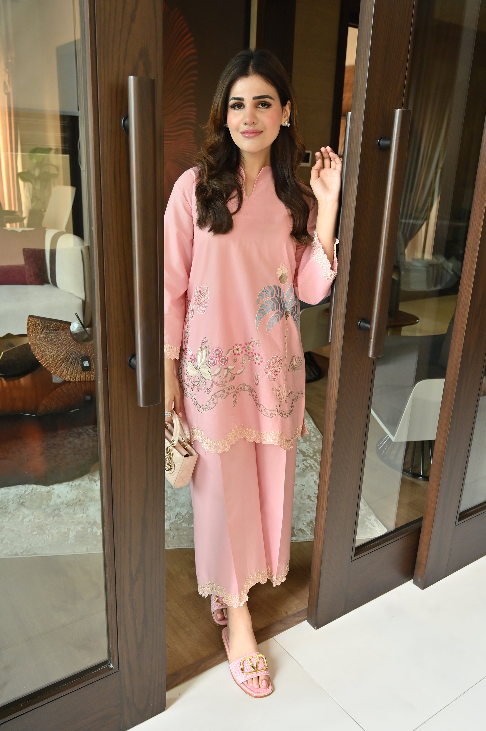 This 2-piece set comes in a soft pink shade, designed for graceful everyday styling with delicate embroidery accents. The kurta features a relaxed straight silhouette with a minimal neckline, adorned with subtle floral and scenic motifs across the front. Intricate threadwork along the sleeves and scalloped hem adds a refined touch while keeping the look light and elegant. Paired with matching wide-leg shalwar, finished with coordinated embroidered borders, this set offers a comfortable and polished silhouette.