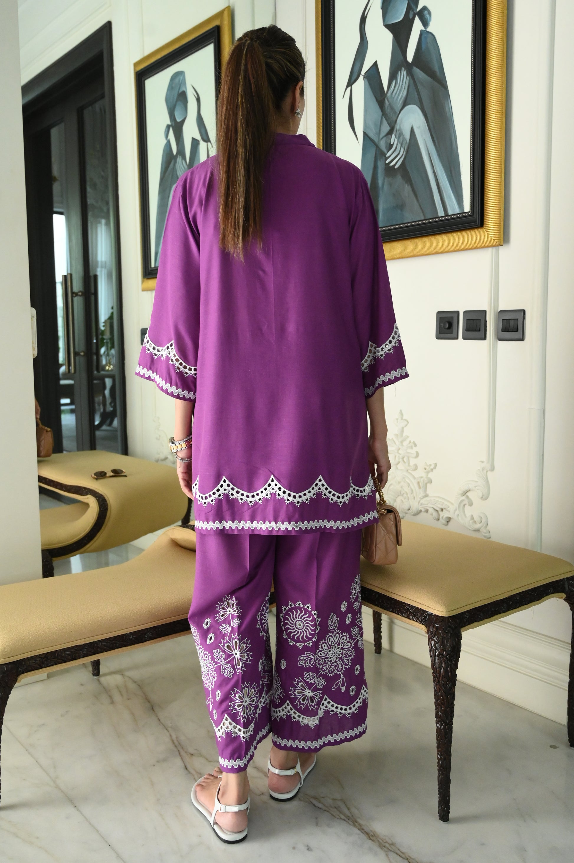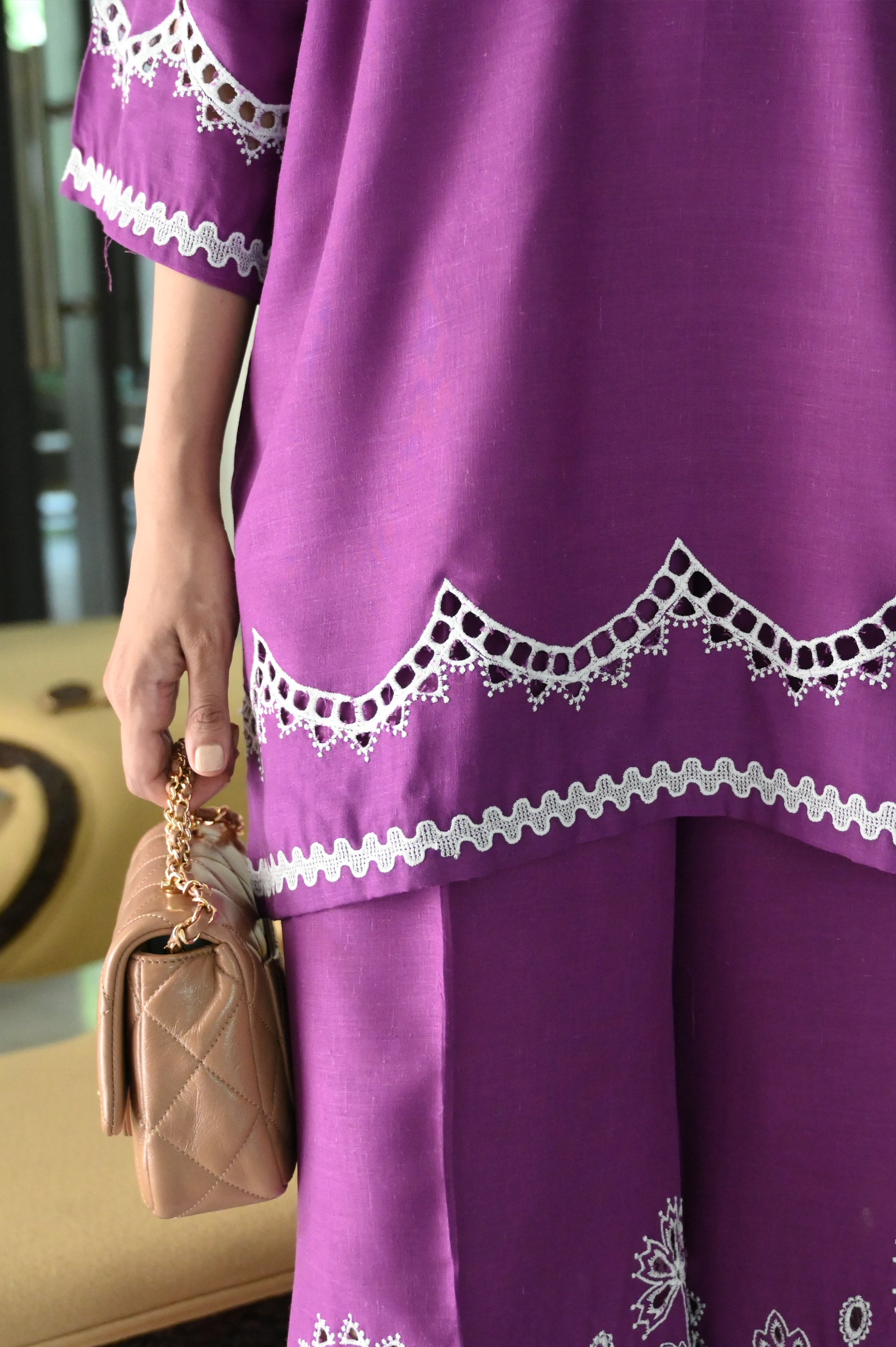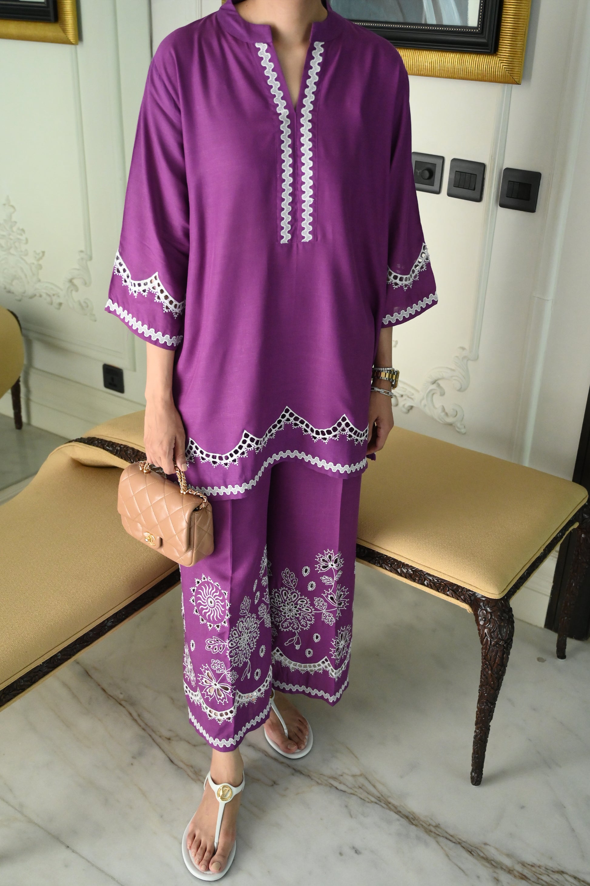 Features a deep purple shirt adorned with scalloped lace and delicate cutwork embroidery along the neckline, sleeves, and hem—paired with matching culottes beautifully detailed with floral embroidered borders.