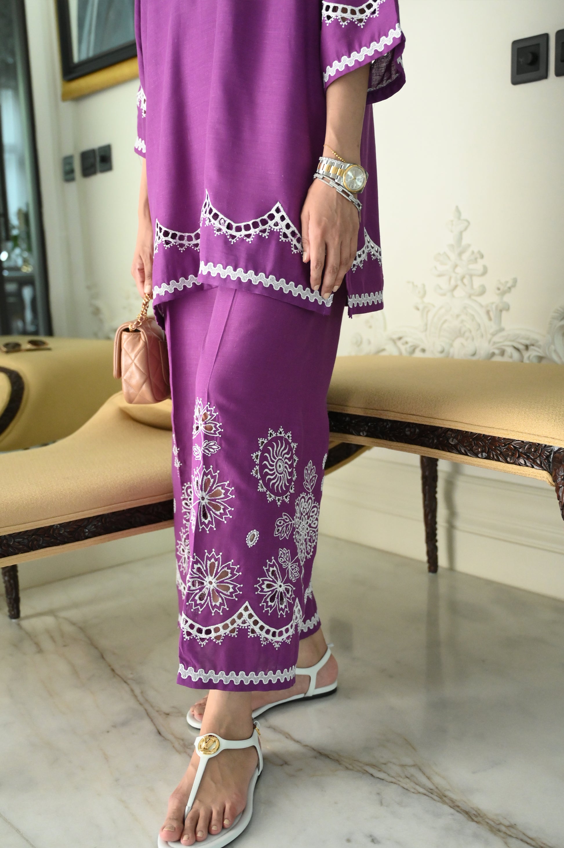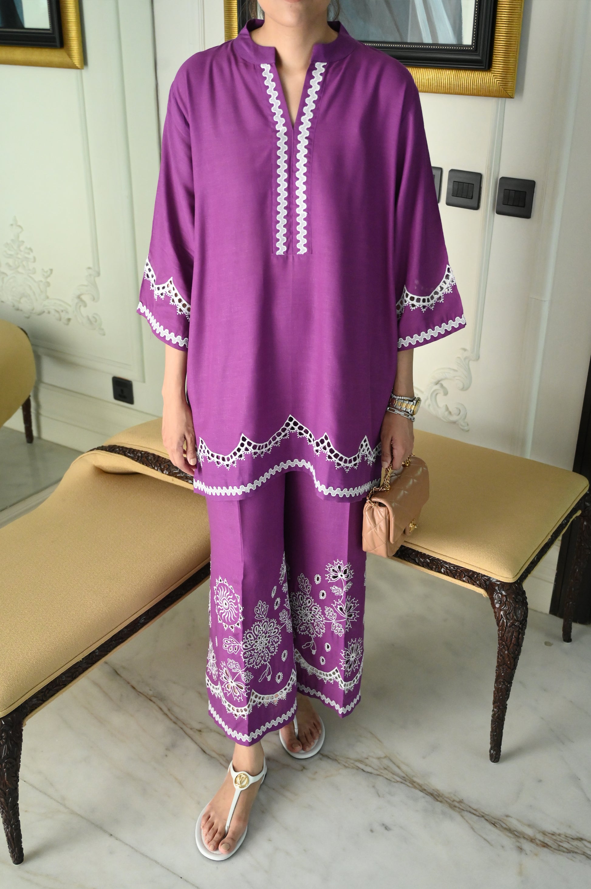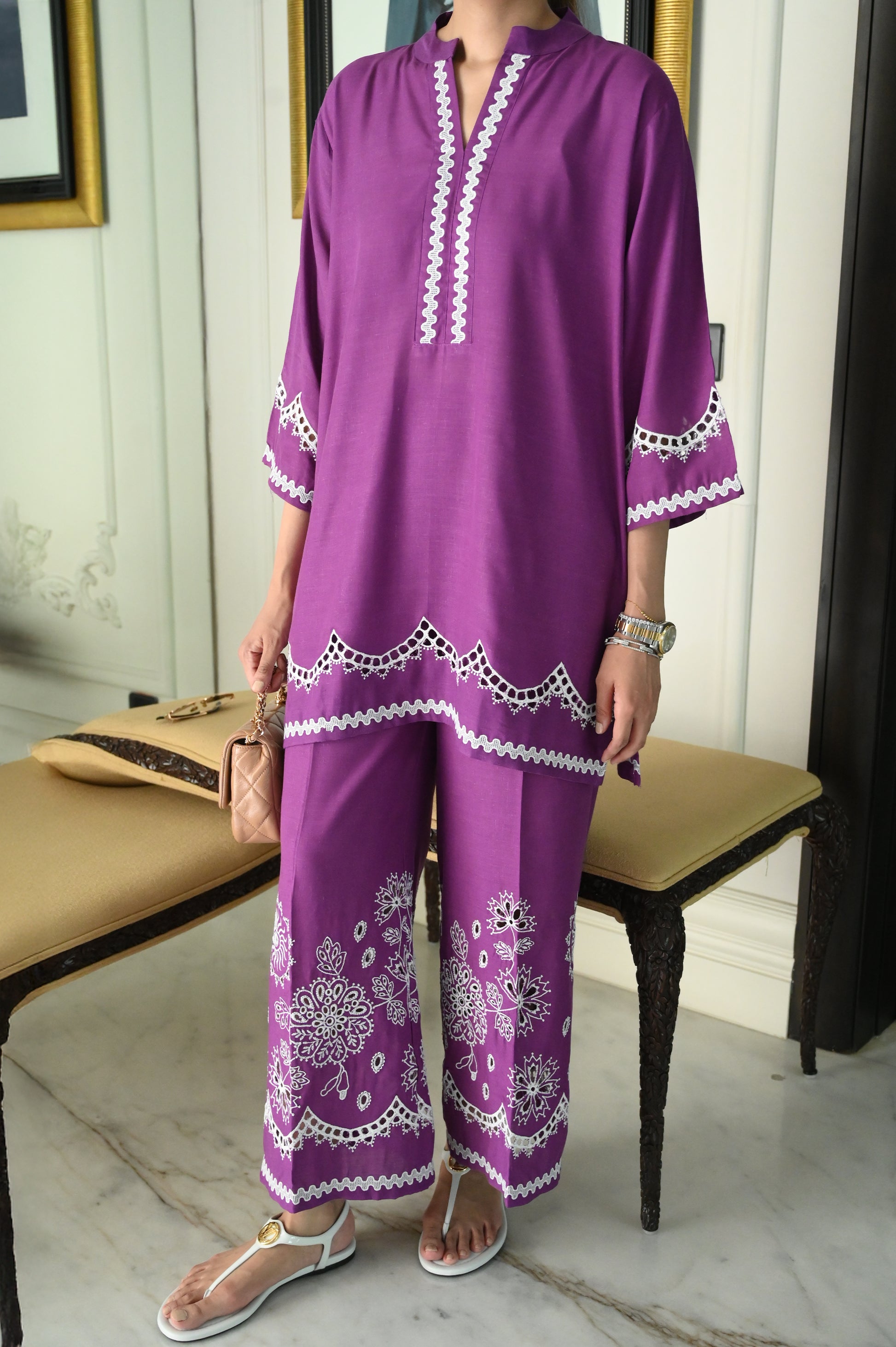 Features a deep purple shirt adorned with scalloped lace and delicate cutwork embroidery along the neckline, sleeves, and hem—paired with matching culottes beautifully detailed with floral embroidered borders.