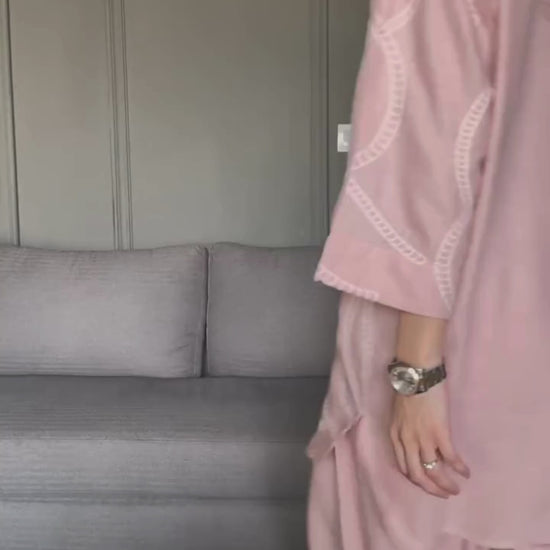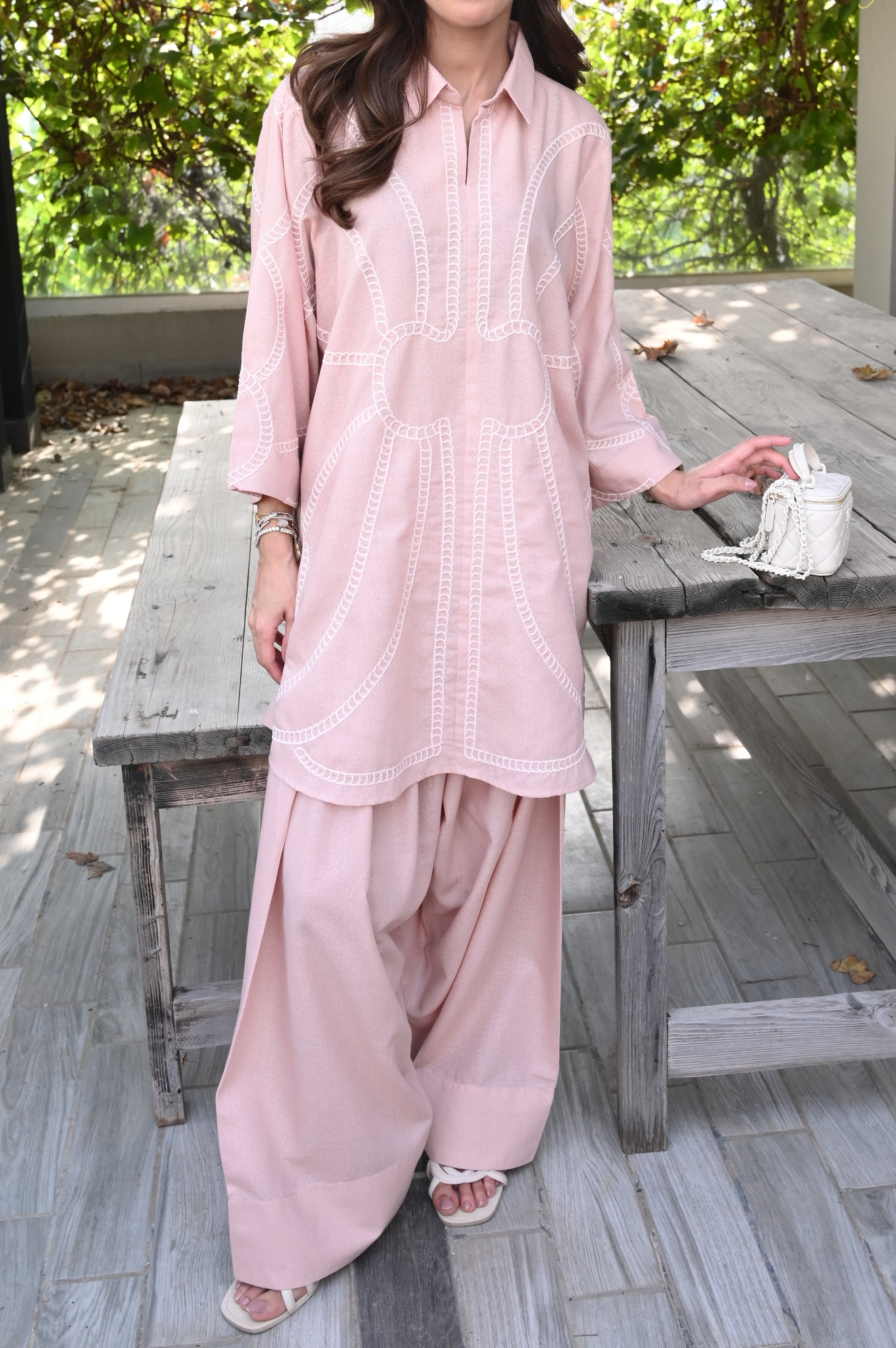 A soft pink loose-fit kurta with minimal stitching patterned embroidery over all across the front, paired with a regular Shalwar. The kurta has a collared neckline giving it a modern yet graceful touch.
