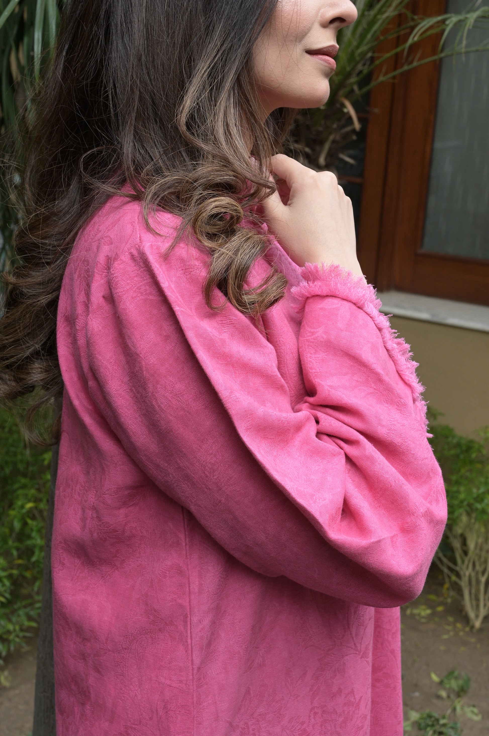 This pink jacquard linen dress is designed for days when you want comfort without losing style. Made from breathable jacquard linen, it has a soft texture with subtle woven detailing that adds depth to the look. The straight, relaxed silhouette makes it easy to wear, while the raw edge finishes along the hem and side slit add a modern, effortless touch. Finished with a simple neckline and full sleeves, this dress works well for daytime gatherings or casual outings.