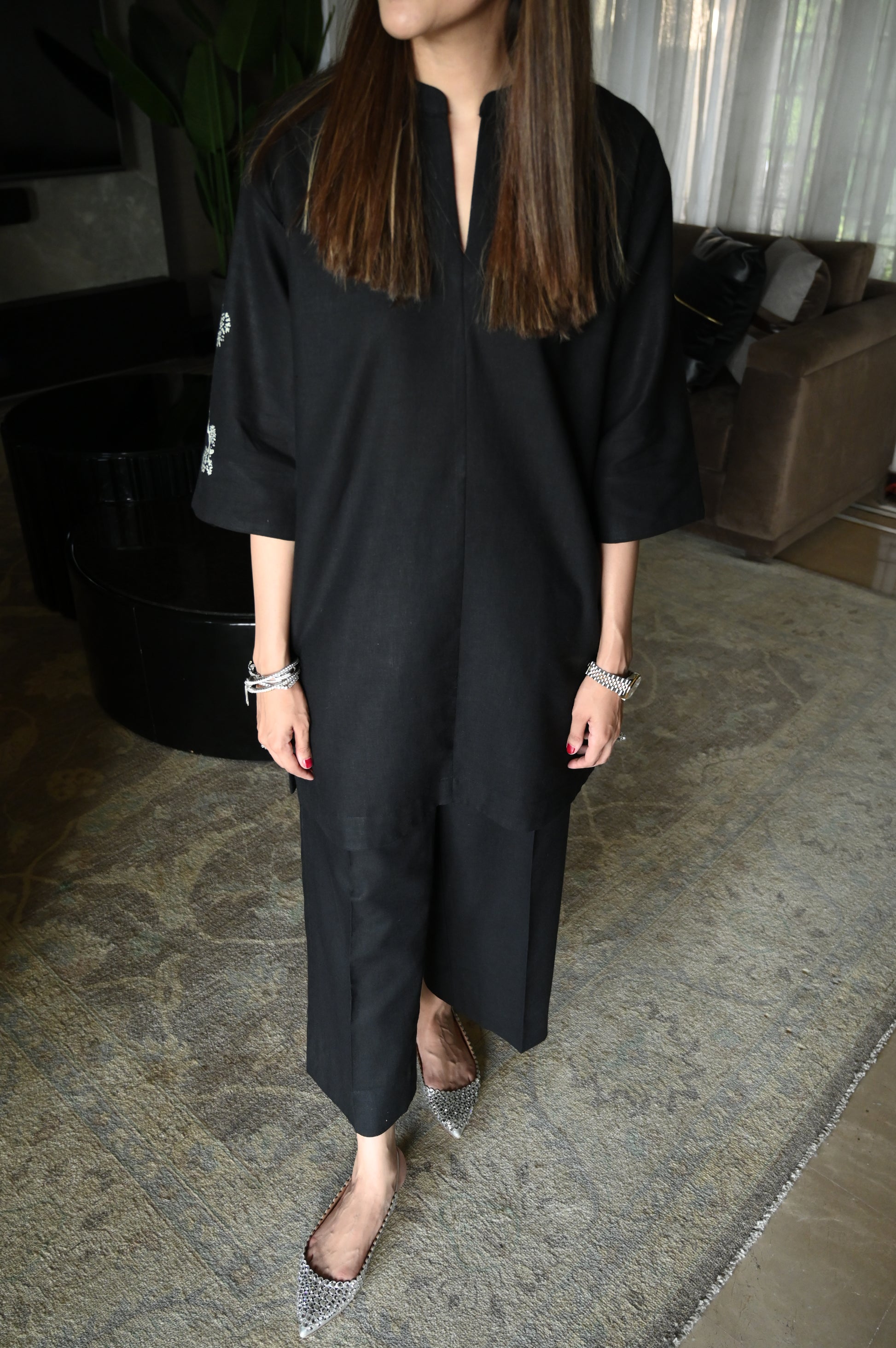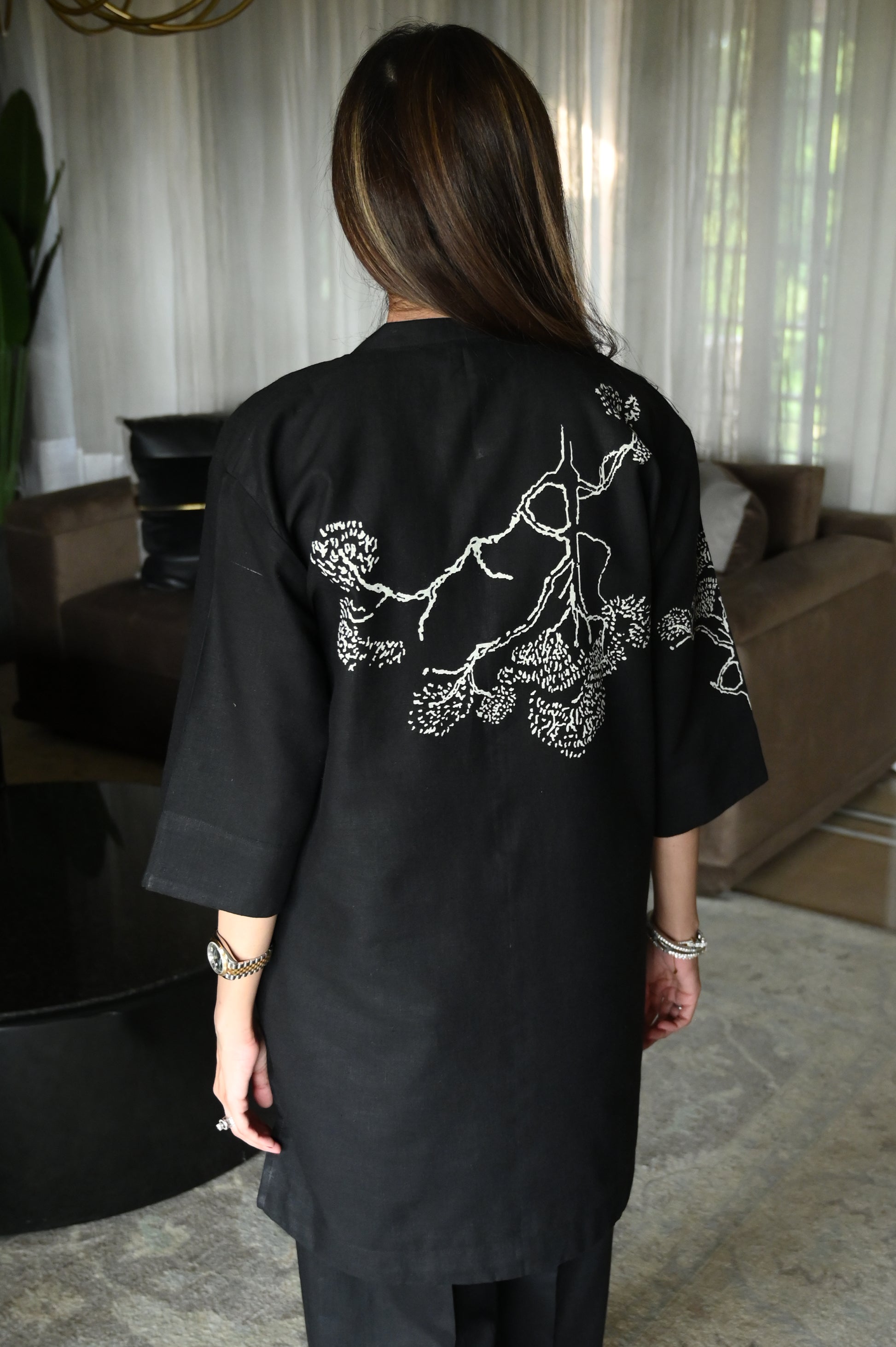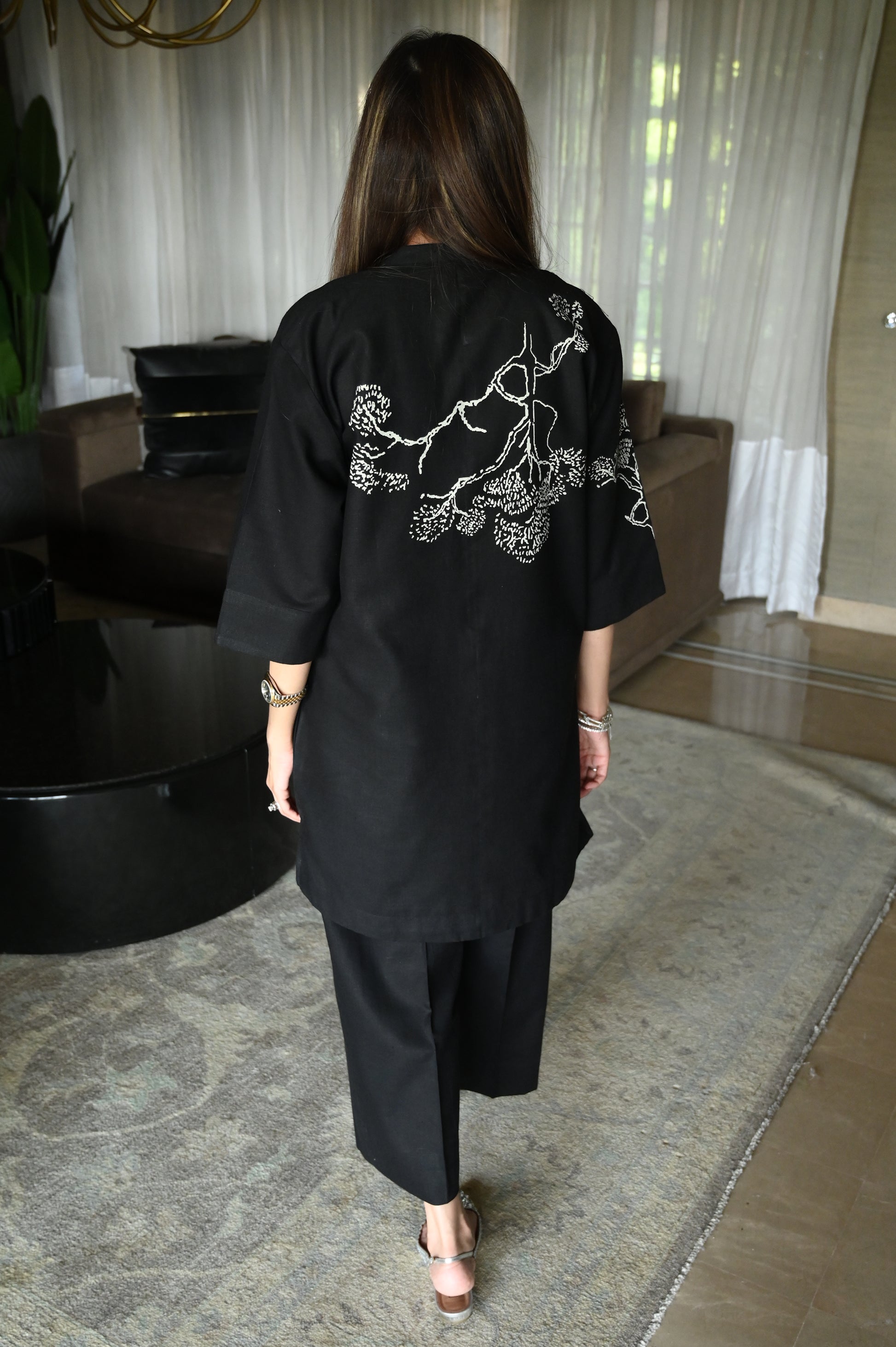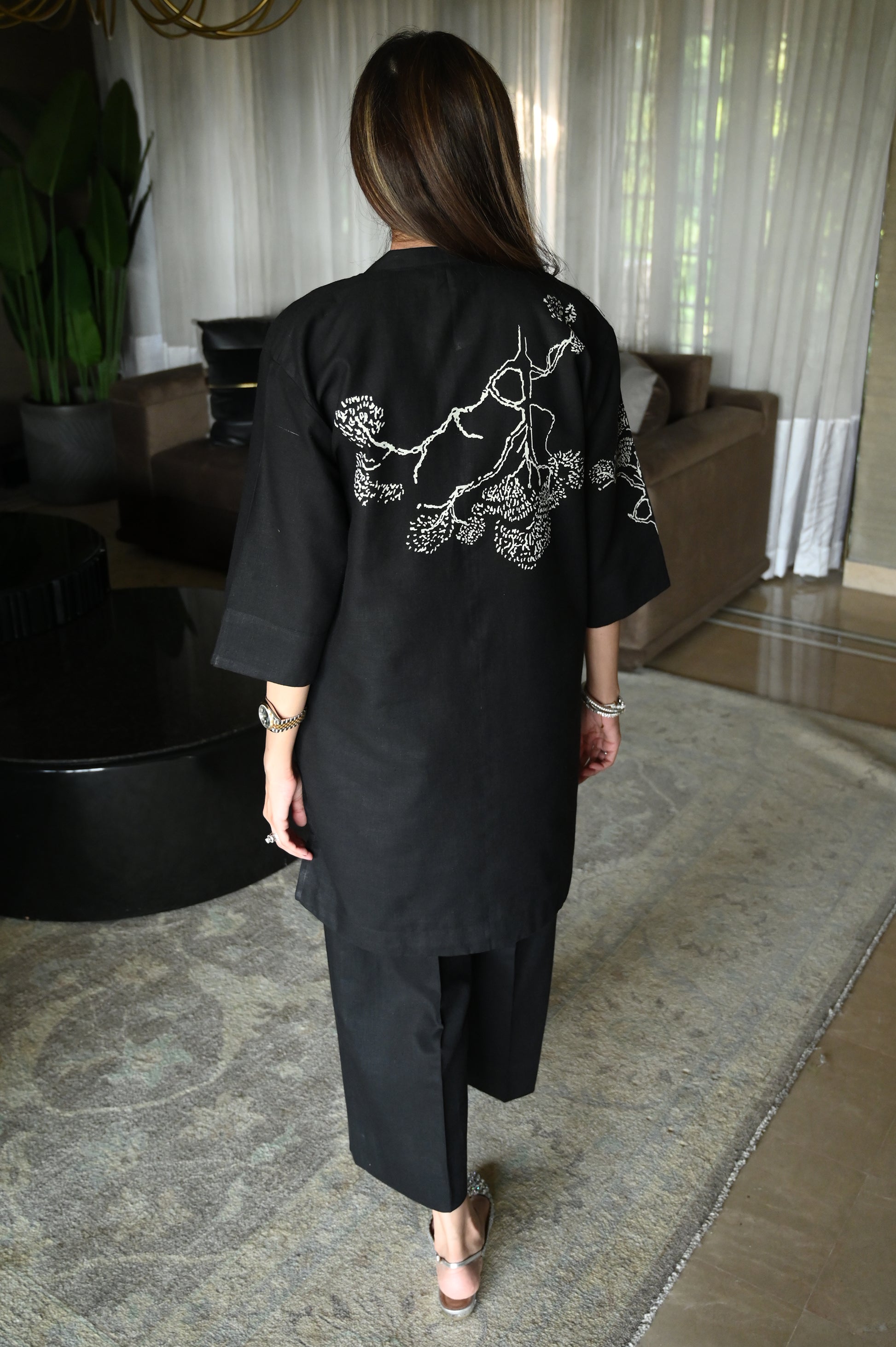 A black co-ord set featuring a straight kurta with intricate white printed botanical branch motifs on the back and sleeves. Paired with tailored straight trousers, this look exudes minimal elegance with a touch of artistic detail.
