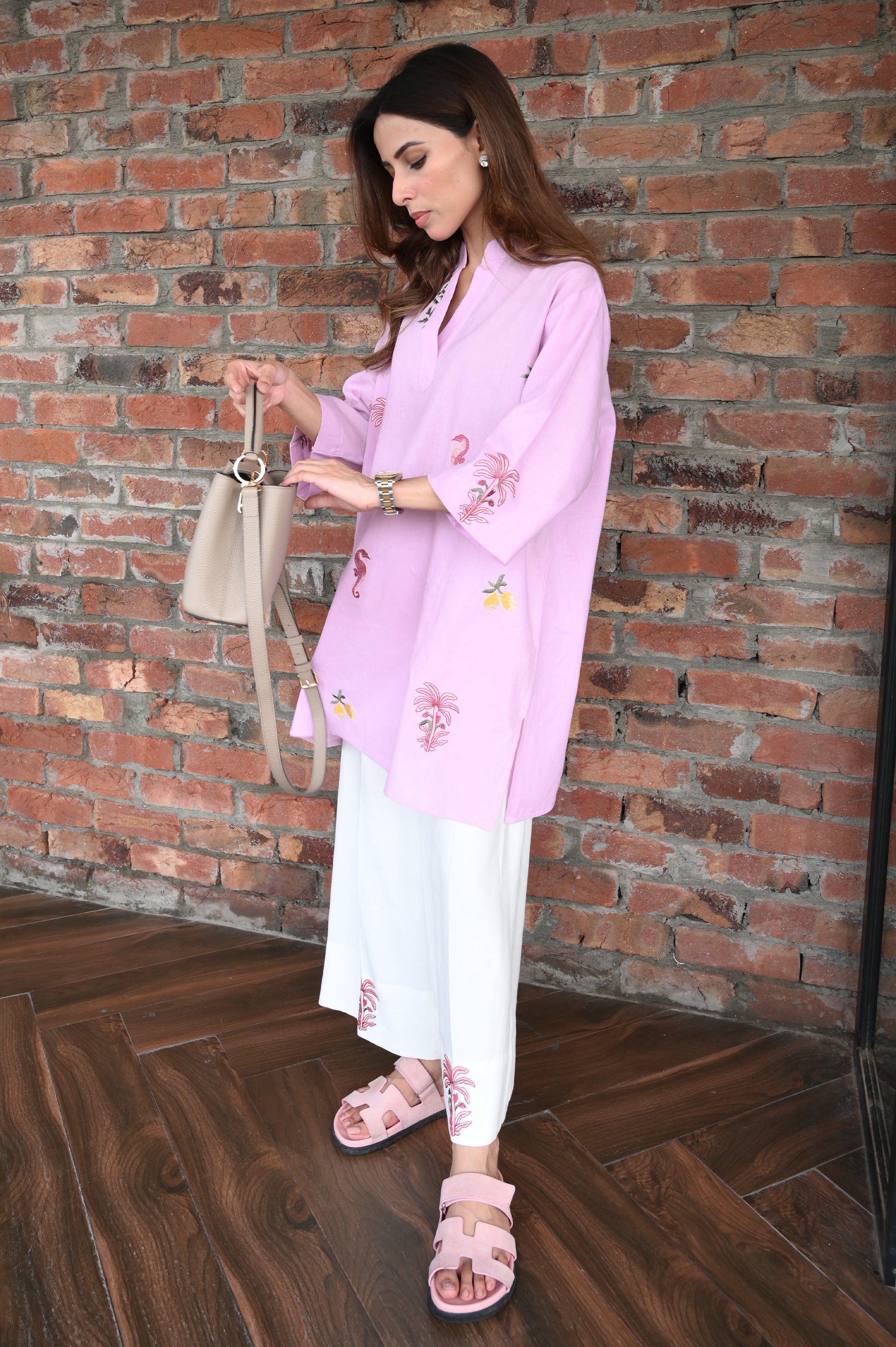 Step into effortless elegance with this soft lilac kurta, adorned with whimsical embroidered motifs like seahorses, lemons, and tropical elements. The relaxed silhouette and clean V-slit neckline offer comfort and style in one, while the lilac hue brings a refreshing twist to your summer wardrobe. Paired with white trousers featuring matching embroidery, this look is perfect for daytime outings or casual get-togethers.