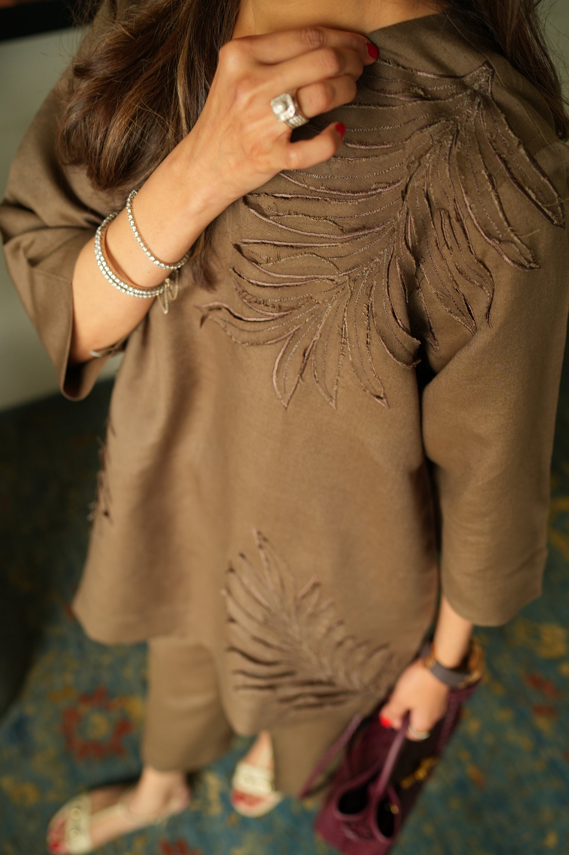 This 2-piece set is designed with subtle detailing that adds depth to the look. The shirt comes in a soft earthy brown tone, featuring delicate tonal embroidery inspired by leaf motifs placed across the front. Paired with matching straight trousers, the set feels balanced and comfortable for all-day wear.