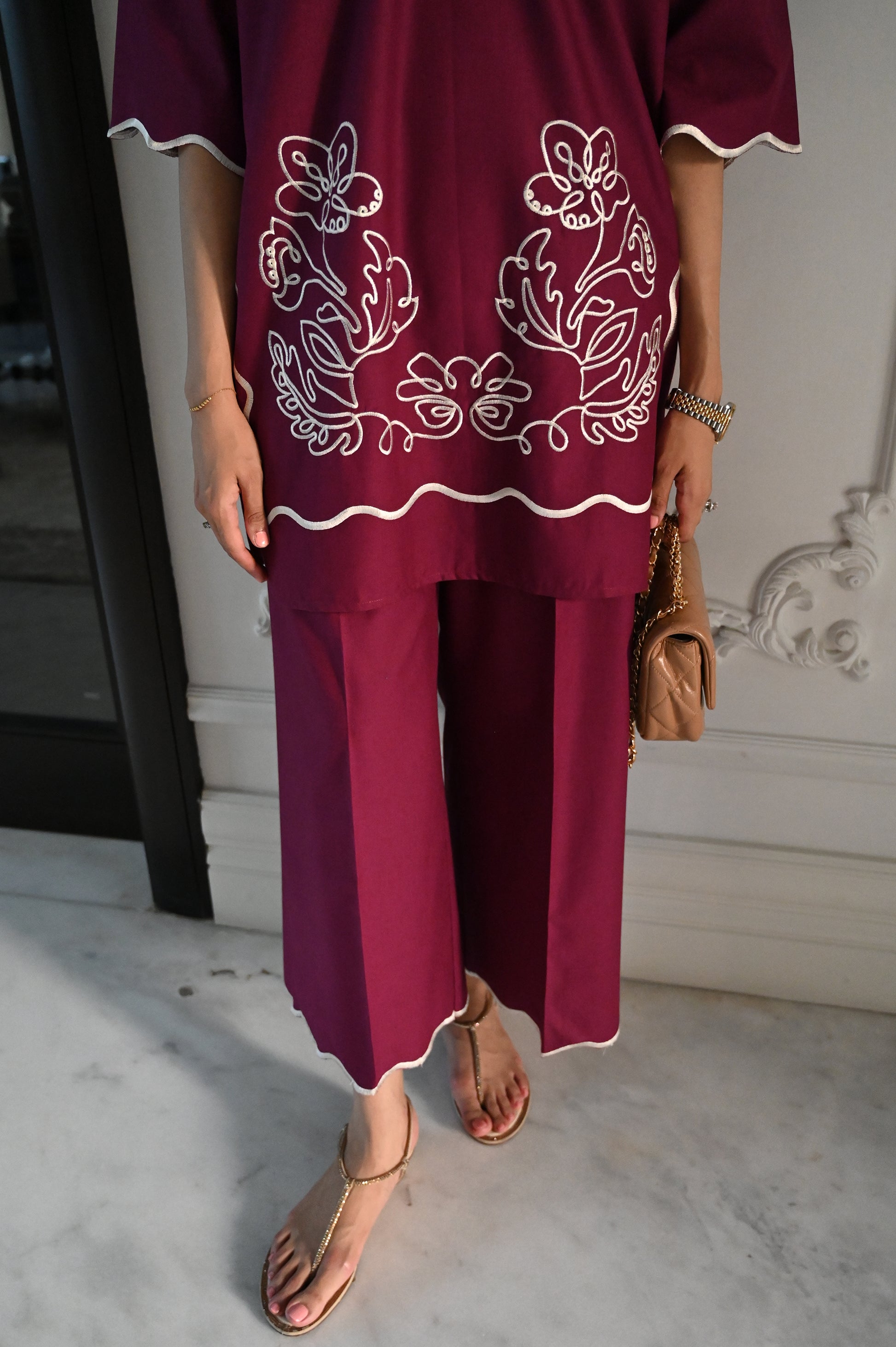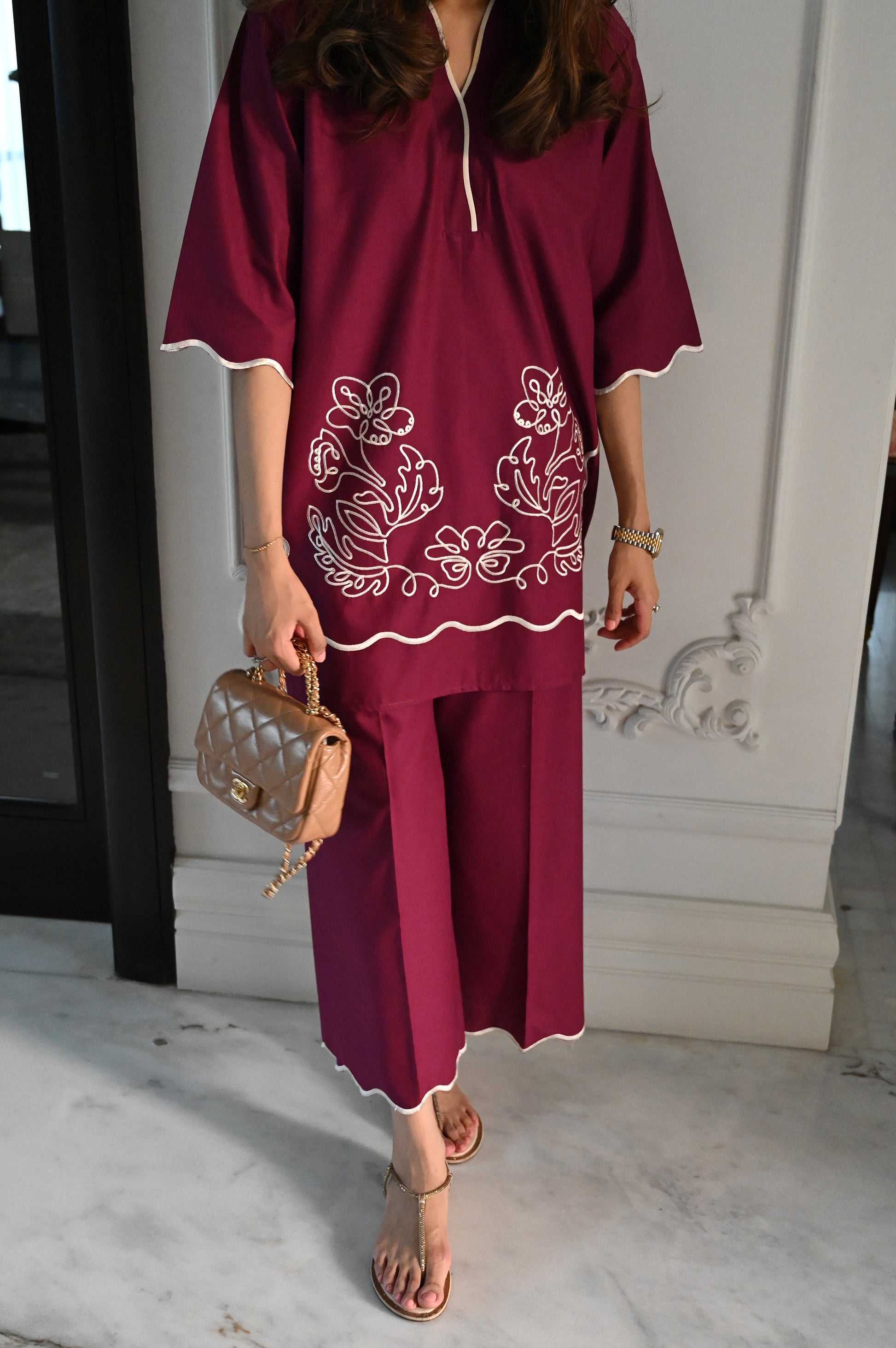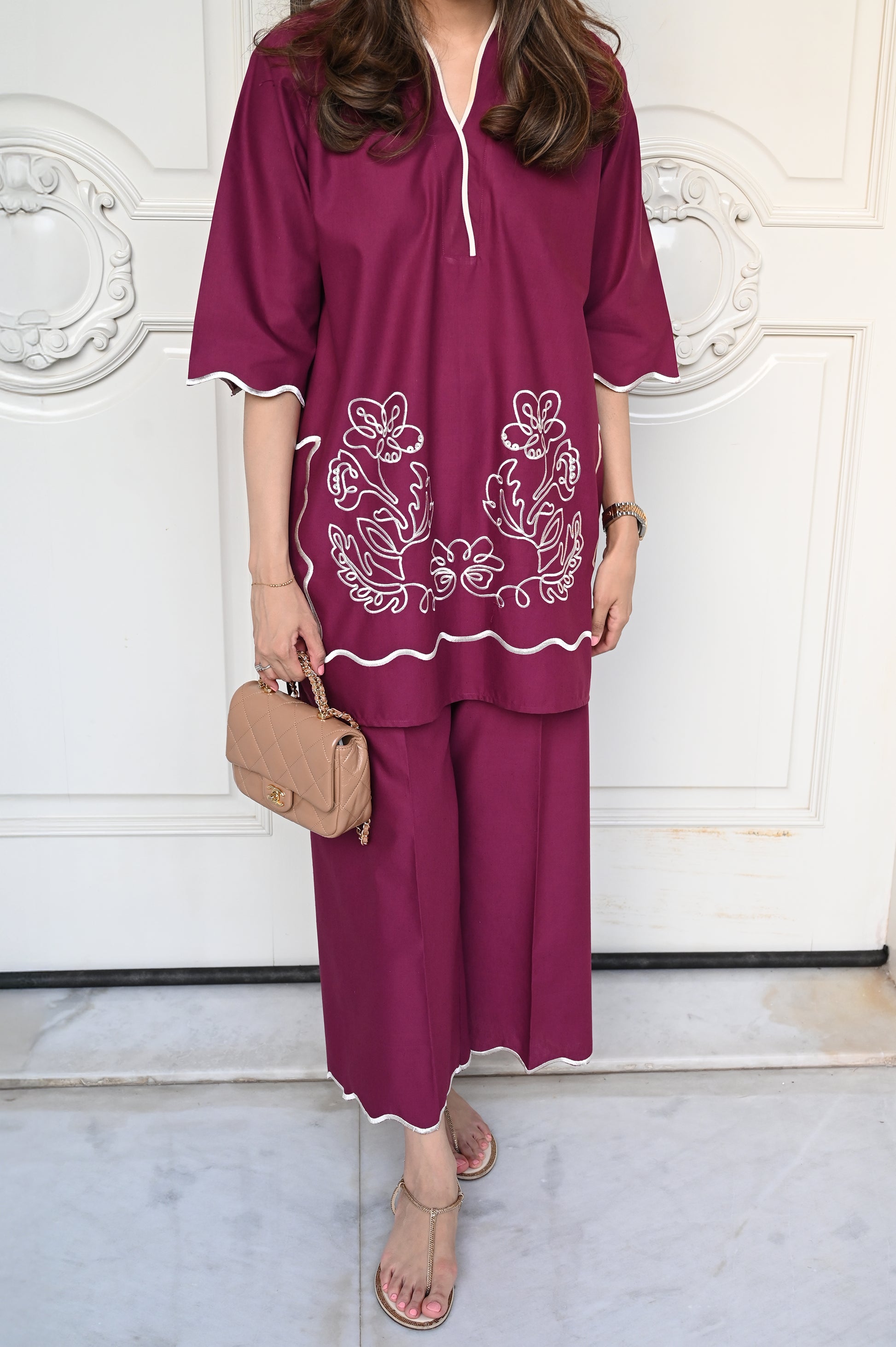 A plum two-piece ensemble featuring a straight kurta with white embroidered floral motifs and scalloped edging at the hem. The kurta has a subtle V-slit neckline with white piping for contrast. It is paired with wide-leg trousers finished with matching scalloped detailing, giving the outfit a modern yet elegant look.