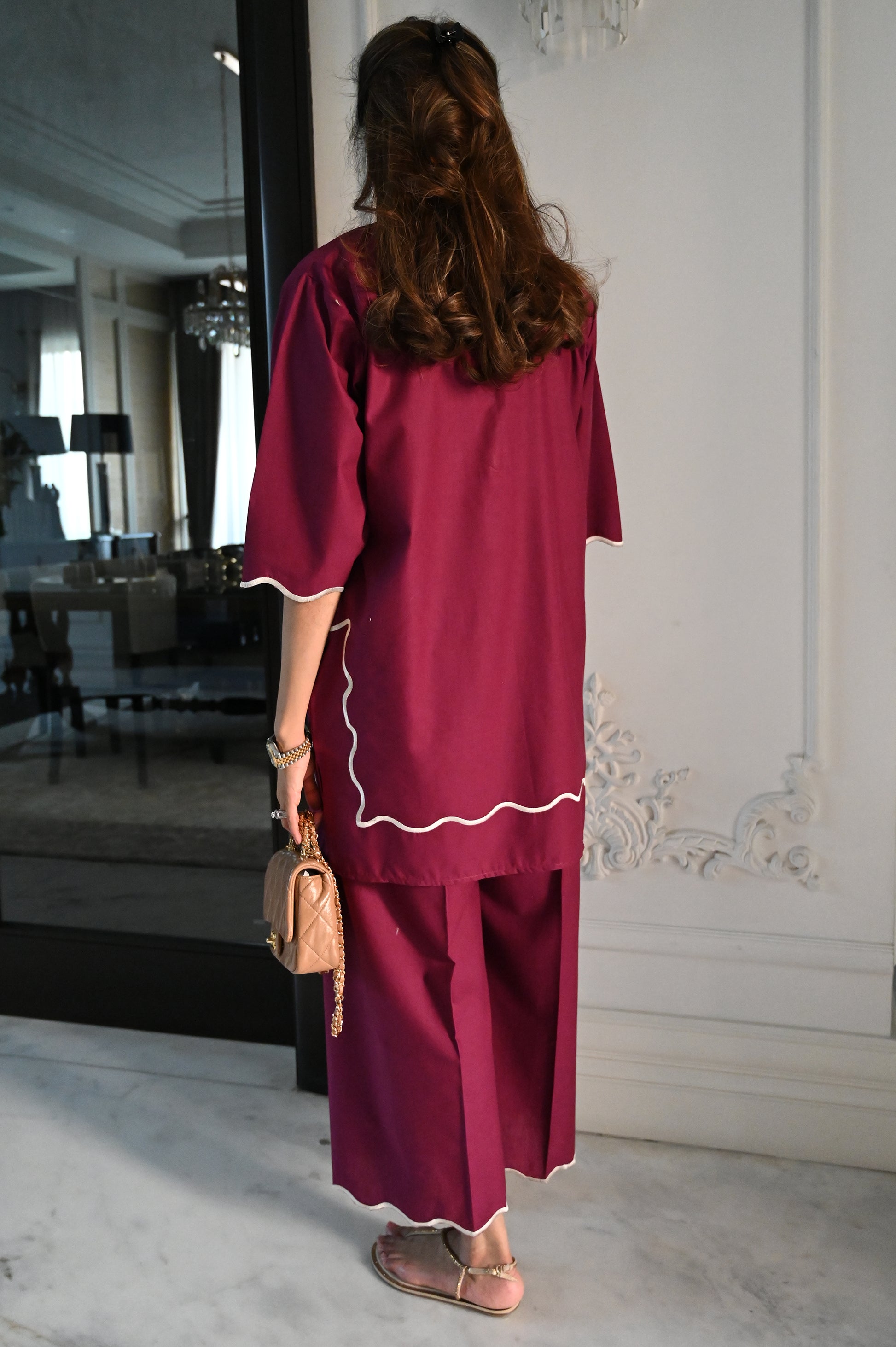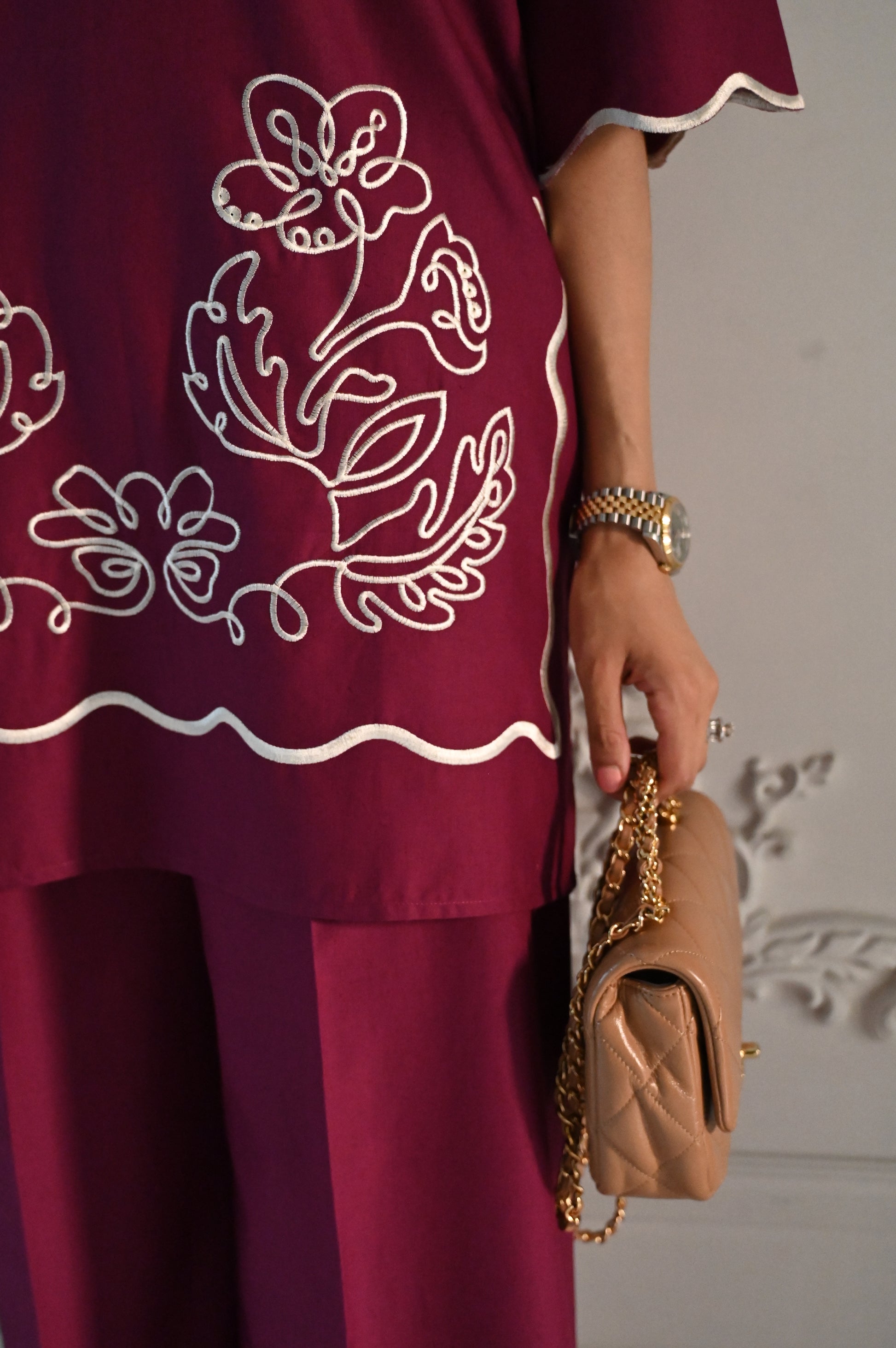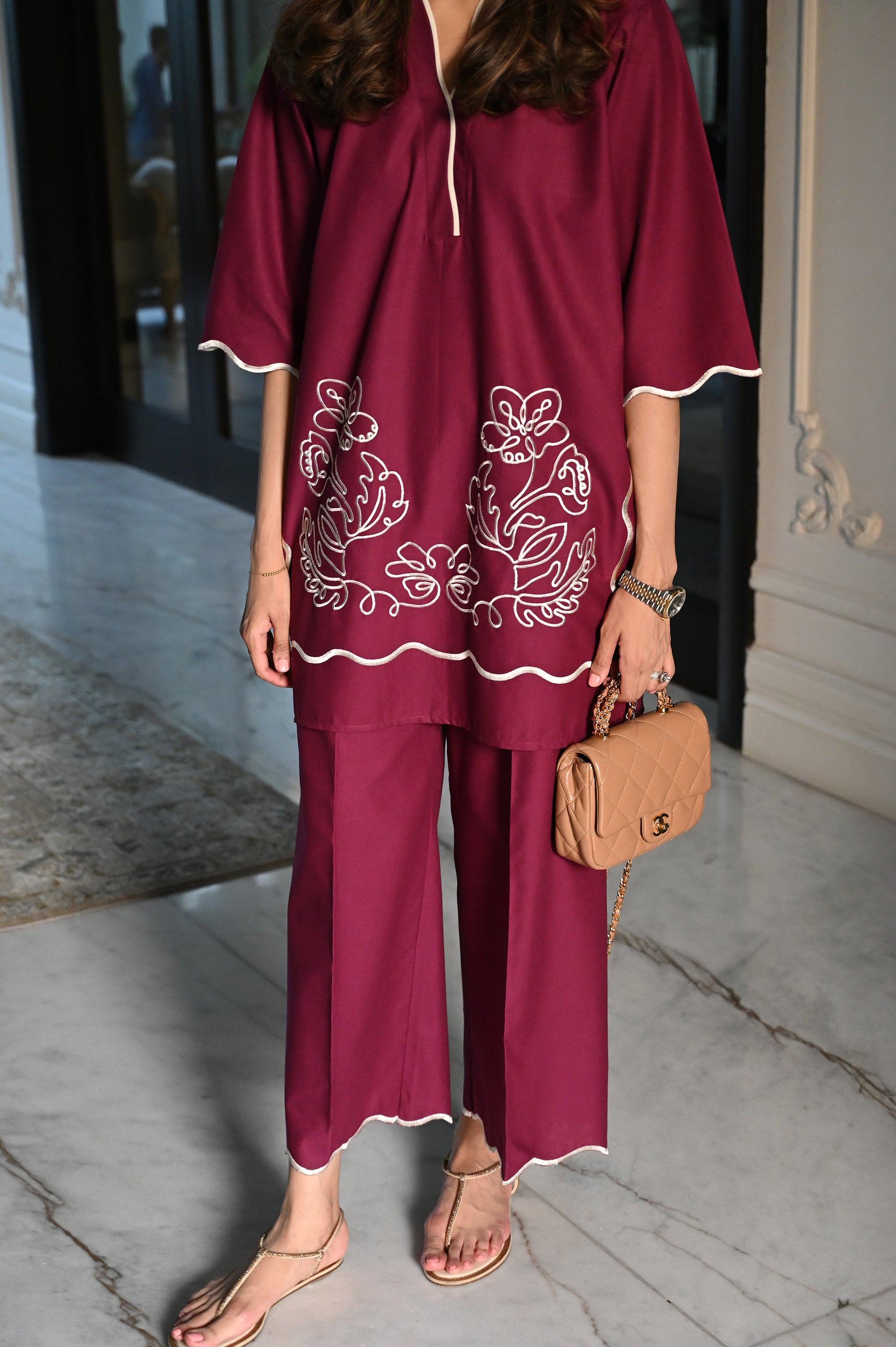 A plum two-piece ensemble featuring a straight kurta with white embroidered floral motifs and scalloped edging at the hem. The kurta has a subtle V-slit neckline with white piping for contrast. It is paired with wide-leg trousers finished with matching scalloped detailing, giving the outfit a modern yet elegant look.